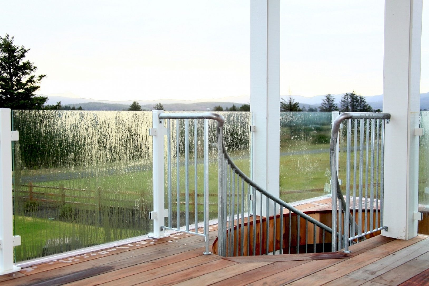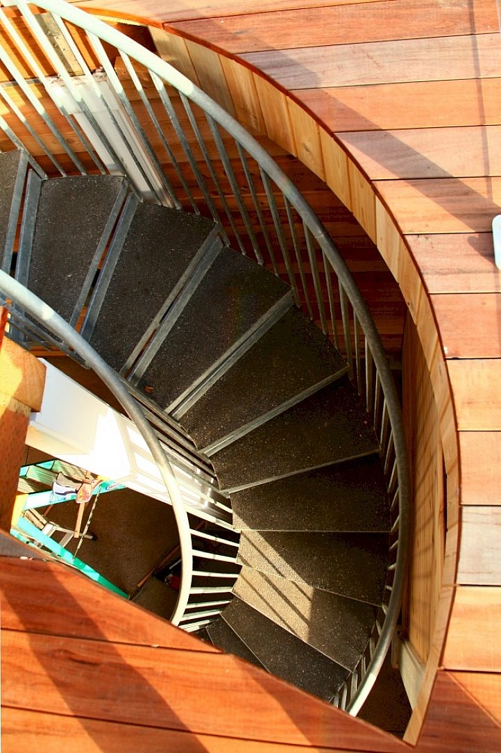 A galvanized spiral staircase was chosen due to exposure to the temperate coastal climate.