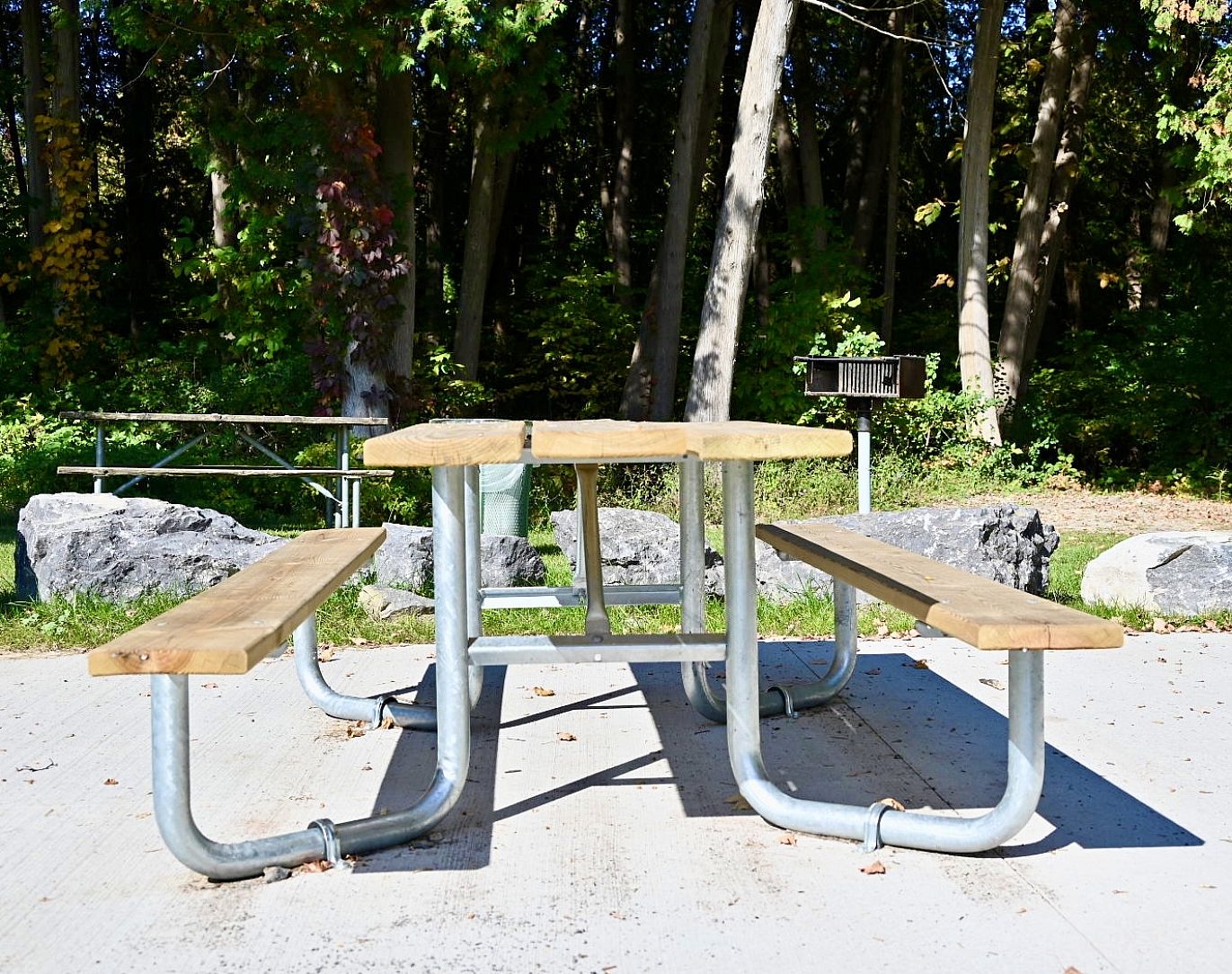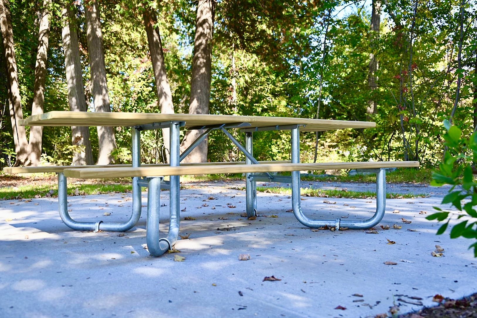 Each table consists of two galvanized table legs and bracing to create the base. With wooden tops to complete the table, many campers, hikers and families will enjoy a picnic or a rest while taking in the scenic views surrounding them. The Green Lake State Park in Fayetteville, NY is home to many new picnic tables after a renovation to the camping area this year.