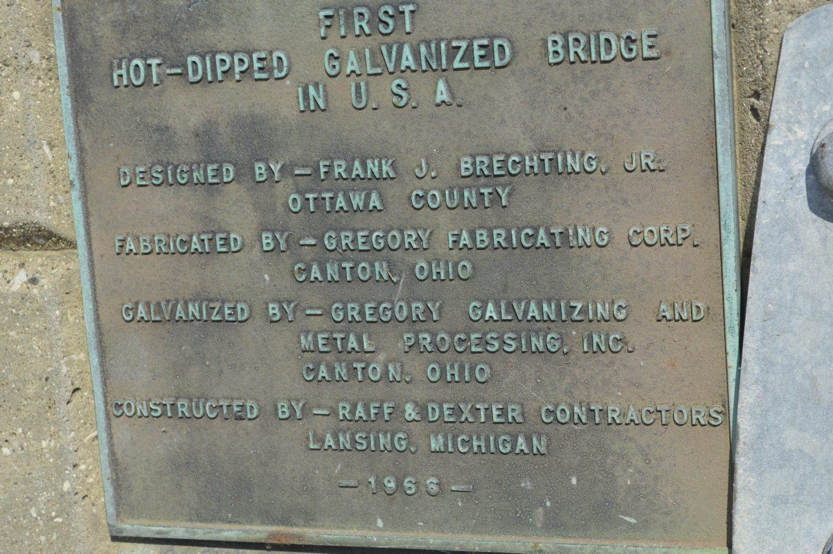 A plaque on the site commemorates this as the first fully hot-dip galvanized bridge in the United States. In 1966, then Ottawa County Engineer Frank Brechting, Jr. decided to "break the mold" and try hot-dip galvanized steel, not to make history, but simply because it was the most economical decision for the future.