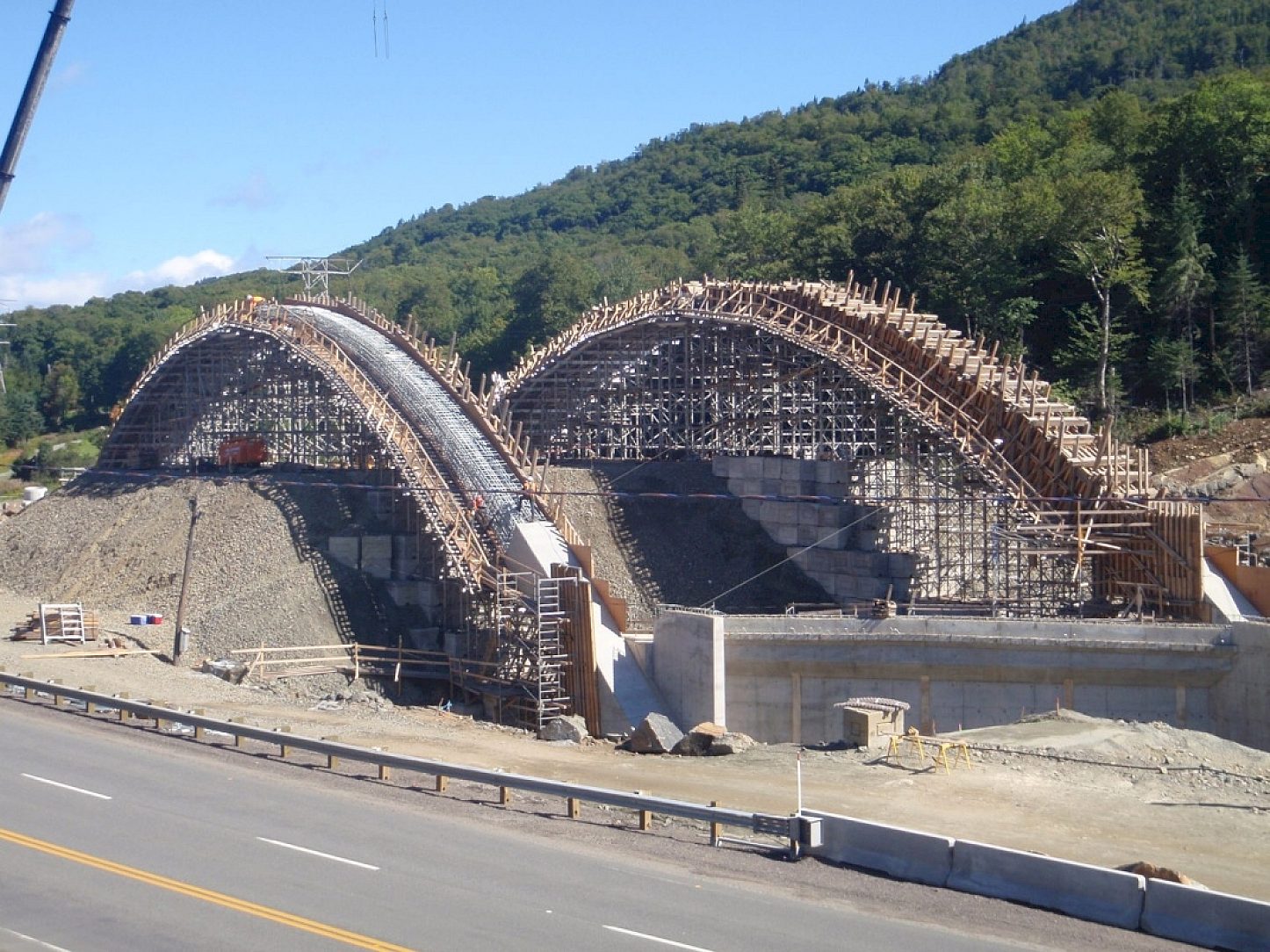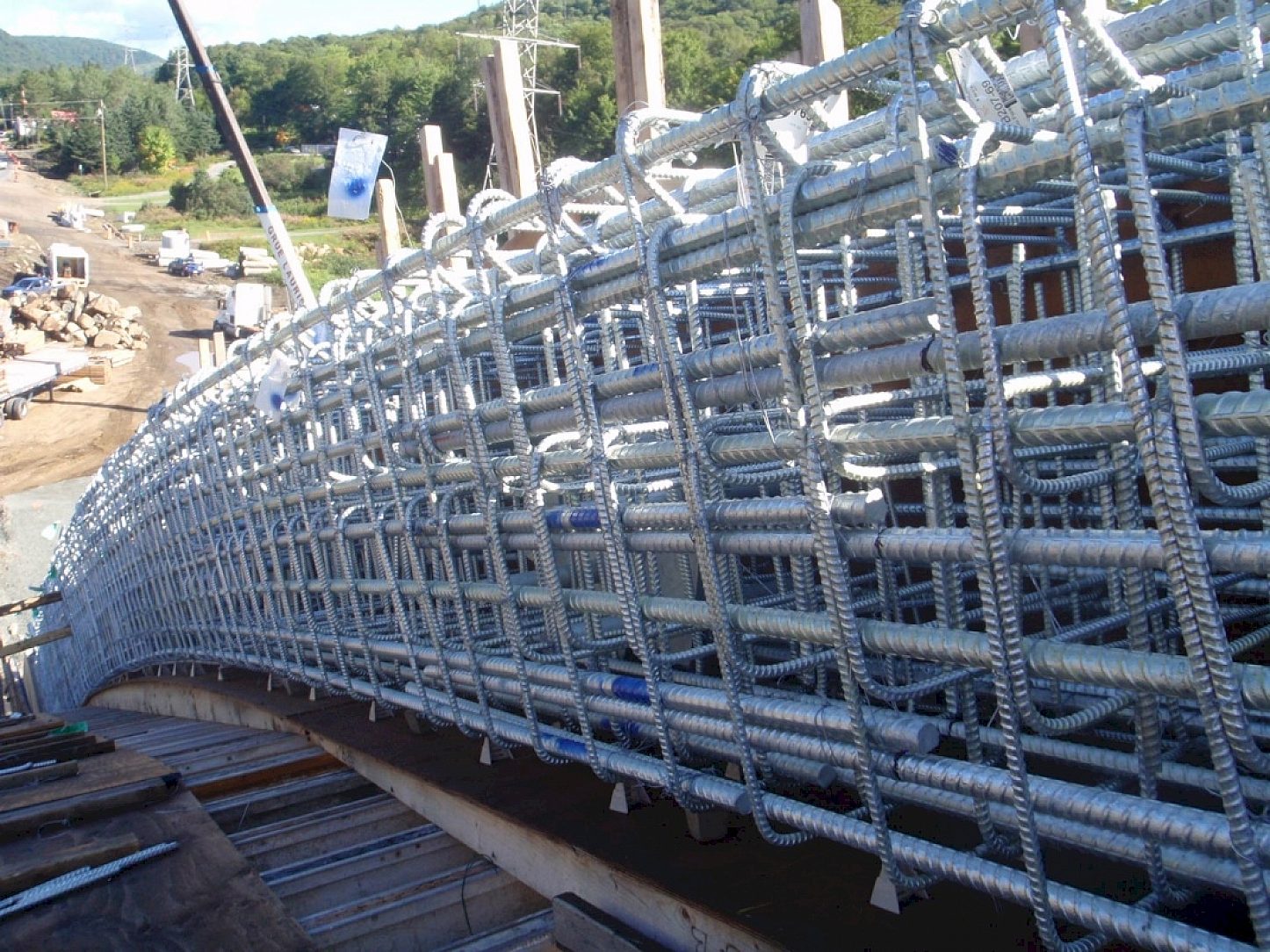 The arched bridge design, unusual for a highway overpass, was chosen primarily to overcome two problems; uneven and rocky field conditions, as well as the very obtuse angle at which the road passed over the highway, which did not fit well with typical overpass construction. Steel beams were chosen for the deck because of the lower weight as compared to concrete. These beams were also designed to be galvanized rather than metallized, again, for economic and performance reasons. As for the reinforcing steel, the choice of hot dip galvanizing was obvious since the concrete arches needed to be protected both structurally and aesthetically.