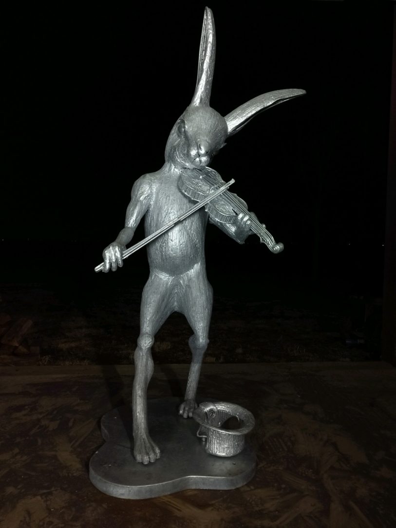 When asked what inspired Tim to create such a unique sculpture he said “My past steel sculptures have been animals and wildlife including a mountain lion, bald eagle, a buffalo with a running calf and even a caveman hunter. The rabbit explores a fantasy idea that invites interaction with the viewer. This might be in the form of a group picture or just playing in the rabbit band alongside of the violin.”