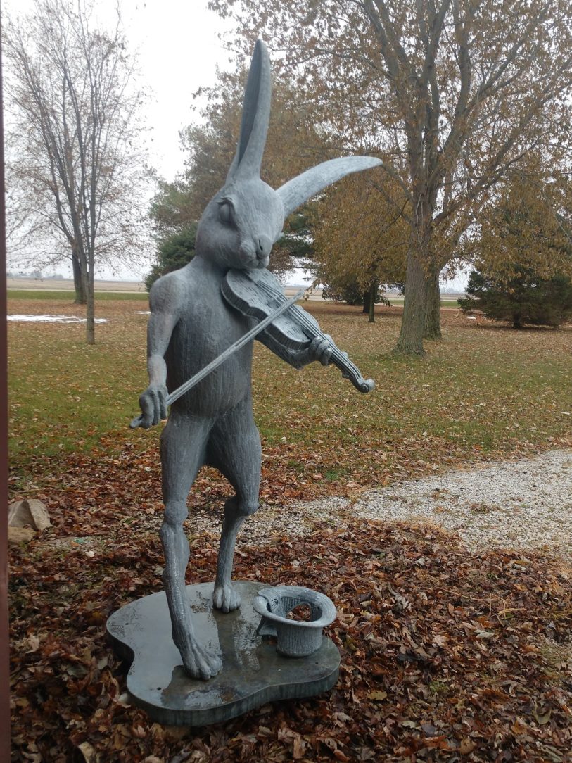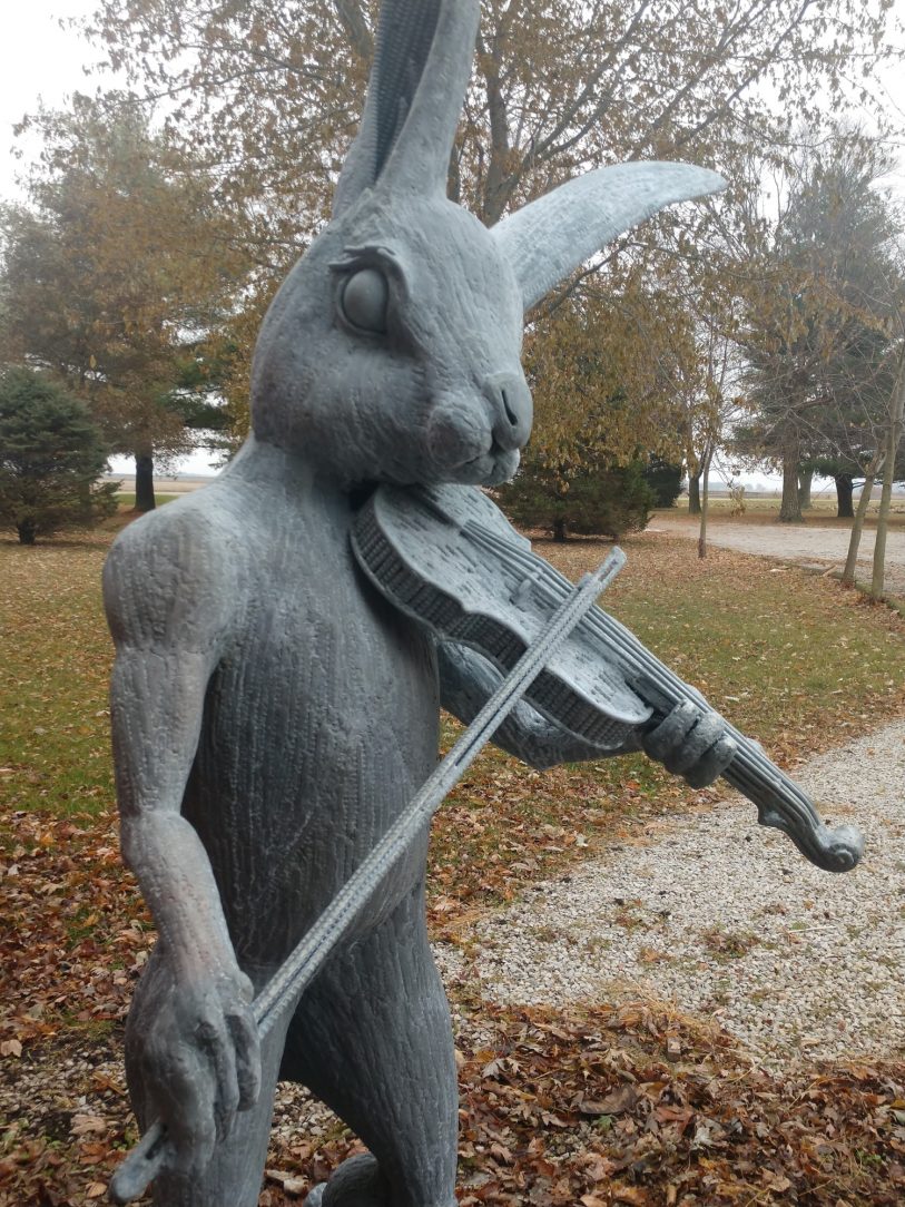 The rabbit explores a fantasy idea that invites interaction with the viewer. This might be in the form of a group picture or just playing in the rabbit band alongside of the violin.