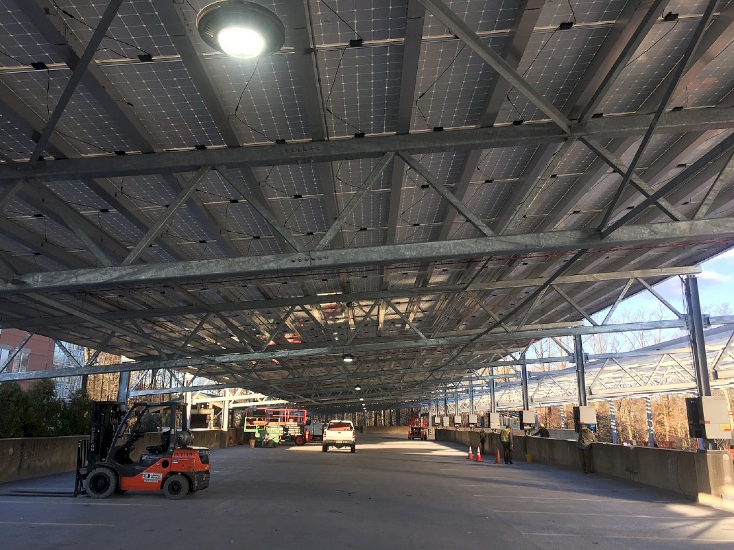 The owner Pfister Energy wanted corrosion protection that would last and be aesthetically pleasing for years to come. The main goal of this parking garage is to be a self sustaining structure with solar panels mounted on the top of the garage. The harsh seasons of the Mid-Atlantic played a big role in determining that hot dip galvanizing was the right spec. Comparing the costs of paint and the maintenance that it would take to keep up with a project of this size made it a no brainer.