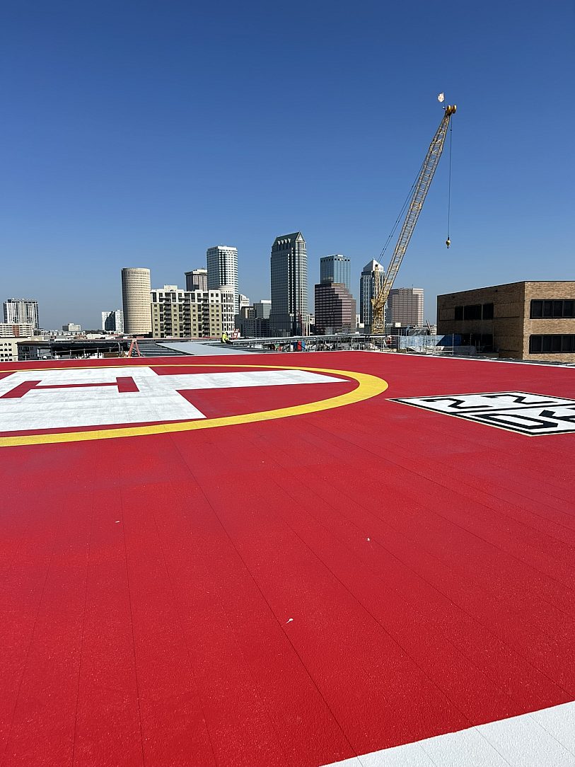 Tampa General partnered with FEC Heliports, a leading designer of custom helipads based in Cincinnati, Ohio, to create a solution that included two landing pads, one designed specifically for the U.S. Coast Guard’s large Jayhawk rescue helicopter. This dual-pad setup offers flexibility for various emergency operations while ensuring operational resilience.