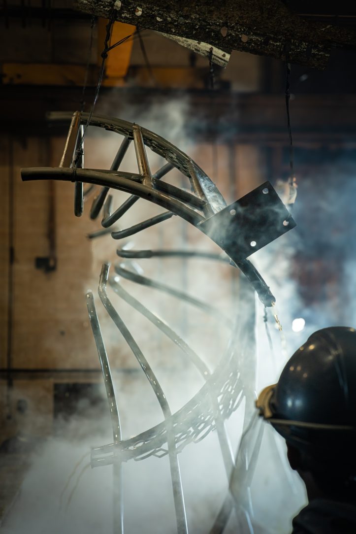 That challenge led to the choice of hot-dip galvanizing, a process that offered the only proven path to achieving the project’s two critical goals: permanence and purity of form. Hot-dip galvanizing protects every inch of steel, both inside and out. Unlike paint or powder coatings, which sit on the surface, galvanizing becomes one with the metal through a metallurgical bond of zinc-iron alloys. For a design made entirely from tubular steel, this was crucial. The molten zinc could seep into cavities and seams, sealing off hidden areas that might otherwise trap moisture or air. The process created a complete barrier and sacrificial protection system, meaning the zinc would corrode first, preserving the steel beneath for generations. But longevity was only half the story.
