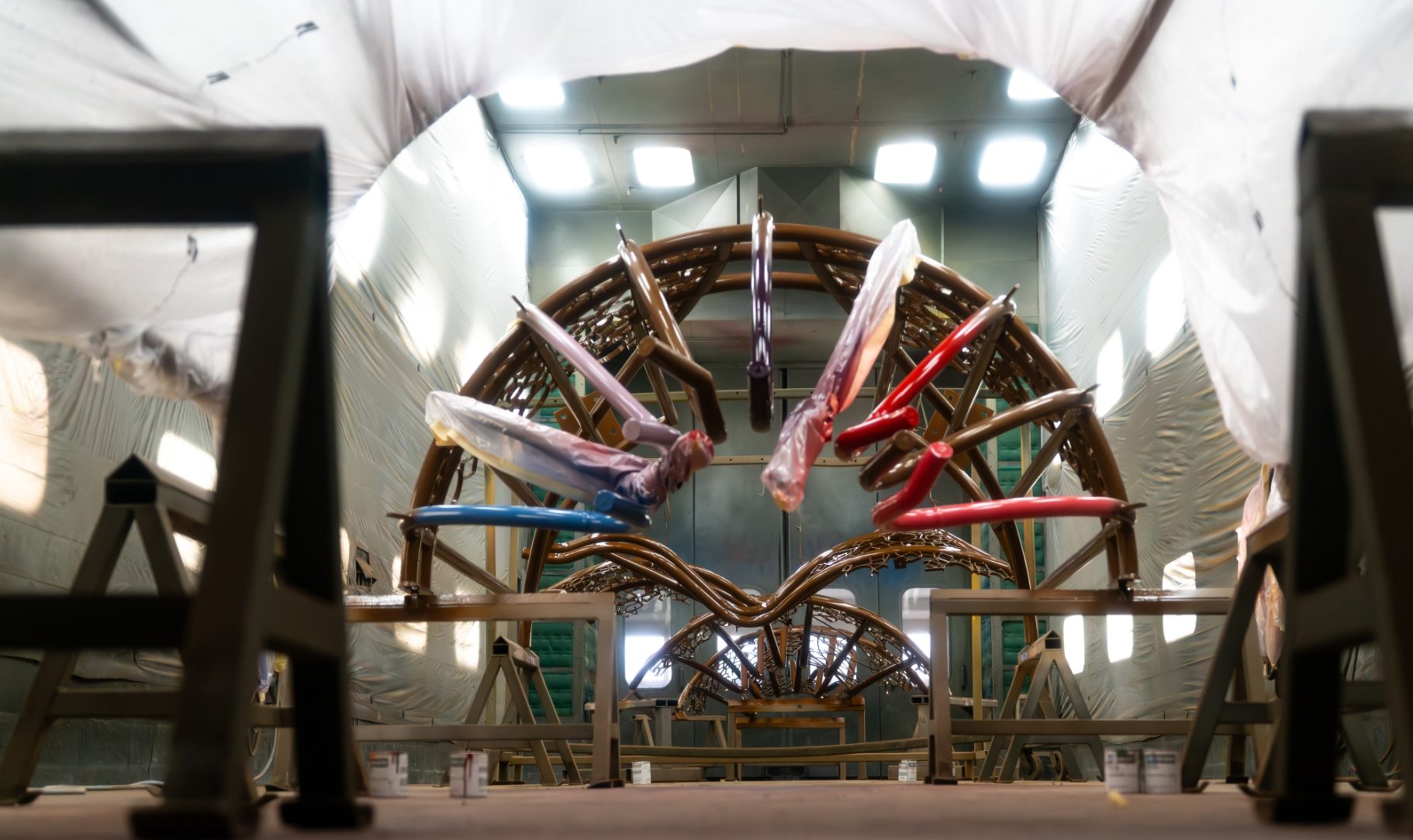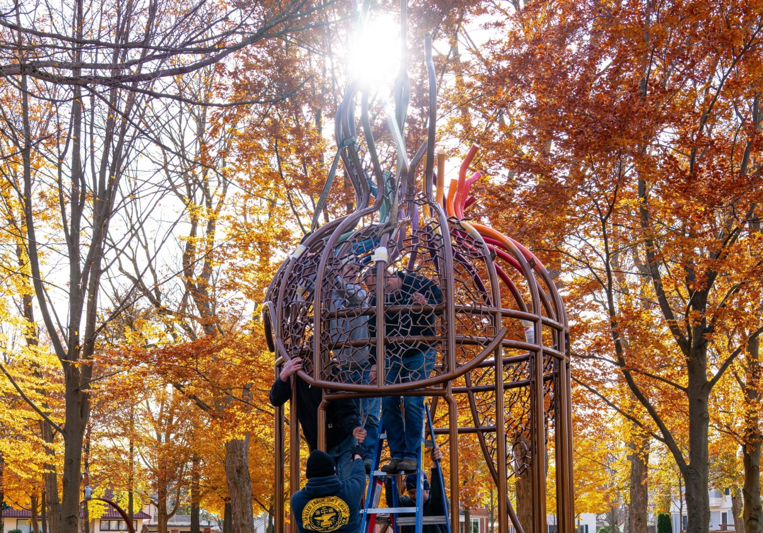 The cage suggests the social and professional constraints surrounding Carlyle’s life as a woman artist; the corset form tightens those expectations around the body; the bird that rises above a torn-open “skylight” speaks to her determination to live and work beyond them. Curved steel ribs trace the shape of a corset set atop the bird cage, its crown twisted open as a bird rises through the opening. Each bend of tubular steel echoes the soft arcs of her brushstrokes, creating a walk-in interior that invites viewers to stand inside the tension between confinement and liberation: a work meant not only to be seen, but to be experienced. Transforming this concept into a lasting public installation demanded not only creativity, but engineering precision.