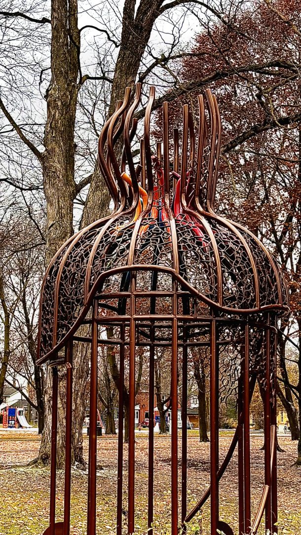 The Birdcage Sculpture represents the rebirth of Florence Carlyle’s legacy through modern materials and technique. Designed and fabricated from tubular steel, the structure demanded a protective system that would defend against corrosion from every angle while maintaining a flawless surface for its intricate curves. The artist’s goal was to blend Woodstock’s industrial strength with its creative heritage, crafting a symbol of unity between art and science. The public placement in an open pedestrian zone required a finish capable of enduring continuous exposure without fading, rusting, or requiring maintenance, a challenge met perfectly through hot-dip galvanizing.