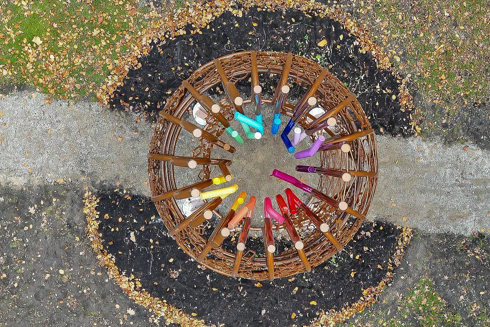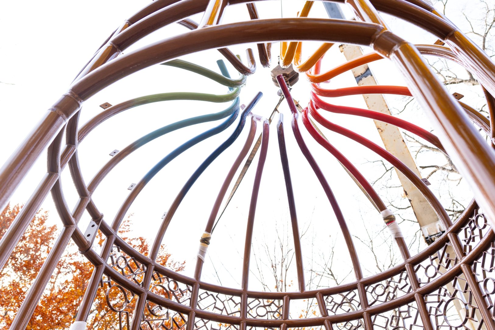 The sculpture has a quiet bronze shimmer at first glance, reading almost as a simple cage, but it truly comes to life when someone steps inside and looks up to the sky. From within, the feeling of confinement softens into a sense of openness as bands of colour arc overhead, suggesting that inside each of us is a vivid inner life and a desire to live and be seen as our truest self. The palette expresses the full spectrum of colour in both a symbolic and figurative way; bright bands wrap the form and stand out against the open sky, creating a living surface that shifts with the daylight. The result is a gentle play of reflection and hue that nods to Florence Carlyle’s impressionist influence and painterly style.