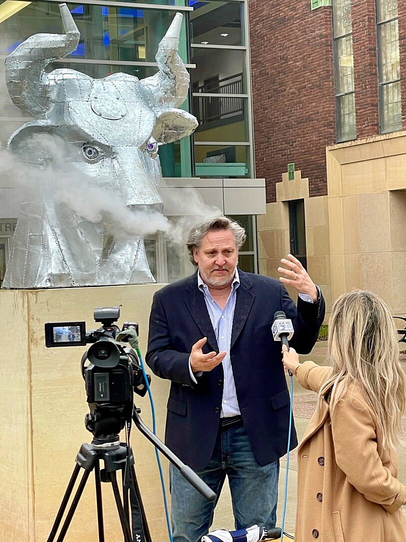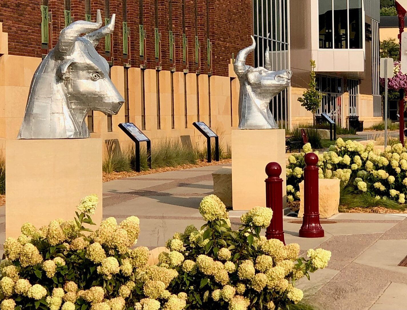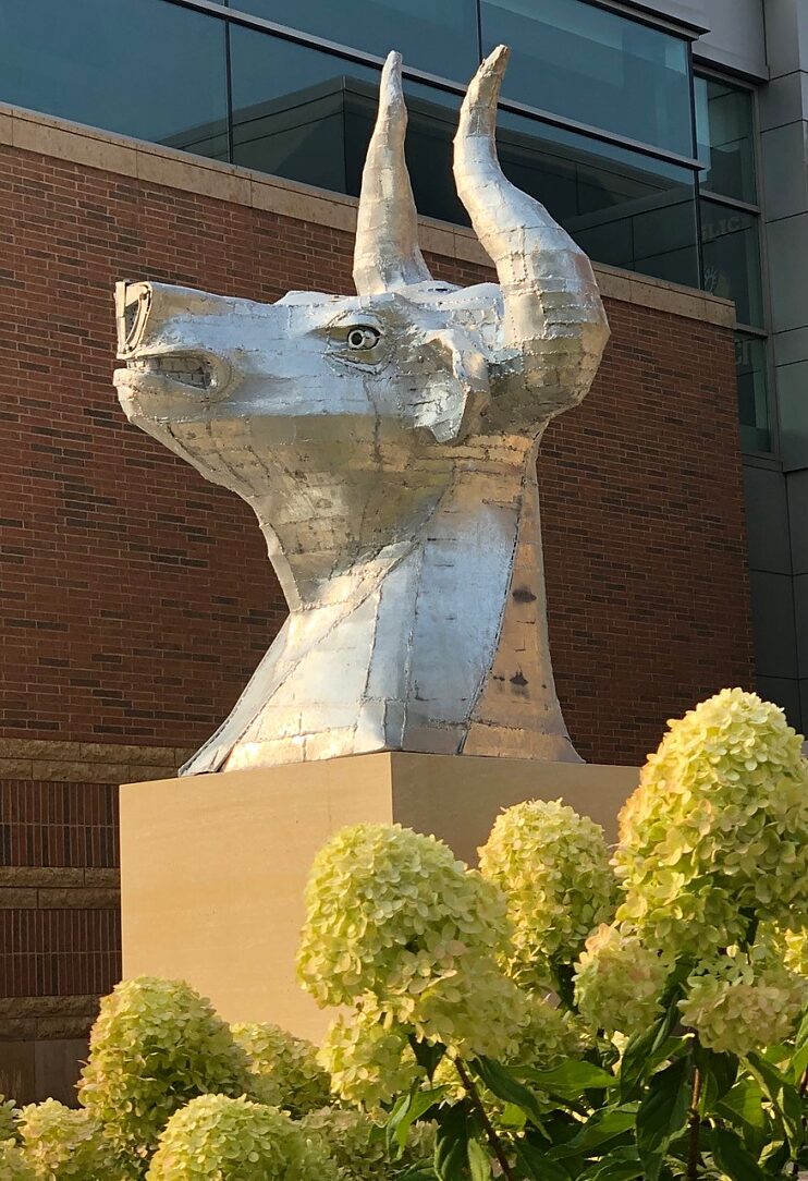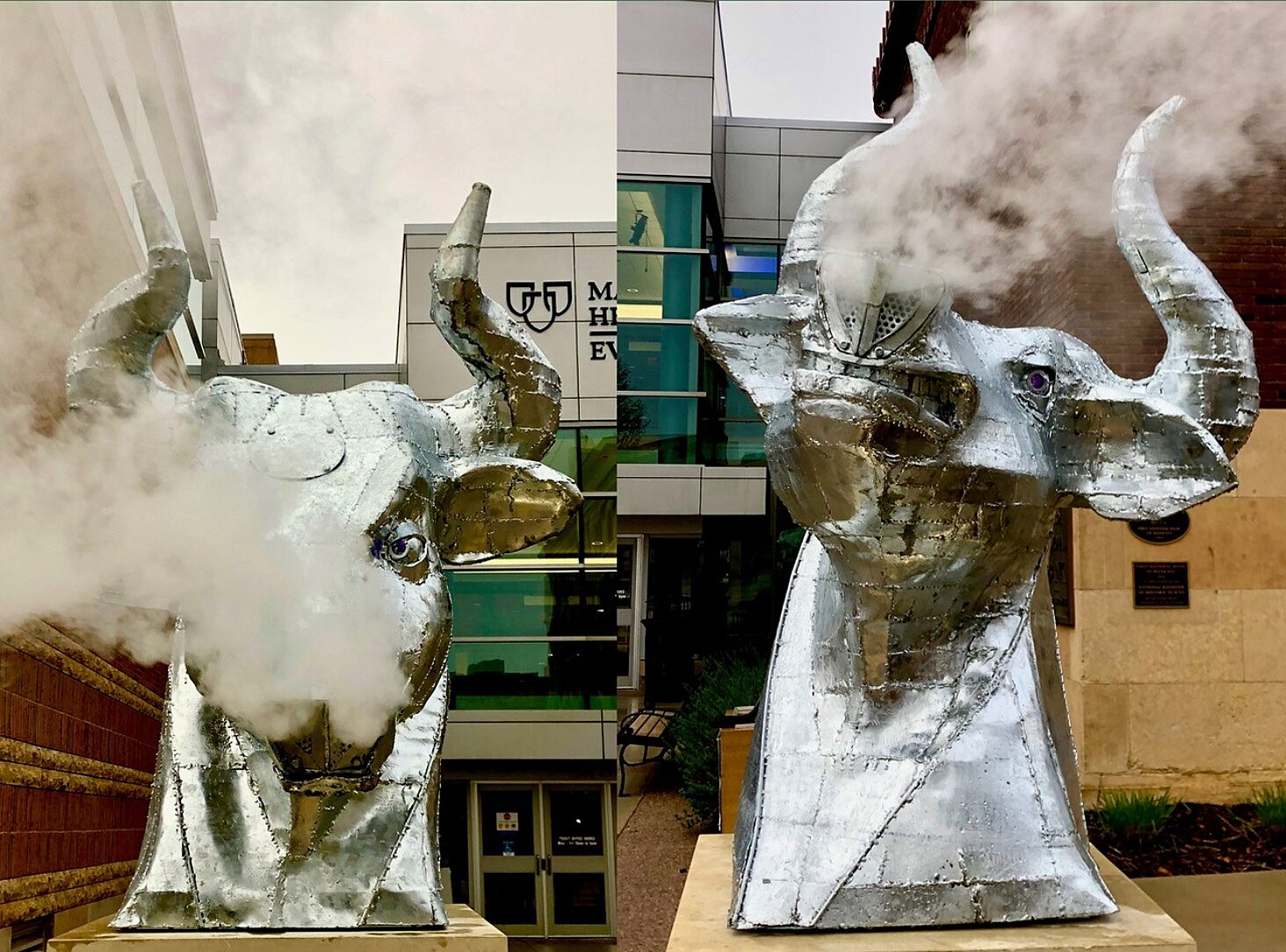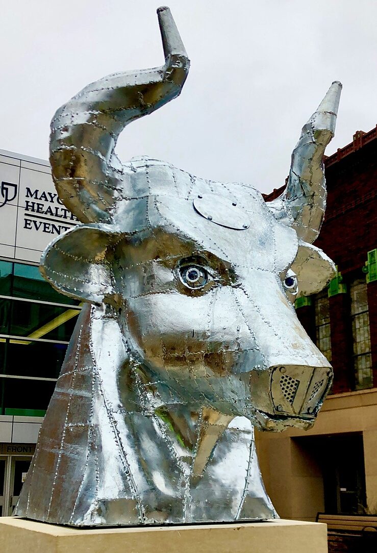 Artist Kyle Fokken was approached about an idea to have 2 bulls heads on display in front of the Mayo Clinic Health Systems Event Center which would greet hockey fans when they attended the Mankato State Maverick's hockey games. The donors did not just want a couple of heads, they wanted a fan experience when they came to the games. Kyle ran with their idea by designing 2 heads that when turned on the eyes come to life with an LED lighting system and fog rolls out of the nostrils through a tube system that can be hooked up to a fog machine greeting fans as they attend the games.