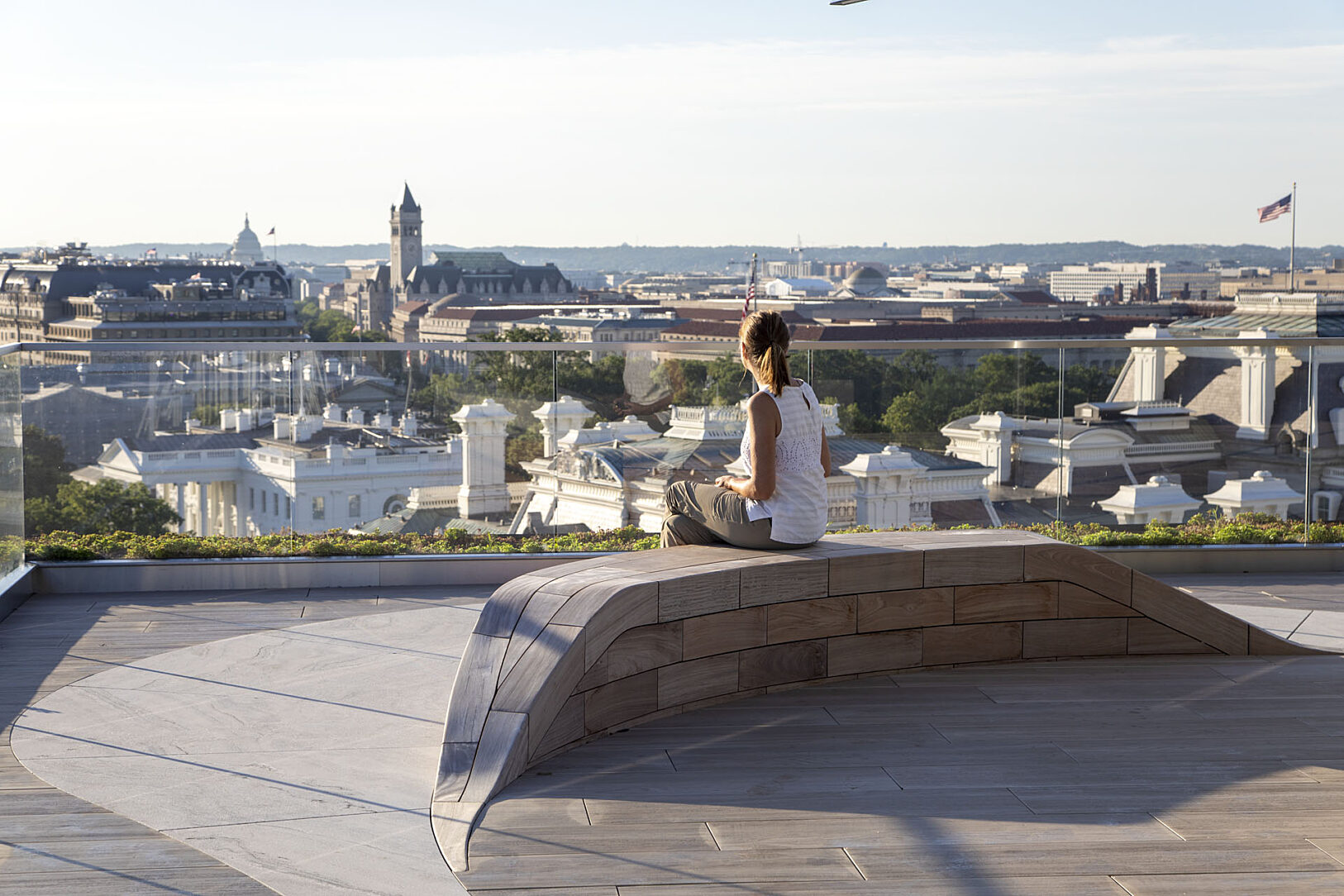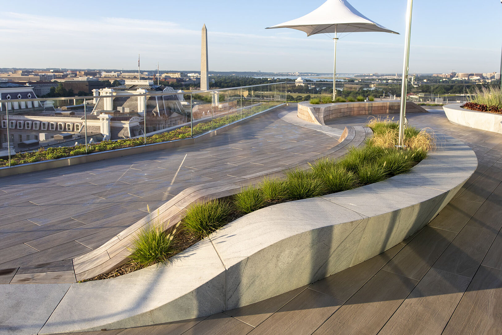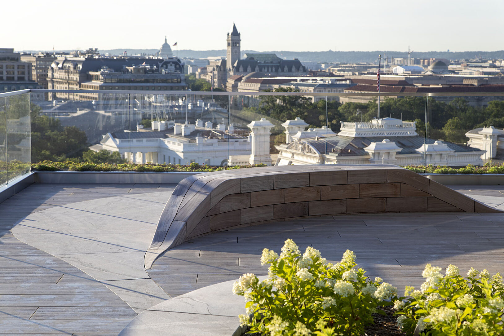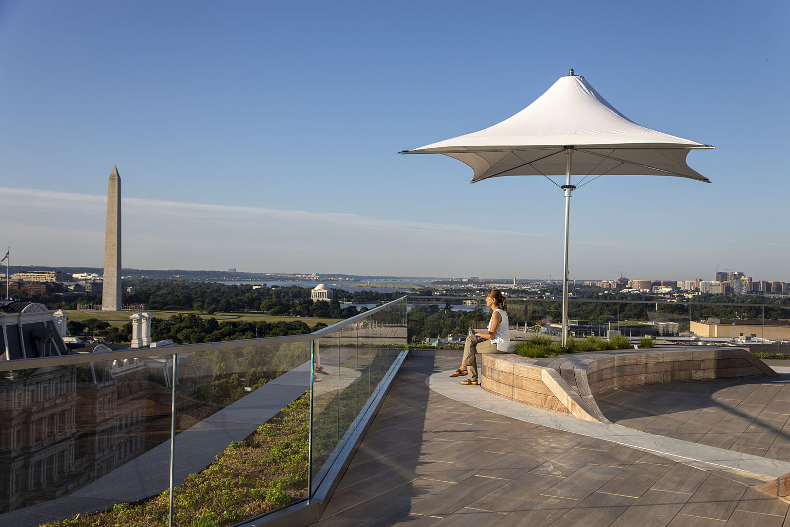 Built in 1966, The 1700 Pennsylvania Avenue, NW is one of the capital city’s first premiere full service commercial office properties located in the Central Business District sub market. Just steps from the White House, the Mills Building is a 165,724 square foot mixed-use building offering Class A Office space and ground floor retail. The 1700 Pennsylvania Avenue’s landscaped rooftop terrace takes luxury to new heights, with 5,500 square feet of indoor-outdoor space towering above unparalleled views of DC. Clients enjoy exclusive access to this space and the opportunity to host meetings, corporate gatherings, and social events all year long utilizing the hot-dip galvanized steel frames benches wrapped in teak wood.