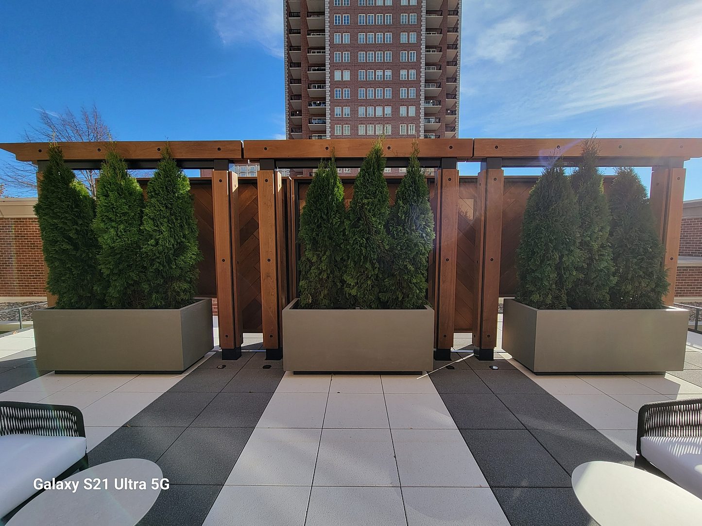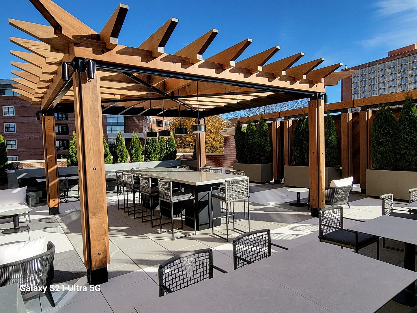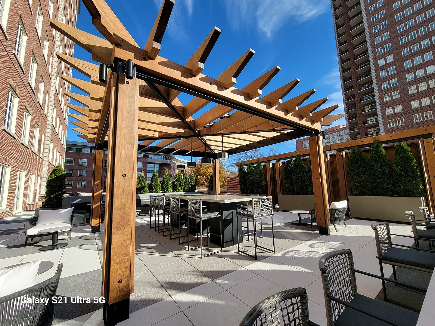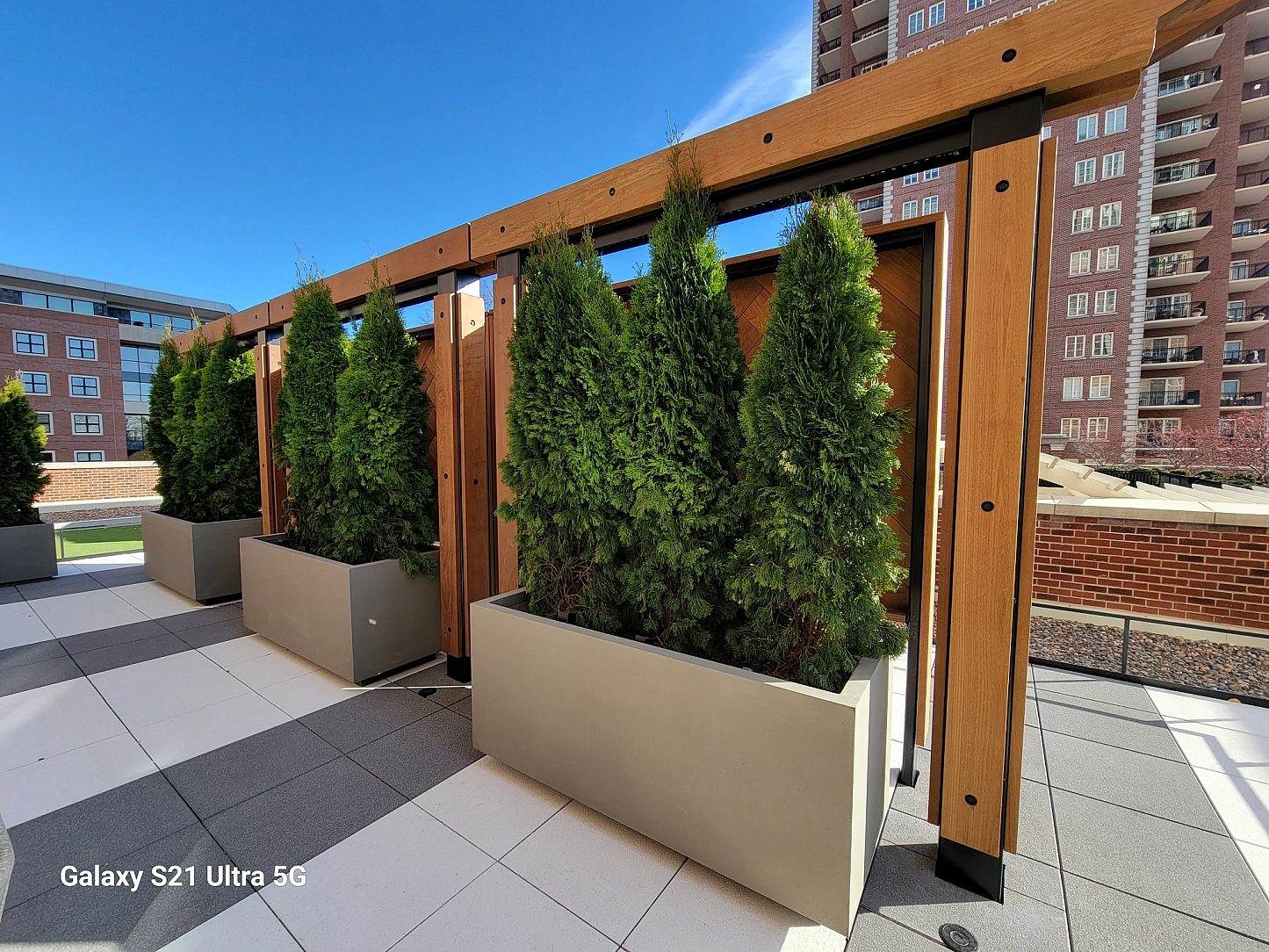 This pergola and screen wall project serves as a prominent feature in the renovation of the fifth and sixth floor amenity roof deck at "The Plaza in Clayton" in Downtown Clayton, Missouri. The Plaza is notably one of the most successful mixed-use developments ever to have been constructed in Clayton. The development includes the prestigious Ritz Carlton and neighbors some of the finest dining and retail in the city.