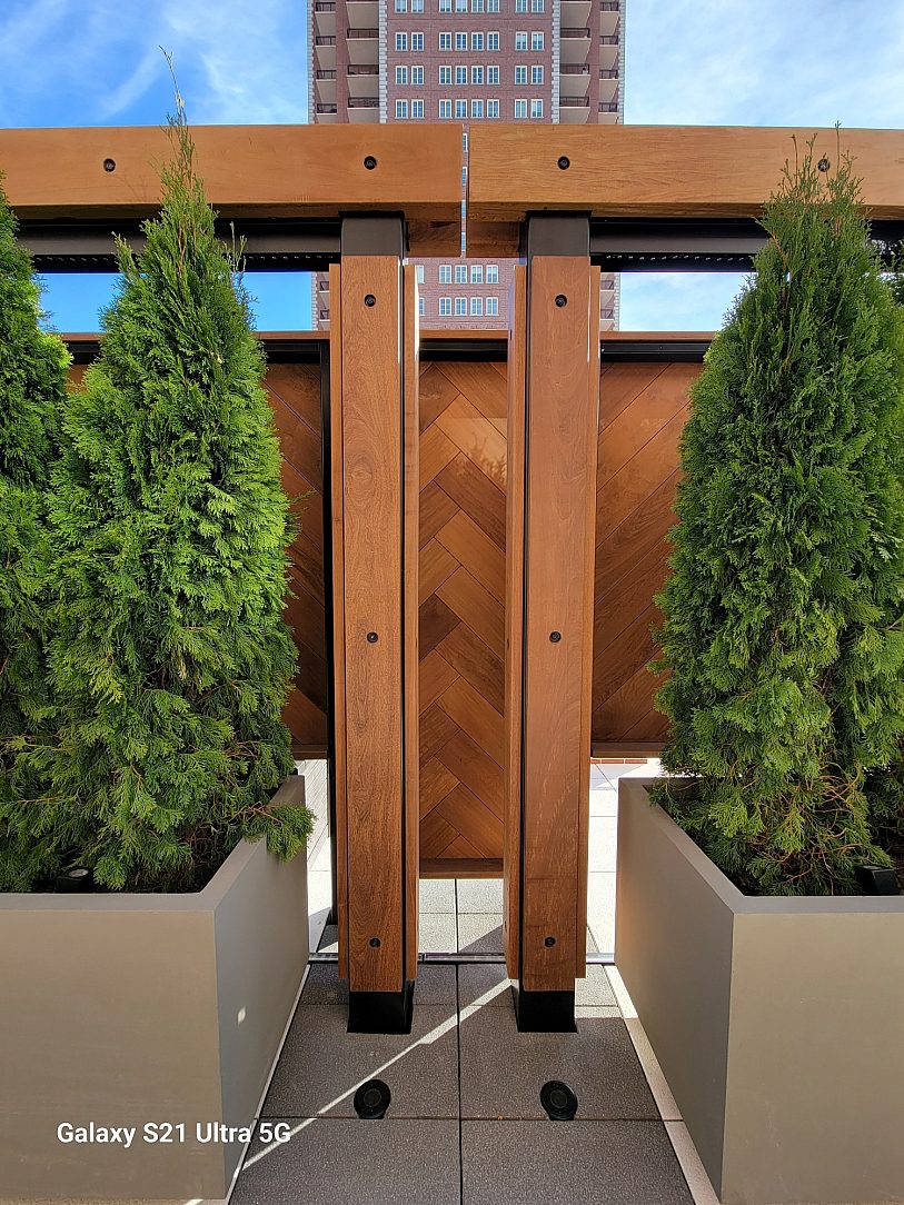 Designed to augment the already inviting atmosphere of the outdoor amenity deck, the pergola and screen walls constitute a stunning duplex system. Comprising a hot-dip galvanized substructure with a black paint topcoat, the steel is elegantly wrapped in IPE Wood, with added lighting features for aesthetic appeal. The design, though simple, effectively captures the intended natural and urban ambiance.