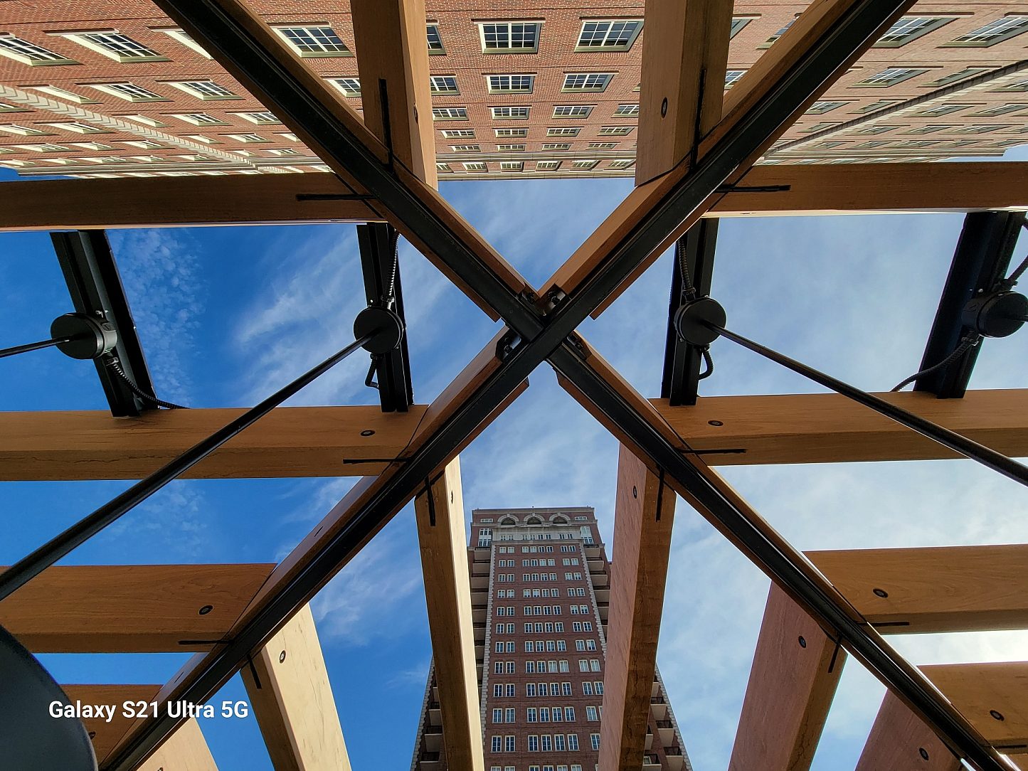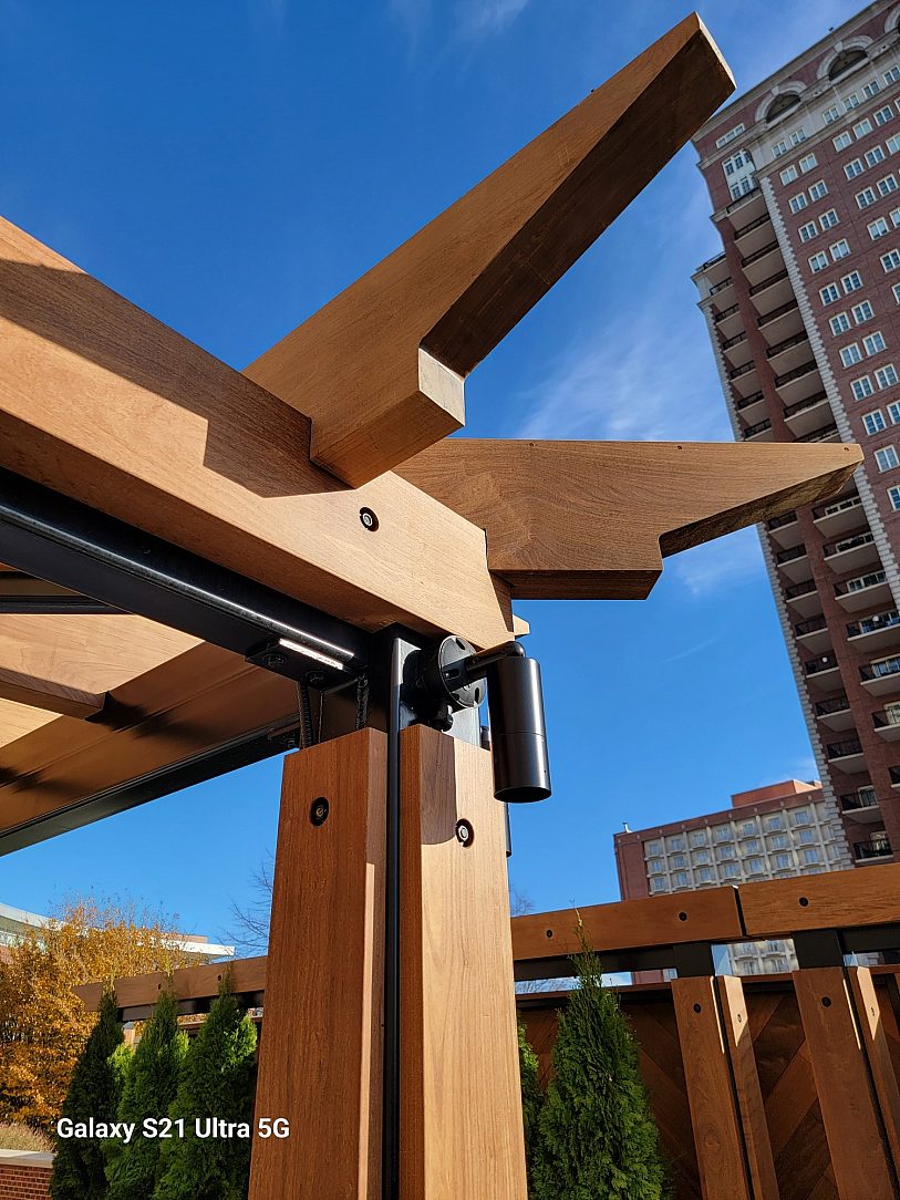The pergola, situated on the sixth floor of The Plaza, functions as a recreational sitting area for the socially active tenants. The substructure, composed of 8” x 8” tubing standing 10” high at all corners and connected with cross trusses, is covered with Brazilian hardwood. The sitting area is complemented by a 3” thick IPE wood providing shade on hot St. Louis days. Meanwhile, the screen wall on the fifth Floor ensures privacy for the open amenity area from adjacent office buildings and parking garages. Constructed with 6” x 2” Steel Tubing, the structures are stacked for an attractive layered look.