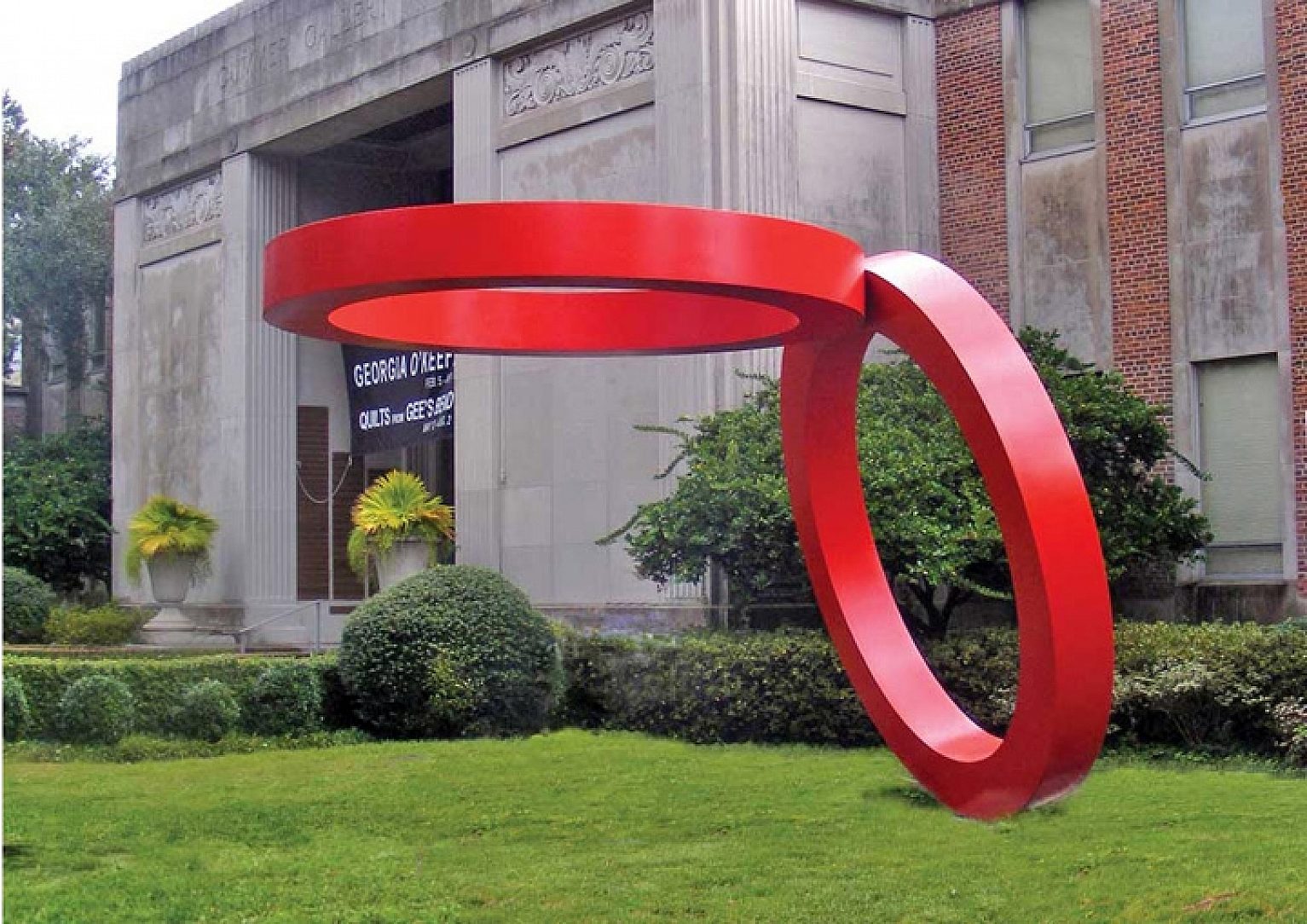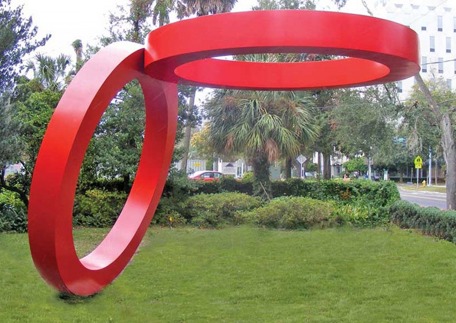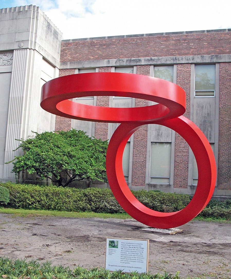 Admired on a daily basis, The Sea of the Ear-Rings sculpture stands proudly outside the front door of Northeast Floridas largest art museum. This creation was artfully sculpted by Japanese-American artist Takashi Soga. A shining red duplex system was used in order to protect the rings from the highly-corrosive environment of Florida. Galvanizing was the perfect antidote for high humidity, high ultra-violet rays, wind, sand, coastal salt and fog. The rings have an exceptionally smooth finish that exceeded the artists expectations. These smooth rings are moved up and down slowly by the wind and a counter weight. This feature creates the illusion of a free floating top ring.