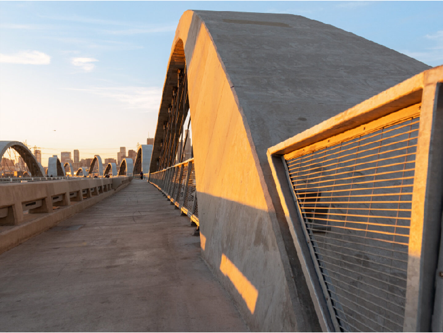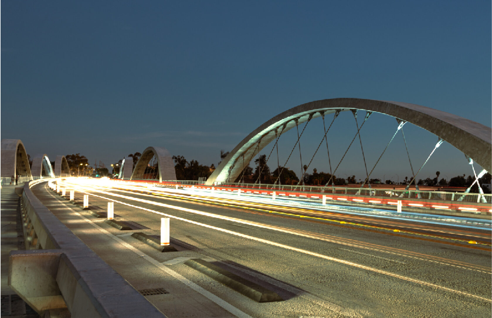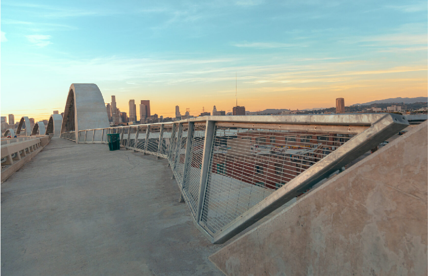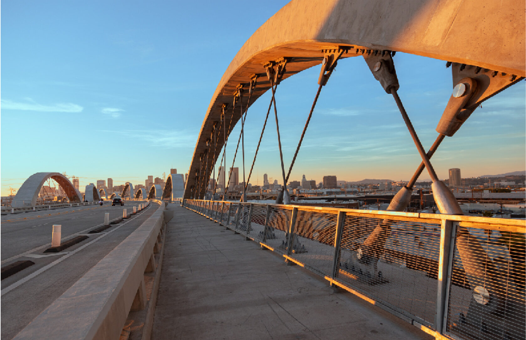 The Sixth Street Bridge (aka the Sixth Street Viaduct) is a replacement viaduct bridge made of hot-dip galvanized steel, reinforced concrete, and structural cabling. The bridge spans two-thirds of a mile over intersecting freeways, multiple railroad tracks, numerous secondary local streets, and the Los Angeles River, connecting the historic Boyle Heights neighborhood with the trendy and eclectic downtown Arts District. At its time of construction in 1932, the original bridge was the longest in Los Angeles and a landmark setting featured in dozens of movies and television shows over the years. The replacement bridge officially opened for public use on July 10, 2022. Although it is in the exact same location as the original, it now incorporates the stringent up-to-date seismic requirements and modern safety features required by the State of California.