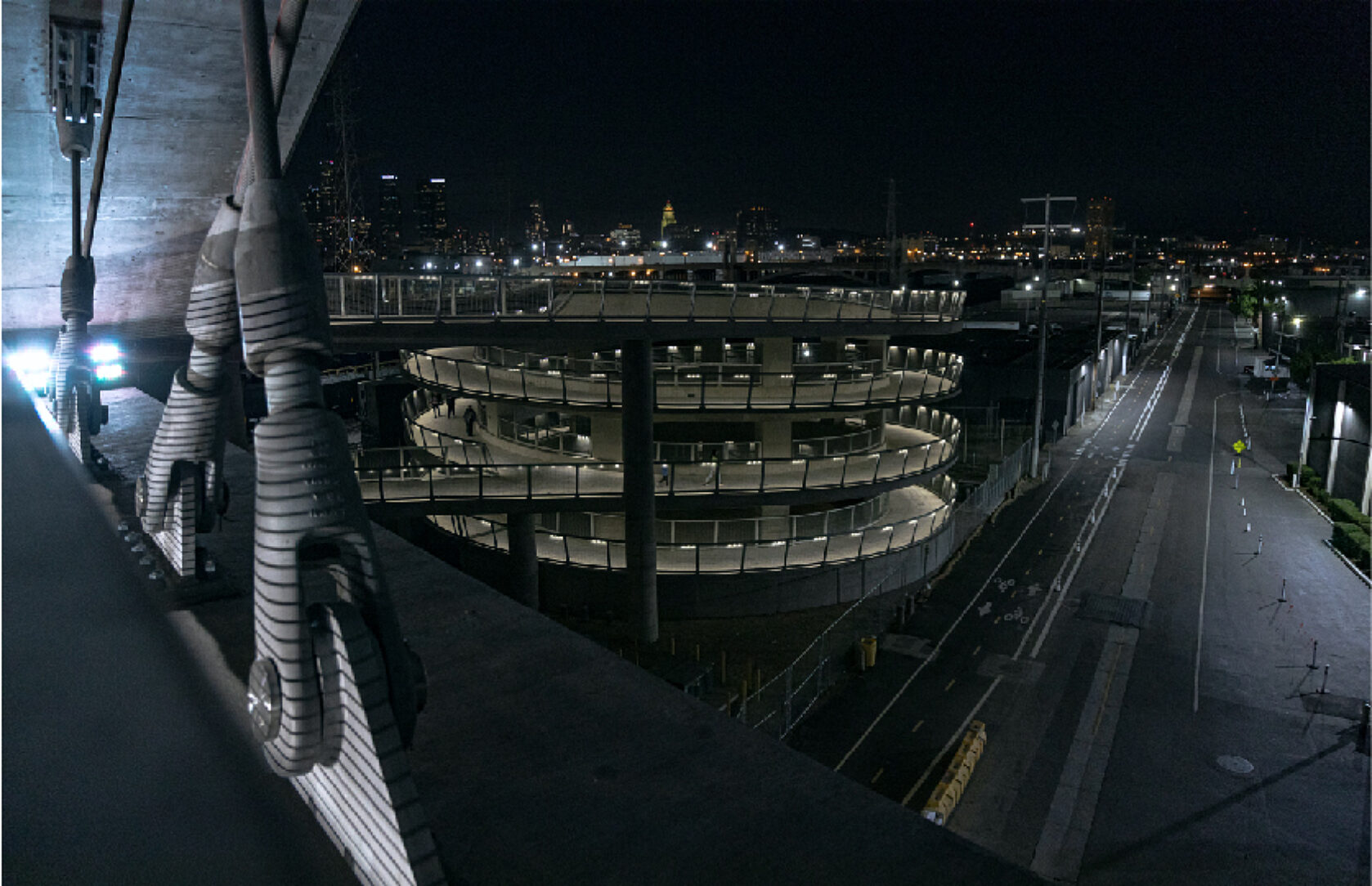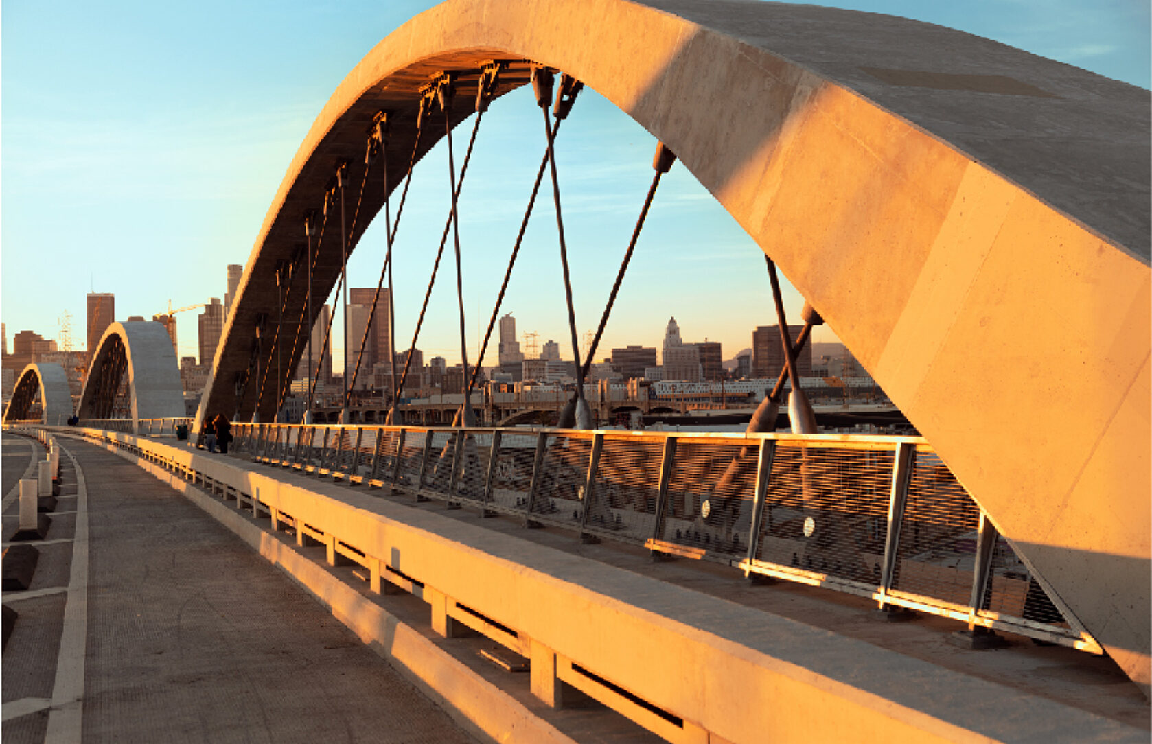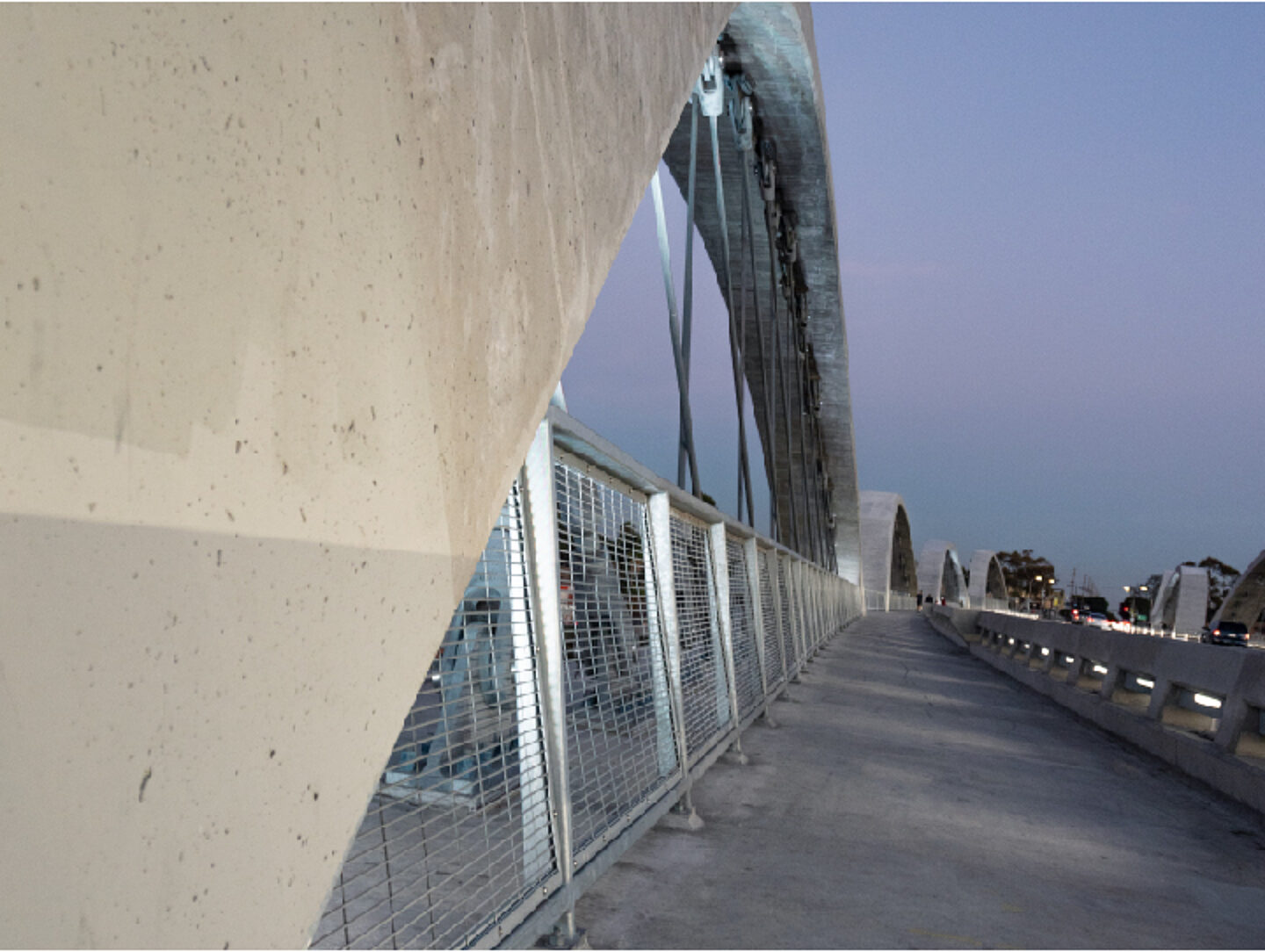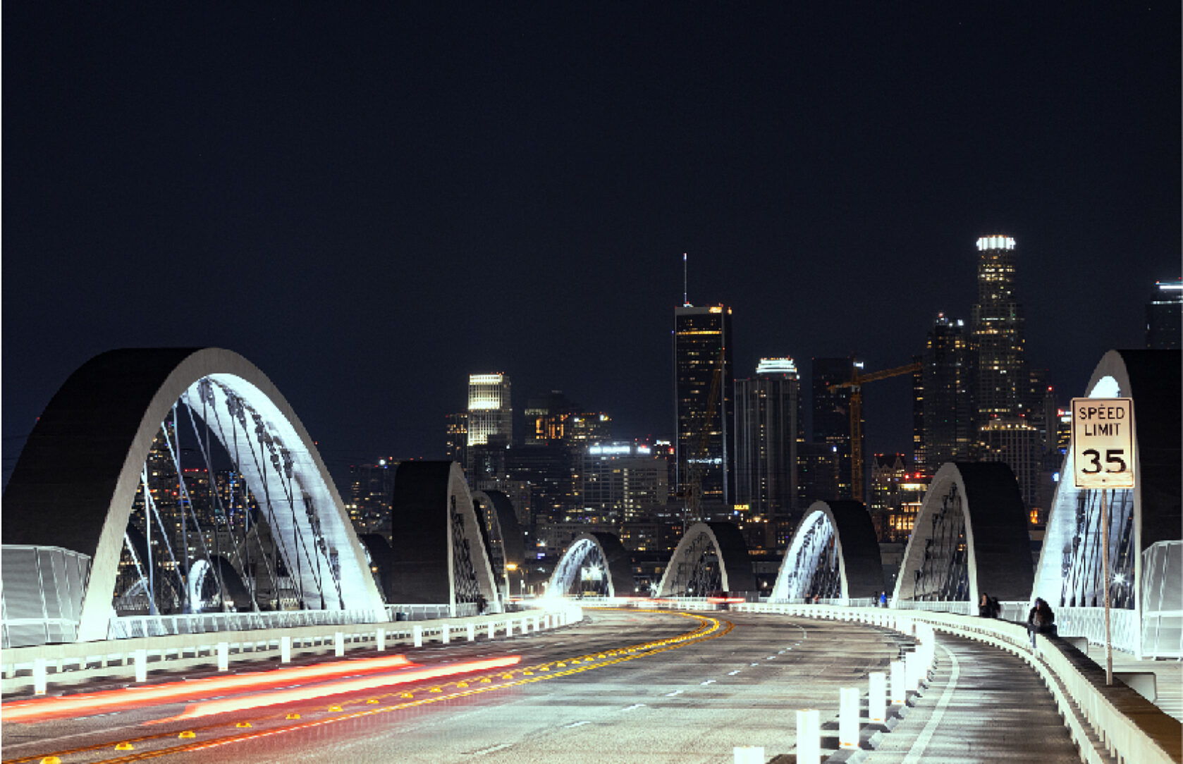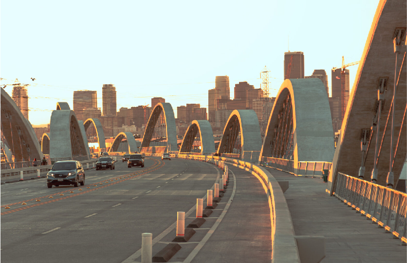 The Sixth Street Bridge (aka the Sixth Street Viaduct) is a replacement viaduct bridge made of hot-dip galvanized steel, reinforced concrete, and structural cabling. The bridge spans two-thirds of a mile over intersecting freeways, multiple railroad tracks, numerous secondary local streets, and the Los Angeles River, connecting the historic Boyle Heights neighborhood with the trendy and eclectic downtown Arts District. At its time of construction in 1932, the original bridge was the longest in Los Angeles and a landmark setting featured in dozens of movies and television shows over the years. The replacement bridge officially opened for public use on July 10, 2022. Although it is in the exact same location as the original, it now incorporates the stringent up-to-date seismic requirements and modern safety features required by the State of California.