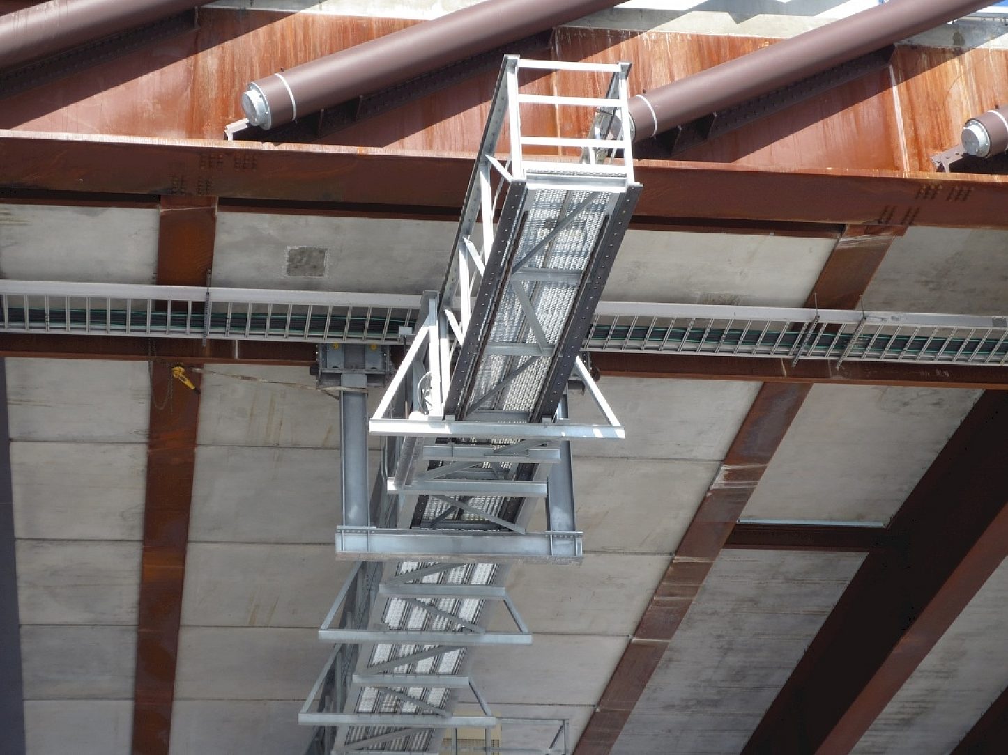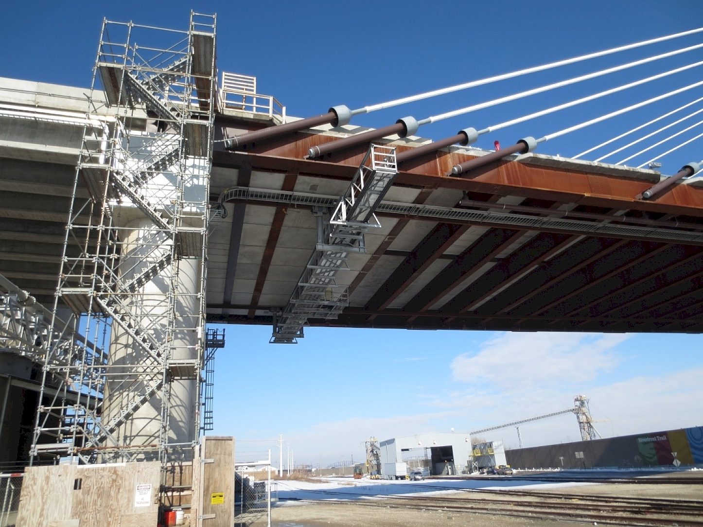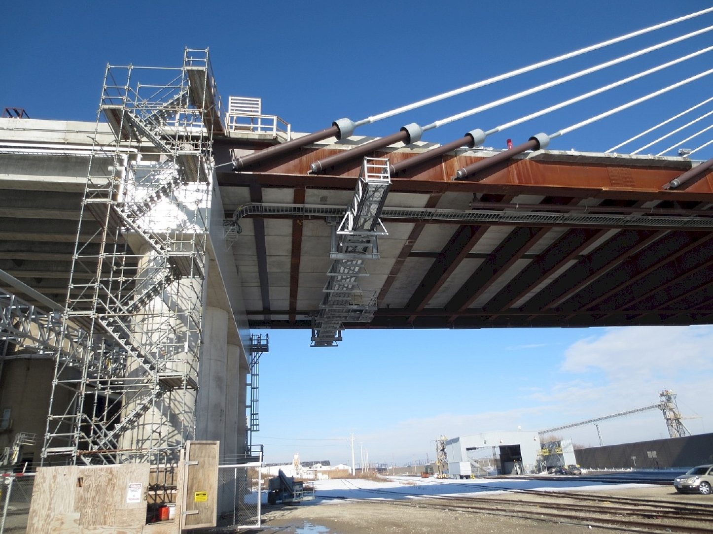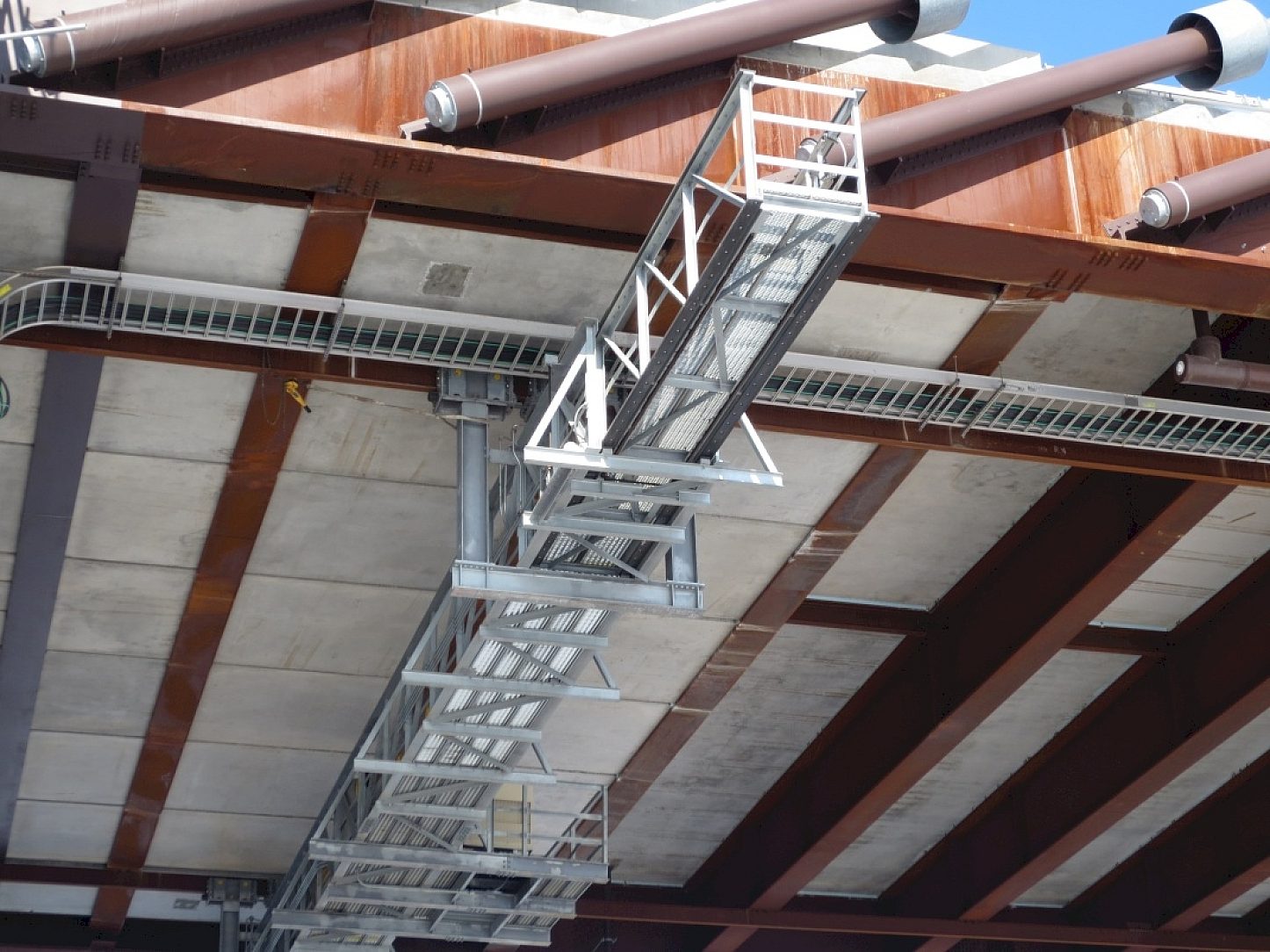 This first of its kind platform spans 1500 feet between two column piers. It is permanently affixed to the structure and includes expandable arms. The arms retract when not in use but extend to the entire width of the structure to provide a walkway for safe accessibility. The unit is designed to move vertically and horizontally so each part of the structure can be easily accessed.