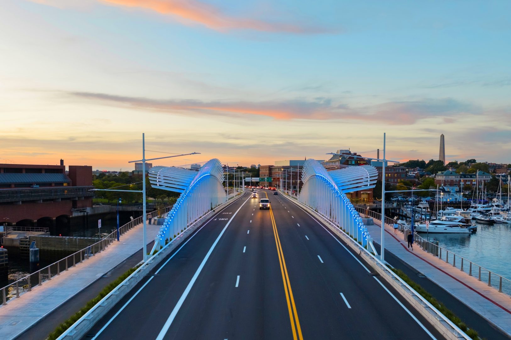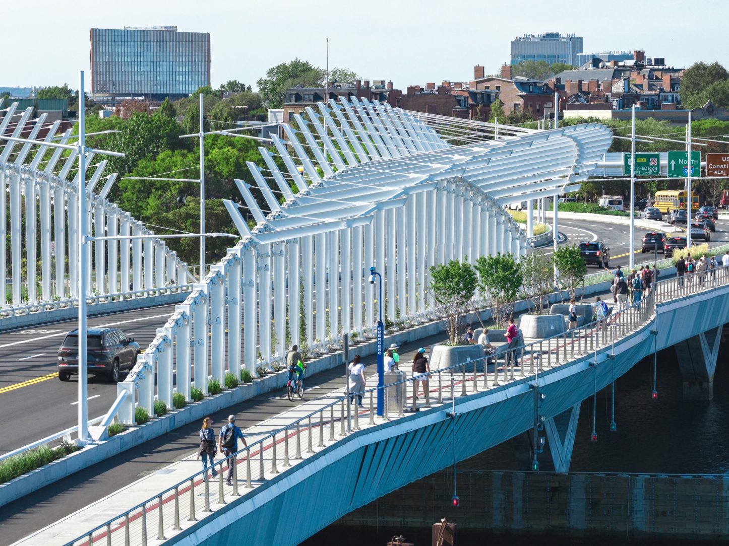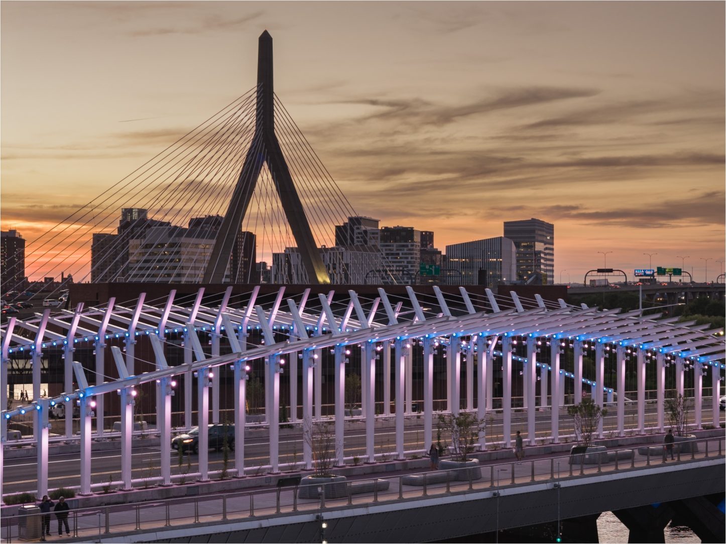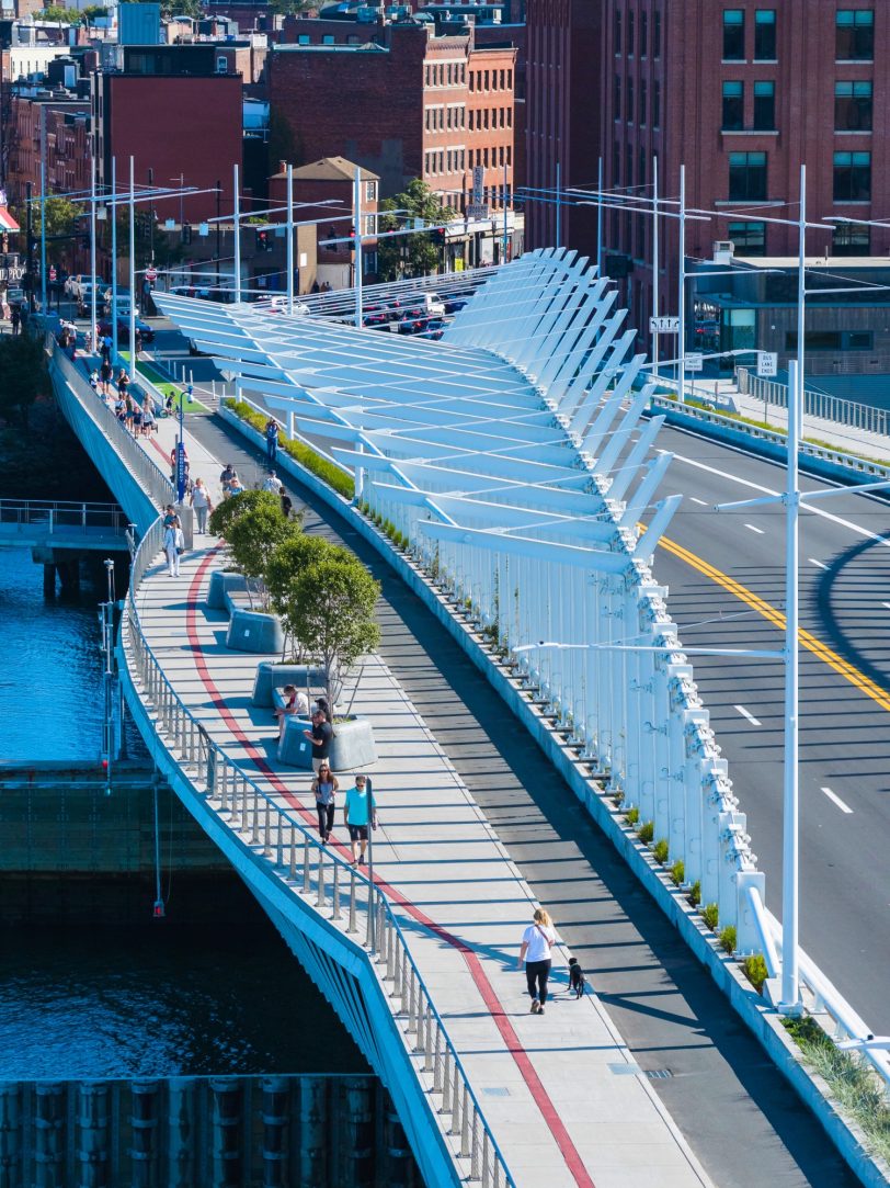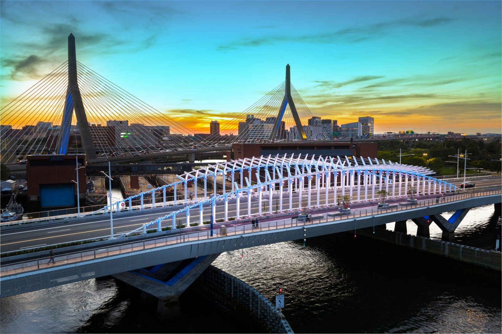 The new William Felton “Bill” Russell Bridge has replaced the historic North Washington street truss bridge, over Boston Harbor. Renamed in honor of Bill Russell, the legendary Boston Celtics player and civil rights advocate, the new bridge exemplifies contemporary urban infrastructure with a strong focus on multimodal connectivity and architectural expression. The design of the bridge was inspired by the adjacent Leonard P. Zakim Bunker Hill Bridge, and incorporates curved overlooks and open spaces at the central navigation span with seating areas, shaded trellises, and landscaped zones providing panoramic views of Boston Harbor and the city skyline.