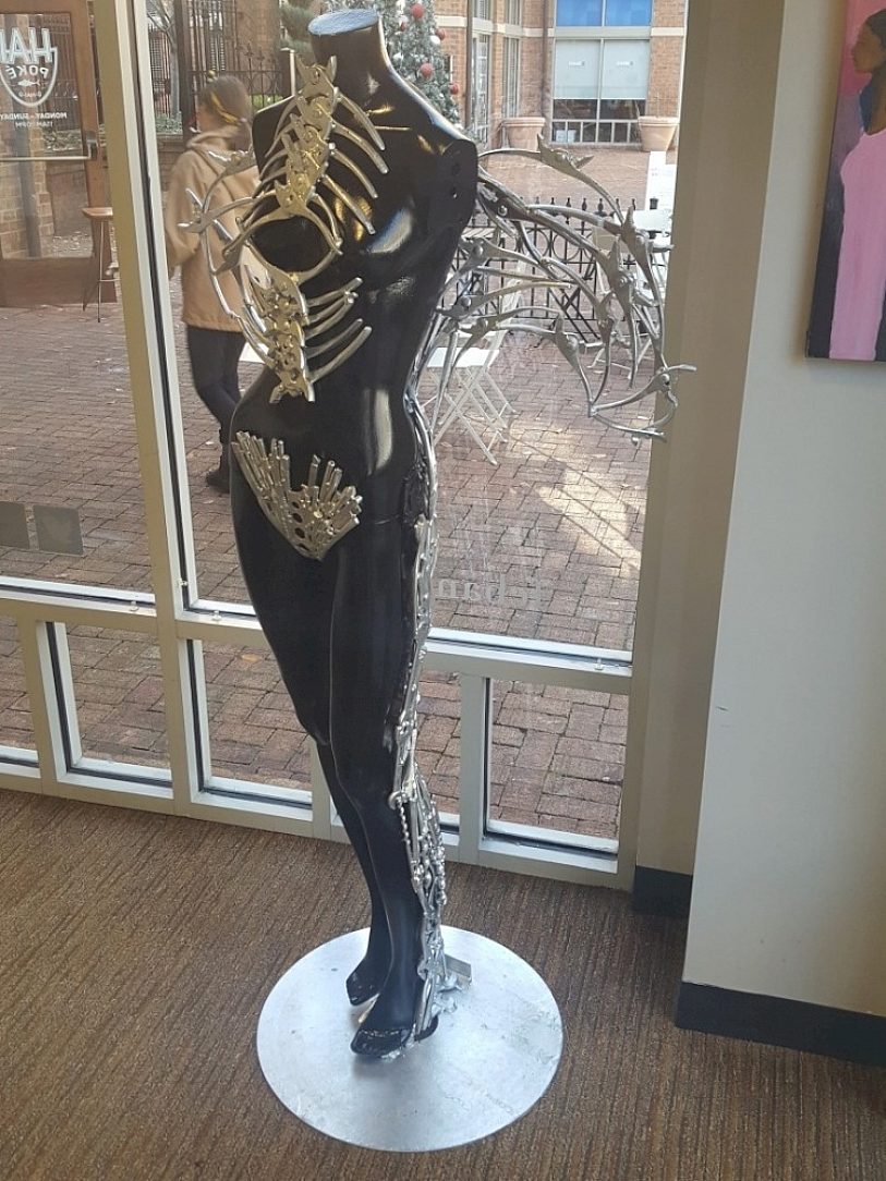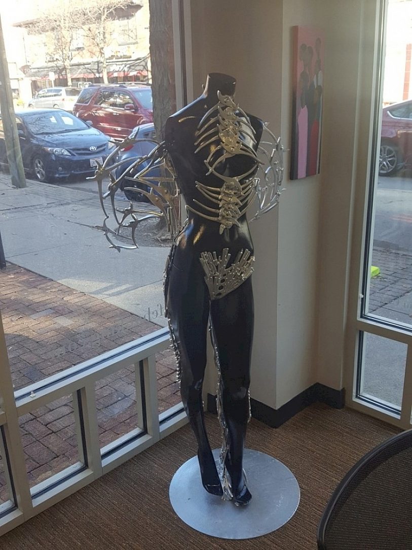 Formed & Welded over mannequin from Craig's List. Sculpted sandblasted, then Hot-Dip Galvanized