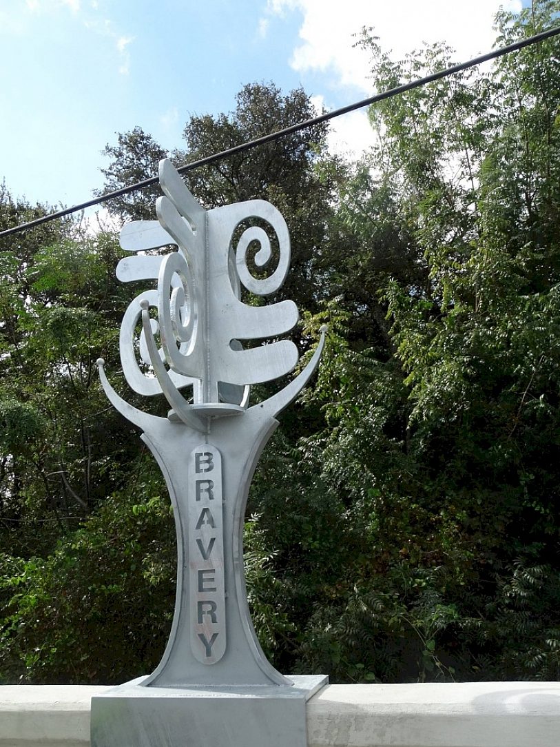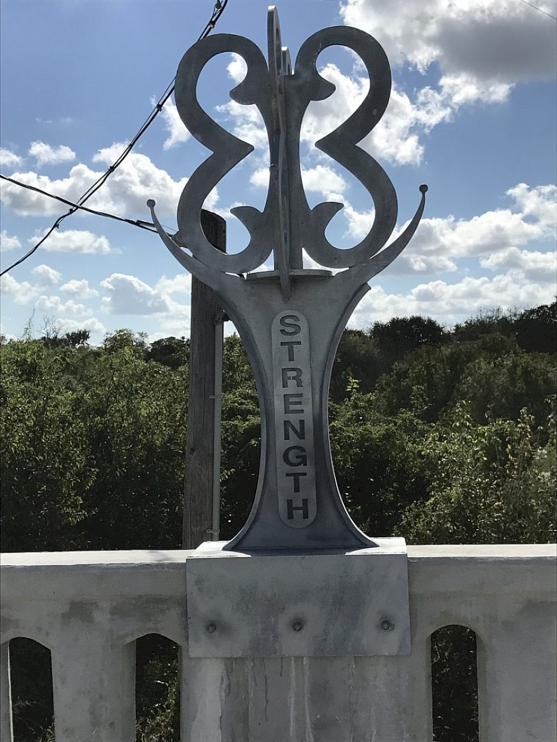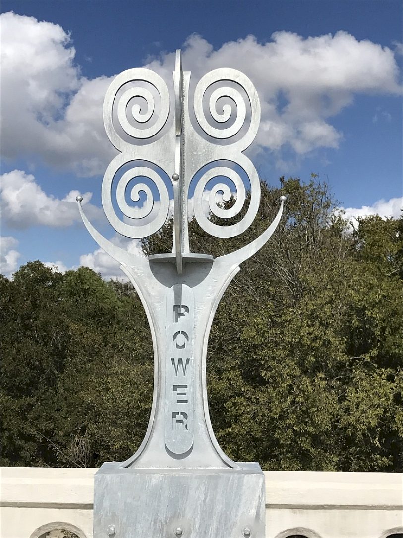The recently completed 14.3 million rebuilding of the Houston Street Bridge over Salado Creek near the AT&T center in San Antonio, Texas has been eye catching with the added funded project to add Art work to the 310 foot long span bridge comprising of sculpted clay panels and steel galvanized sculptures.