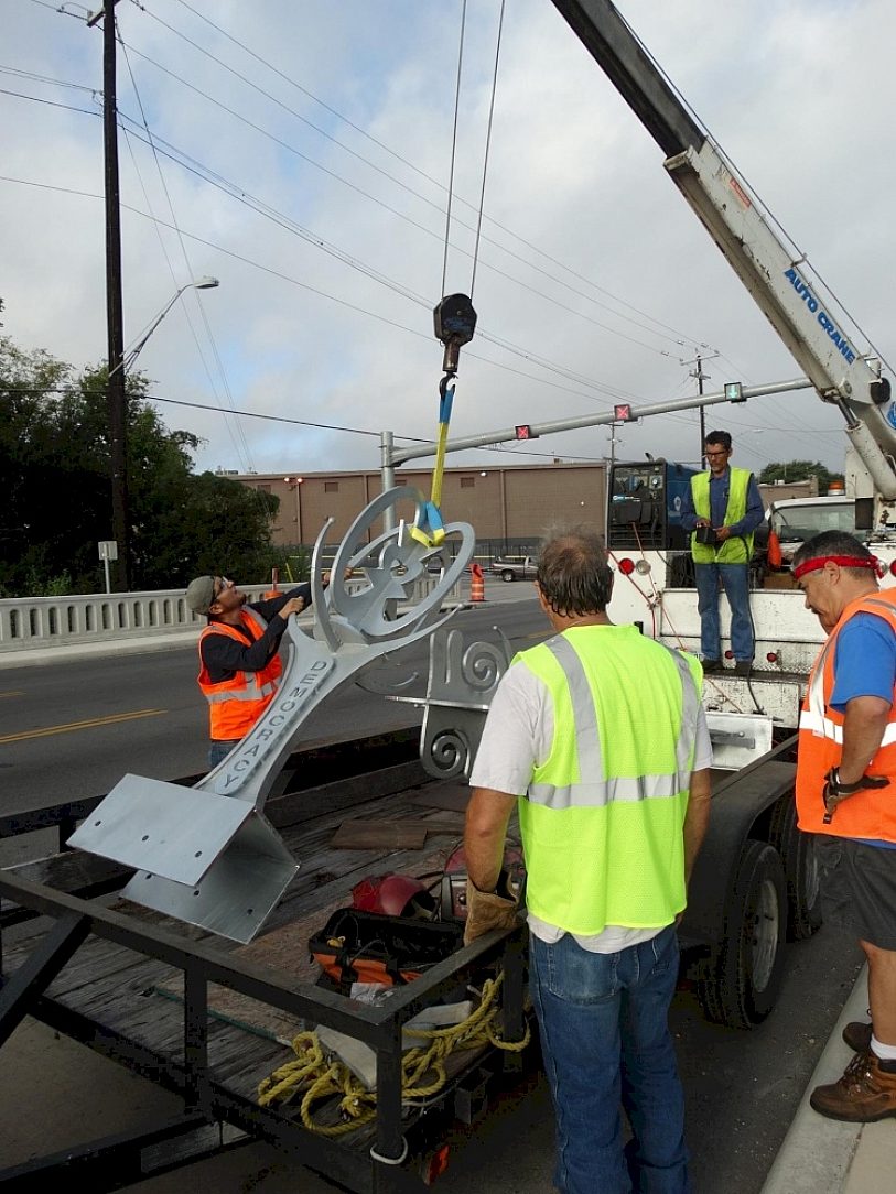 Galvanizing the sculptures correlate with existing industrial aesthetics in the immediate area. The process also allows for minimal maintenance requirements for the City of San Antonio as well as longevity of the sculptures. Because the sculptures are located along a highly traveled thoroughfare they are quite visible yet non-distracting.