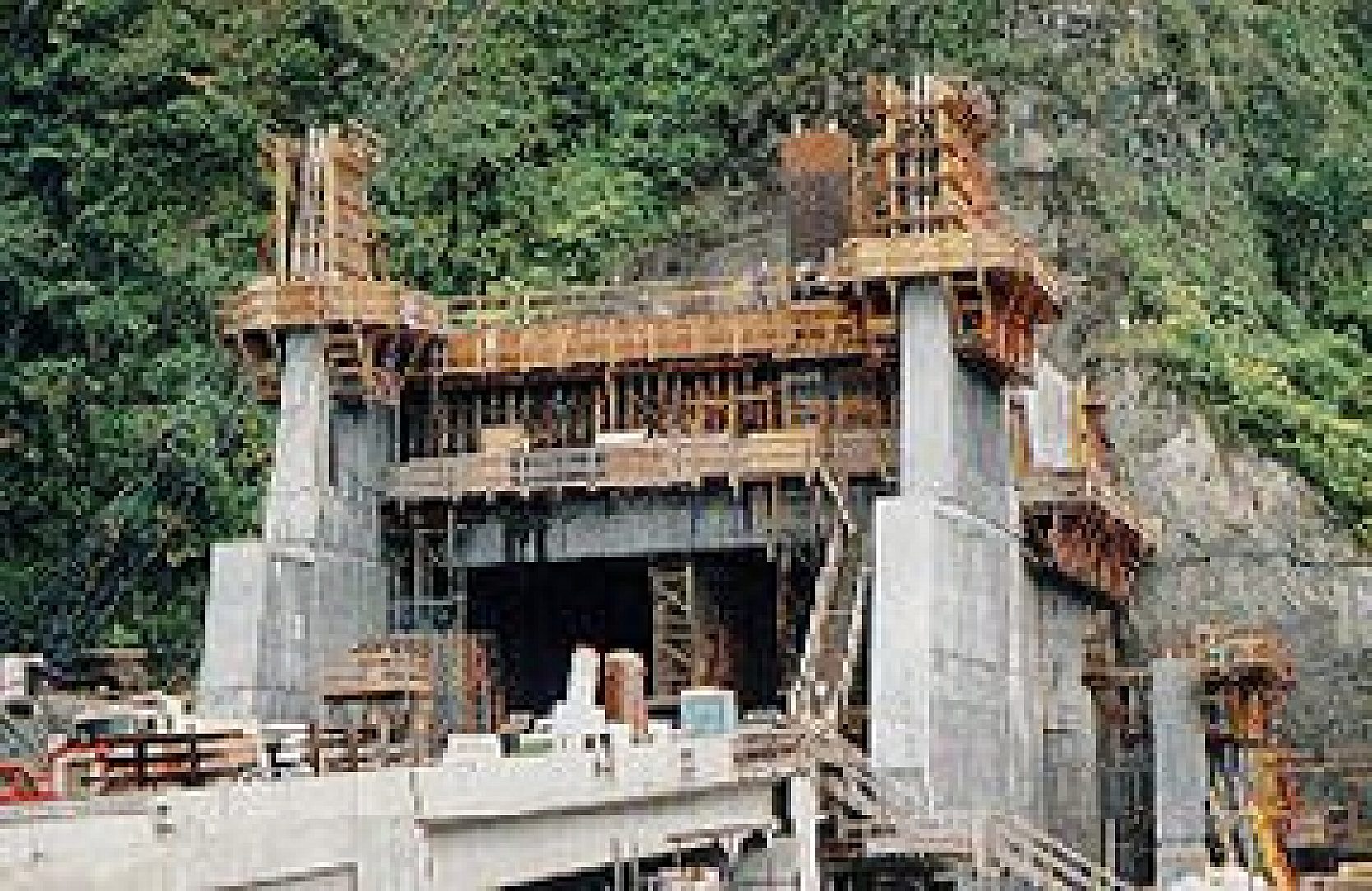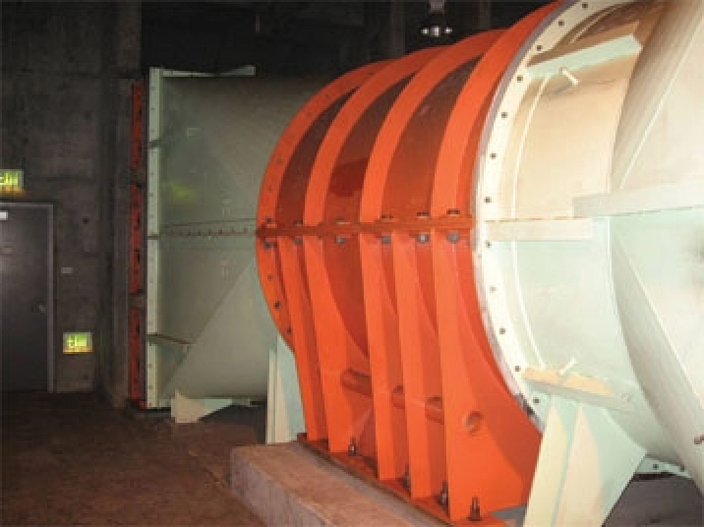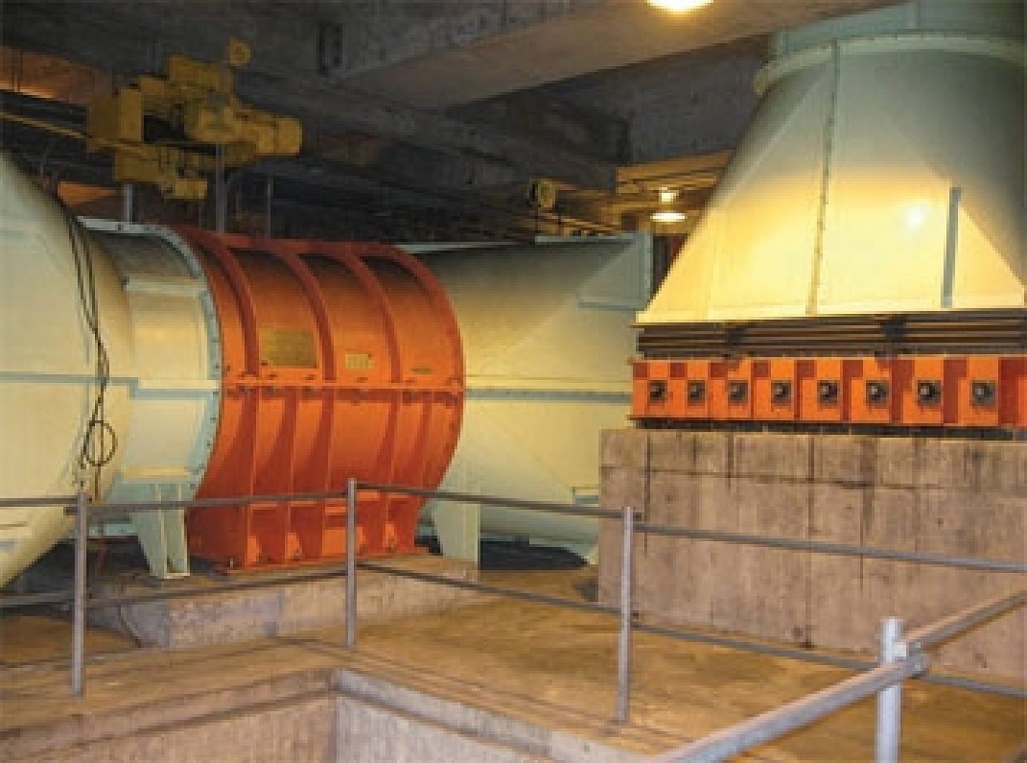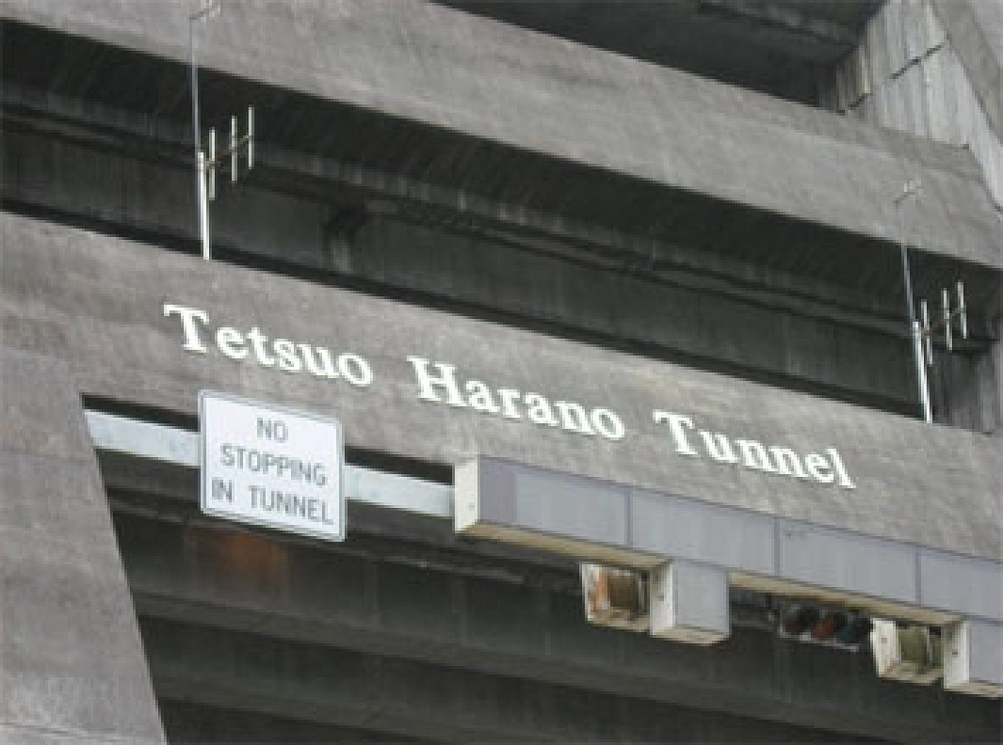 The ventilation for the tunnels is accompleshed by a false, flast concrete ceiling which runs for the entire lenght of the tunnels. The area between each arch of hte tunnel and the false ceiling is separated into two sections by a concrete divider, with one compartment used for inhaling exhaust air and one compartment used for distributing fresh air. Large fans either draw or blow air into the spearated compartments.