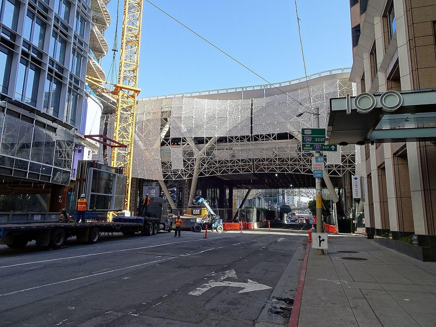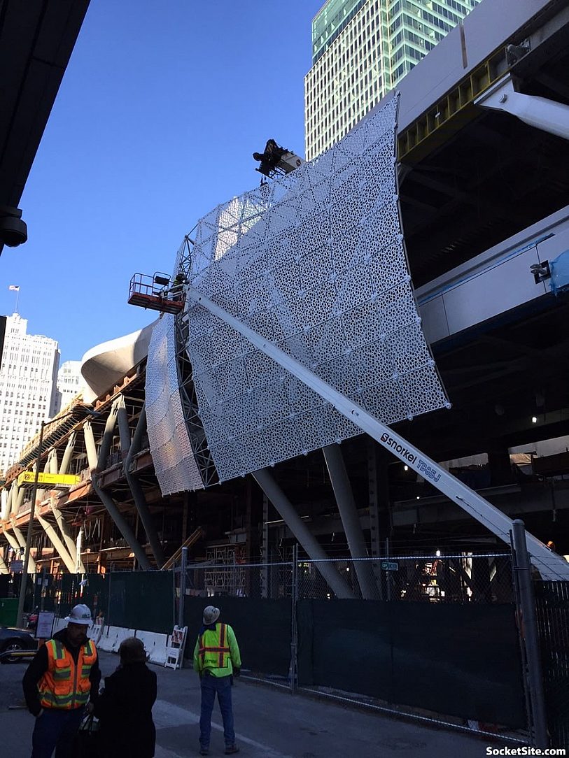Approximately 1.1 million pounds of connector pipes that held aluminum 3,992 perforated white panels to create a wavy, undulating skin around the transit terminal.