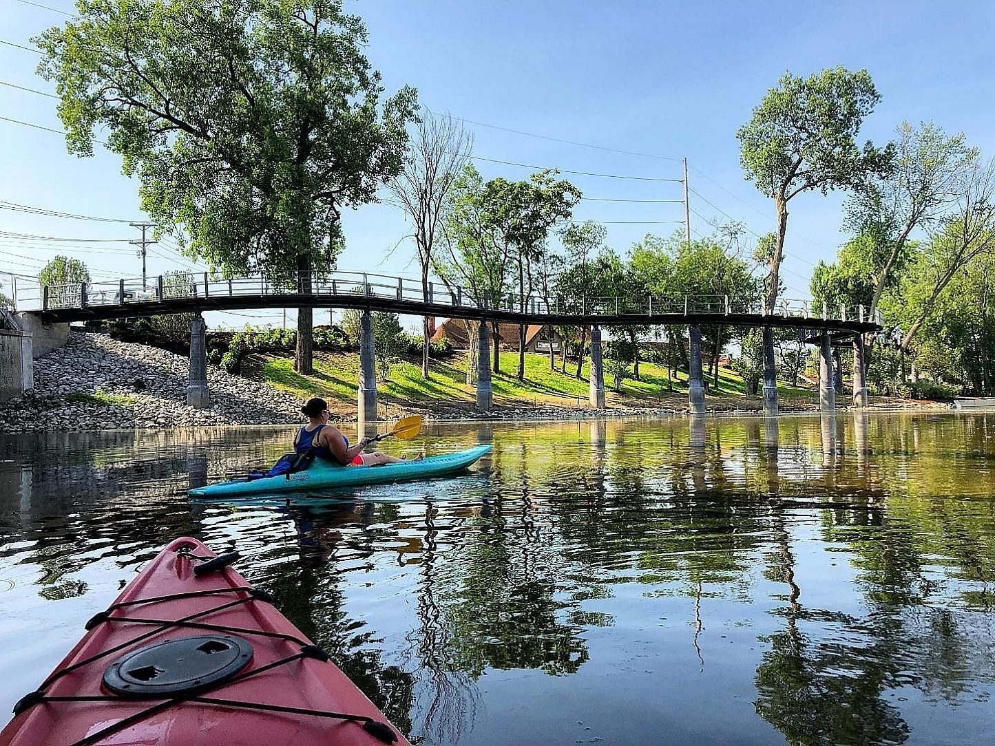 A nearly 600 foot long canopy walk through the trees provides views of the main park and downtown skyline. Utilizing open spaces and kayak hooks as storage.