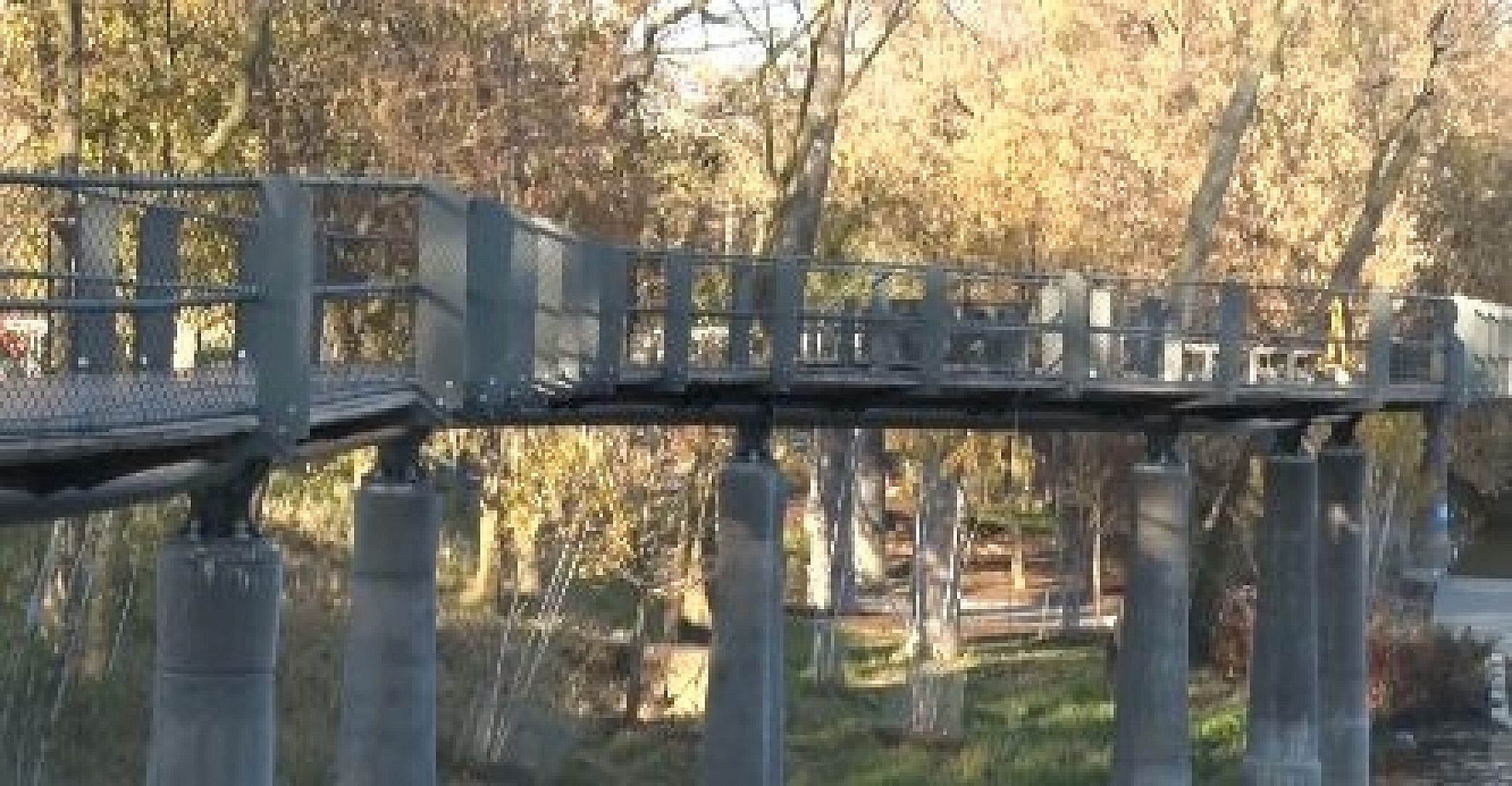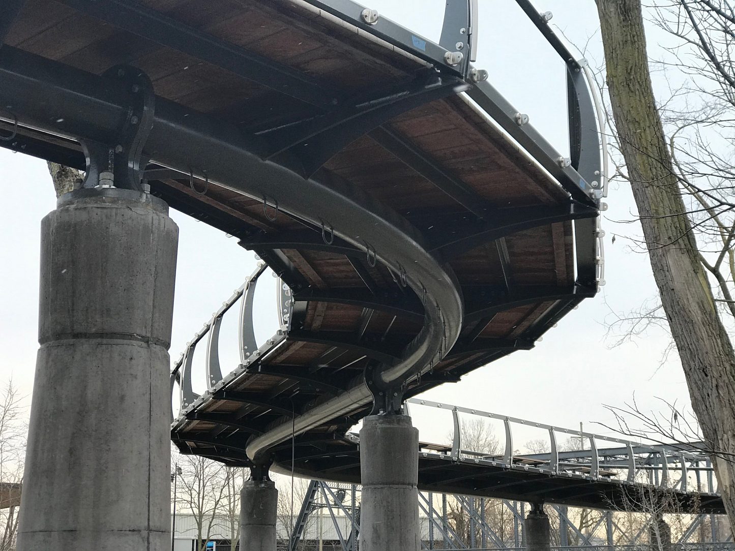 A duplex coating was specified in this project for the longevity of galvanizing and the customization of the paint color. A natural paint color was specified to blend in with the surroundings. With this process, we can assure double the life of the paint with little to no degradation of the steel. The structures are located up to 30' in the air, over a river, and in the trees which would increase the costs to repair or maintain the trail.