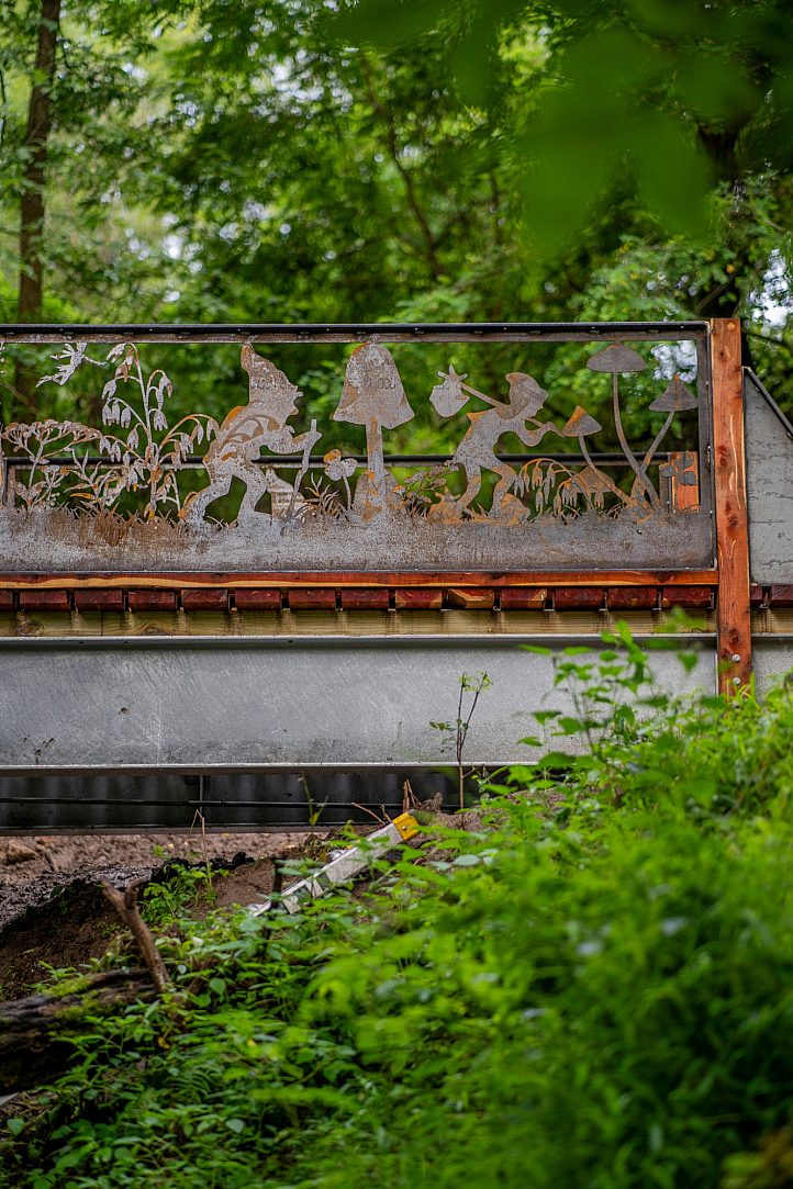 Galvanized steel was selected for the structural elements of the bridge due to its exceptional longevity, ensuring the bridge would withstand both time and the elements. However, the laser-cut railing panels were intentionally left as raw steel to develop a natural patina over time, complementing the forested setting of the nature trail. Artist Sammi Runnels, who designed the intricate illustrations for the railing panels, initially proposed a simpler design featuring ducks in flight, assuming the City of Winona would prefer a more conservative approach. However, the city requested a design featuring trolls to align with the trail’s “Troll Stroll” theme. “I took that opportunity to push the boundaries of laser cutting with this intricate and playful fairytale design,” Runnels explained.