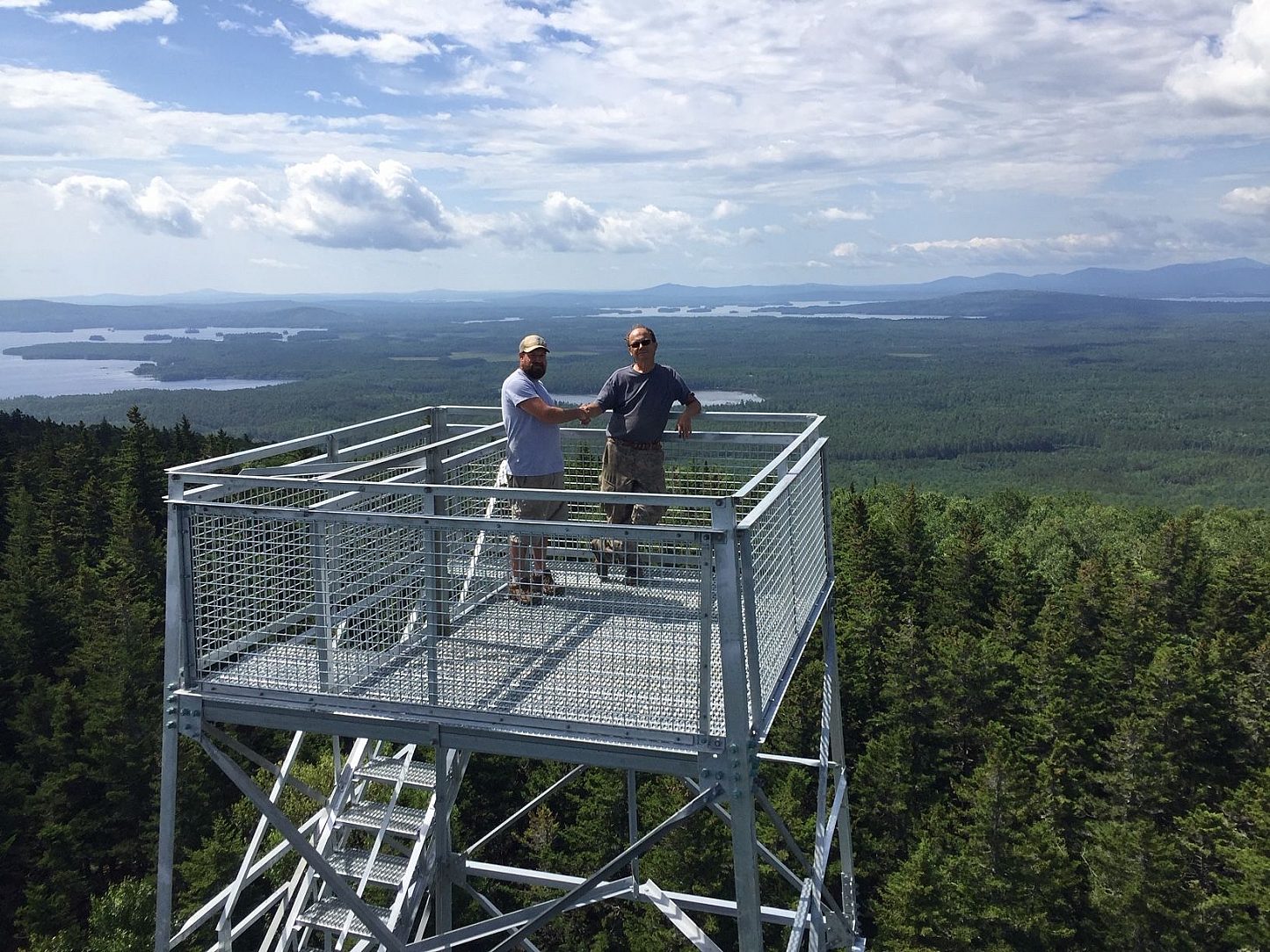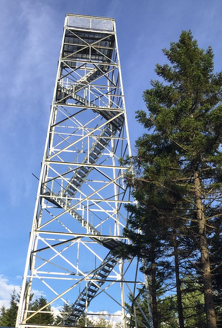 Davana Ltd. buys and restores historic fire towers. The tower on Trout Mountain was built from parts from a 120 foot tower David salvaged from Alabama. That tower was built in the 40’s and was in use up until 2017 when it was purchased by Davana. David used the middle sections of the salvaged tower to build the tower on Trout Mountain. He had 6 tons of the originally galvanized steel stripped to recoat the salvaged pieces. In addition, he used 4 tons of newly galvanized steel for parts to complete the Maine installation.