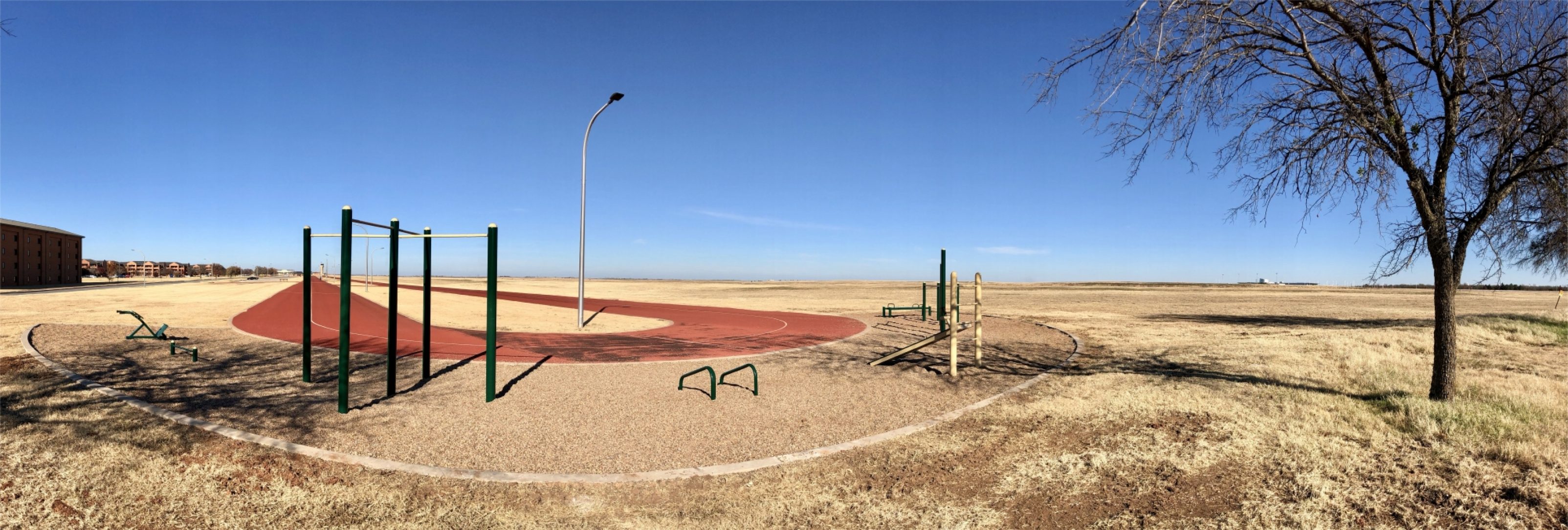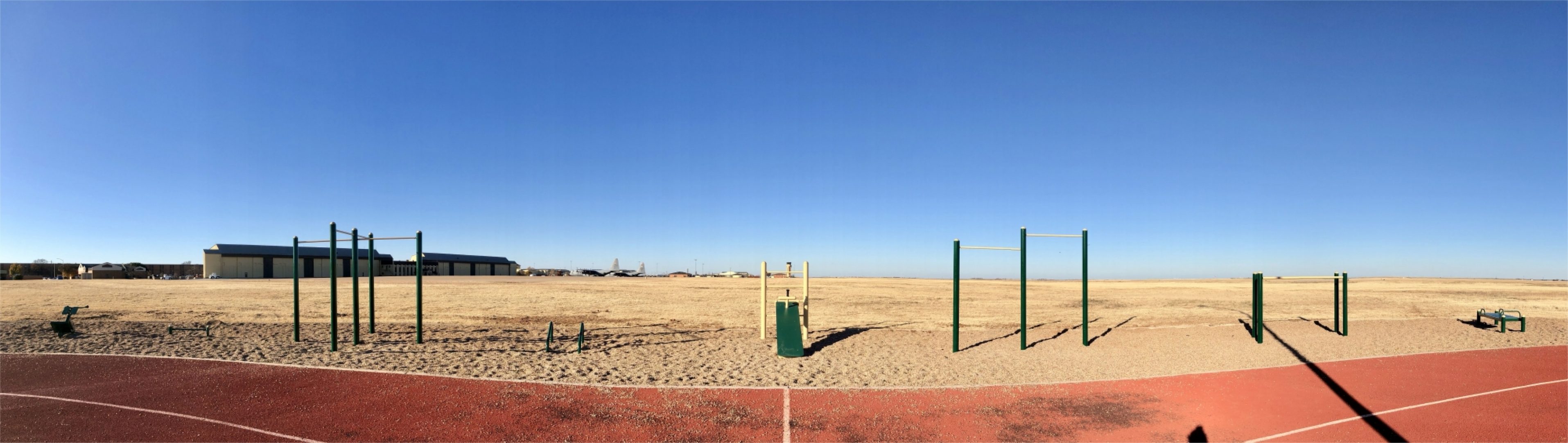 The Sheppard Air Force Base recently installed new fitness equipment at both ends of its outdoor (professional rubber-surfaced) running track that is fully lighted at night so it can be used 24 hours a day by base personnel to keep them in top physical form. This includes an adjustable sit-up bench, push-up stand and bar, back extension, pull-up bar and exercise bench which are all hot-dip galvanized and then duplex coated with an apropos matte dark green and yellow powder coat.