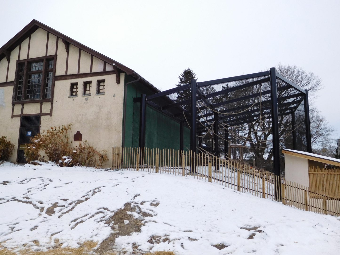 The gibbons at the Utica Zoo are a popular attraction as they are very active and the public, especially kids, love to watch them swing around the enclosure. The existing enclosure was small and did not give the gibbons the space they needed. The project was to convert an obsolete holding area over to a gibbon area. This was installed while the zoo was active and open to the public. The public was allowed within ten feet of the work area. The project consisted of an exterior exhibit area and a new interior holding cage for the animals. Gibbons are extremely smart and required a special door with a double locking mechanism to contain the primates.