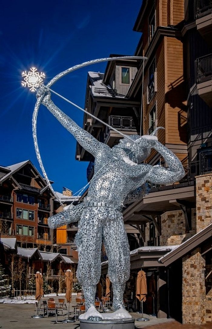 A product of Norse mythology, Ullr is known as the God of Snow, Patron Saint of Skiers, the son of Sif and stepson of Thor, the God of Thunder. Cold-loving, bow-wielding Ullr (pronounced Oool-er) is said to be an expert skater, skier and hunter who would glide around the world and cover the land with snow. He is the one snow fans send prayers to prior to vacations and recreational weekends to ensure adequate conditions for their winter sport of choice. Breckenridge Ski Resort has been paying homage to this Norse God since 1963 with Ullr Fest, a winter celebration where guests bundle up, chant his name, participate in a rowdy parade, burn old skis in raging bonfires, and more. For many, it is a highlight of the year, and now a 25-foot tribute sculpture will watch over the festival and skiers all throughout the season.