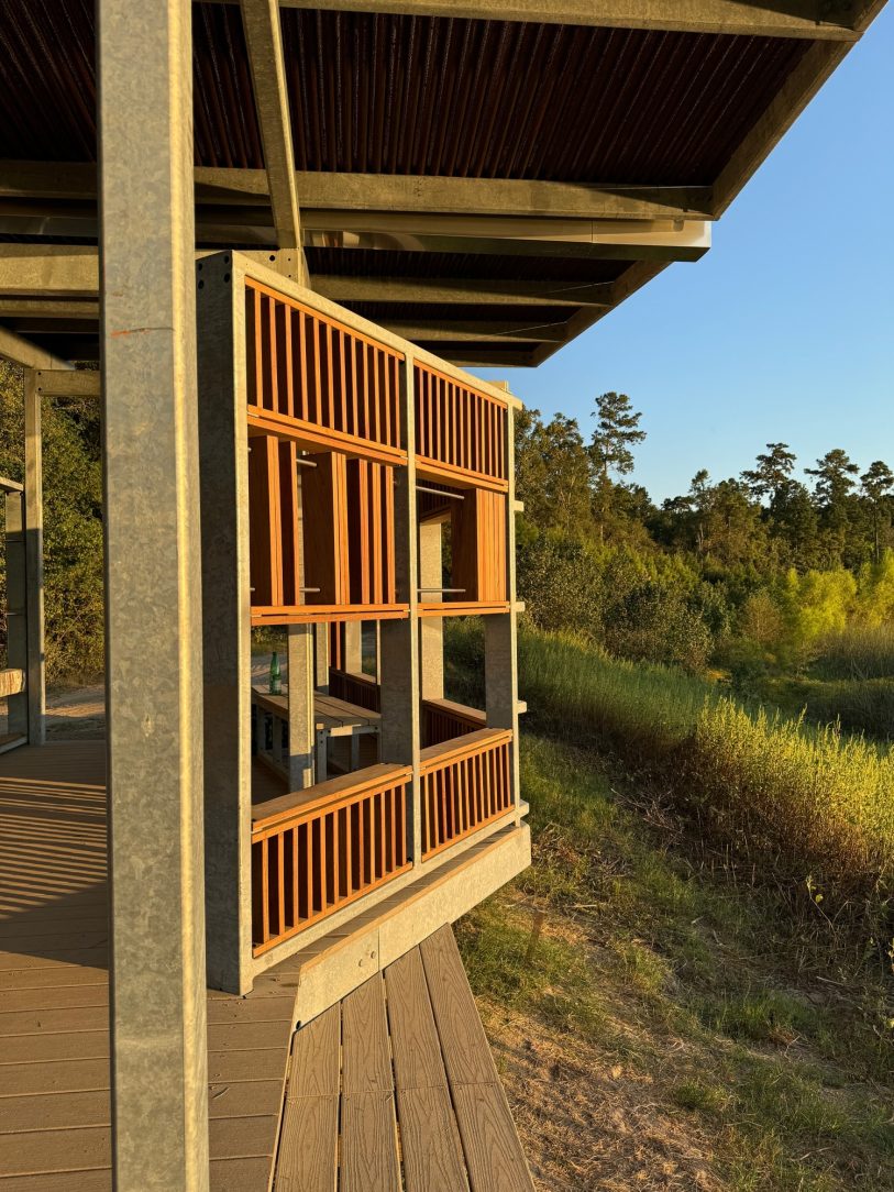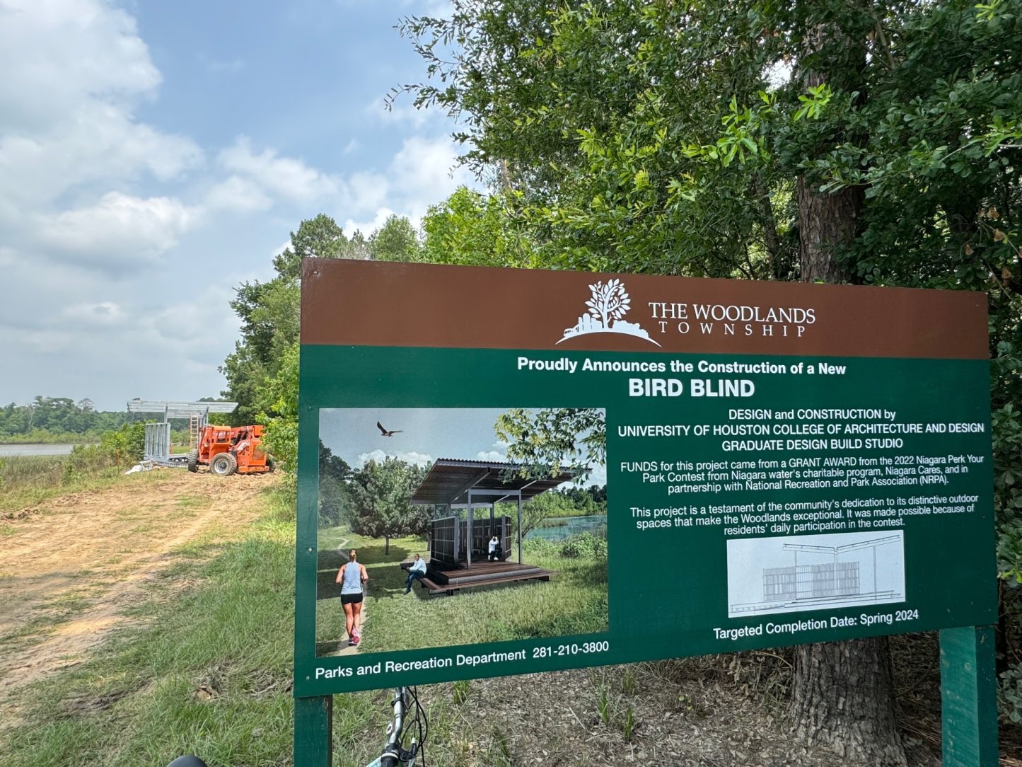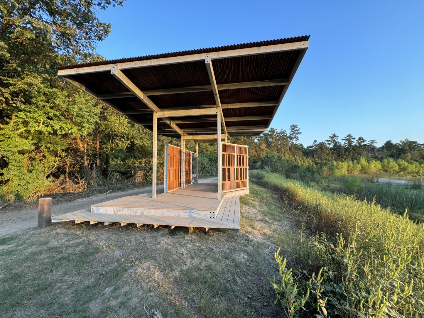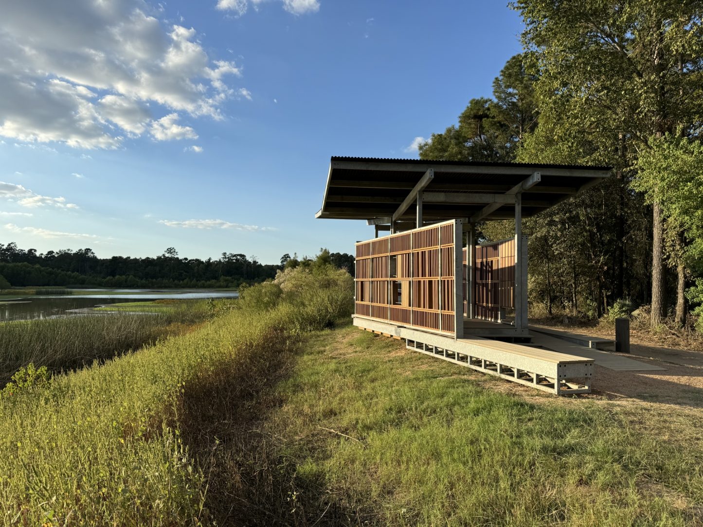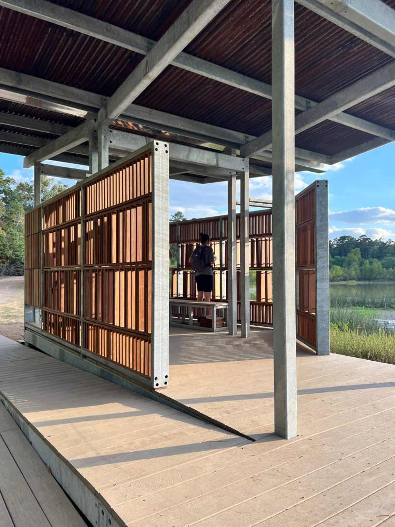 The Bird Blind Wildlife Observatory was designed with dual purposes in mind. It not only provided an opportunity for architecture students to engage in a real-world project, from concept to completion, but also serves as a long-standing public amenity for the local community. Located along the Spring Creek Nature Trail, part of The Woodlands’ extensive 220-mile network of trails, it has quickly become a popular destination for birdwatchers. Positioned next to a water body rich with bird habitats, the Bird Blind has contributed to sightings of more than 130 bird species, offering respite from the Texas heat with its shaded, elevated platform. The vertical screen walls are designed to protect local wildlife by minimizing disturbances.