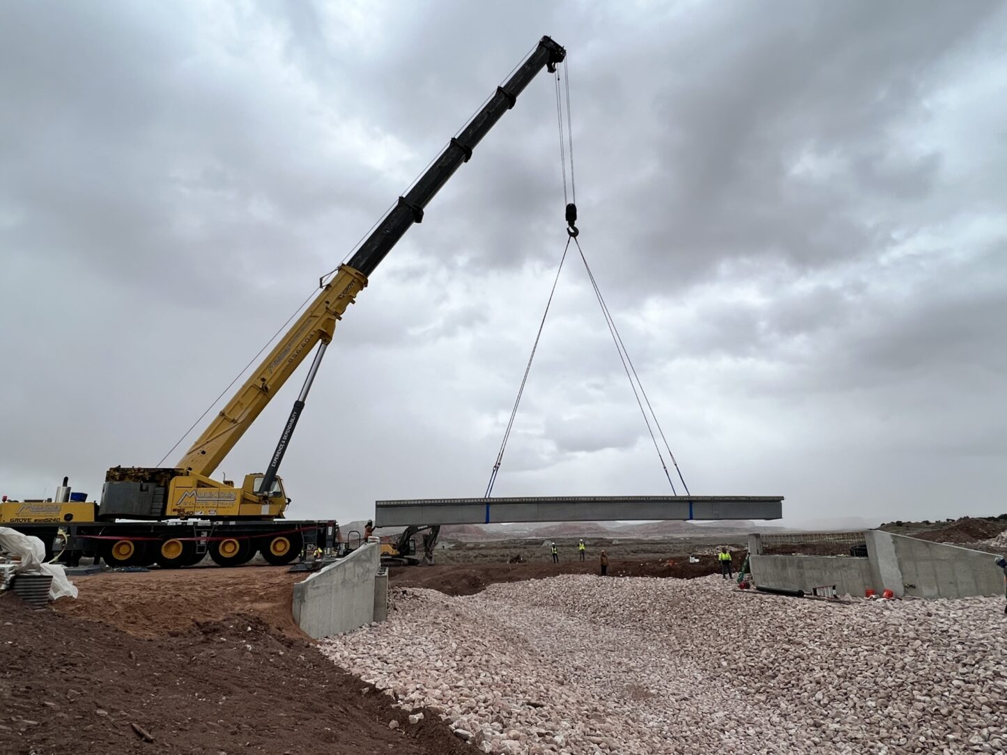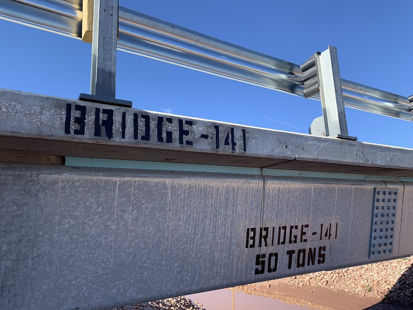 The 70’ span x 25’ wide bridge had to be designed to comply with NMDOT Standard Specifications, utilize NMDOT Standard Steel Railing, and accommodate MLC 50 (Military Class) tracked vehicles. After rigorous design review by LBTD Engineering and USACE, the U-BEAM™ press-brake-formed steel tub girder design was approved for fabrication. After fabrication and hot-dip galvanizing, the steel U-BEAMs were sent to Tricon Precast for the precast deck installation. The complete units were shipped to the installation site on April 11th, 2022, and due to the accelerated construction design, they were installed the following day.