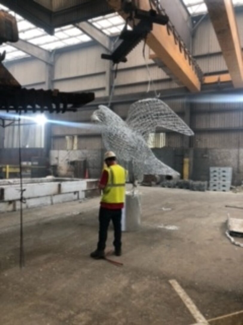 The welded artwork, standing at 13’-0” tall. The sculpture made from mild steel rods weighs 2.0 tons. Hot-dip galvanizing was chosen for the coating’s durability and longevity. With having the sculpture hot-dip galvanized this also allowed to attract people’s attention to the aesthetics of the sculpture.