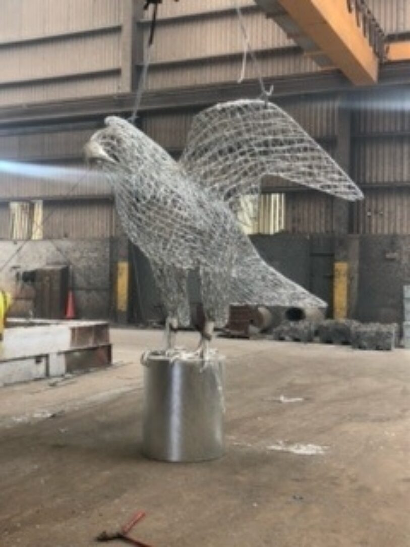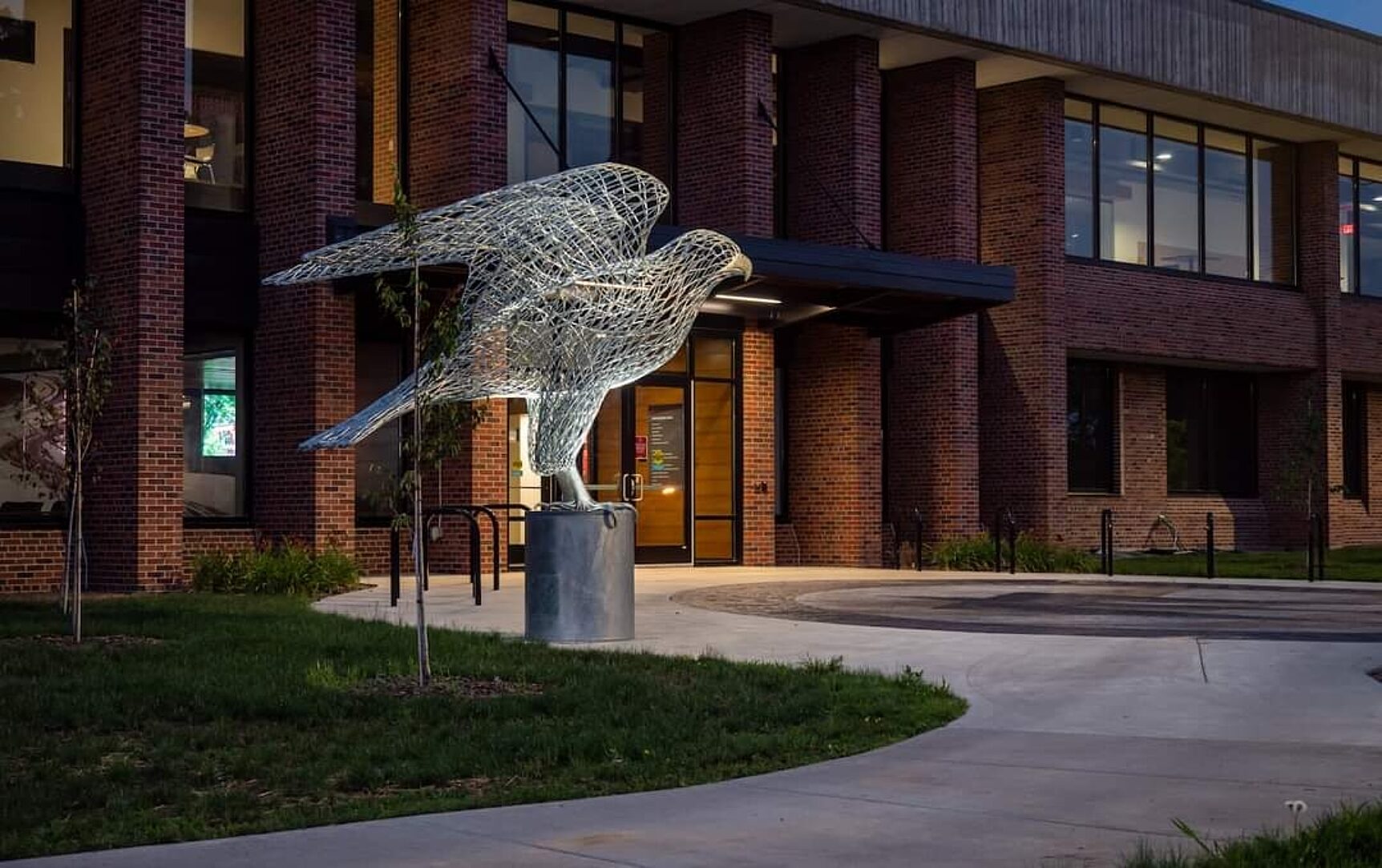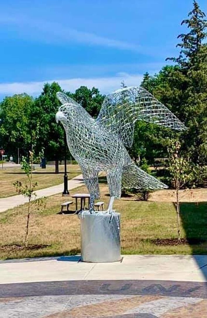 The sculpture was meant to resemble a peregrine falcon, although it is not an exact representation. In the words of Paulus, “The committee did not choose the artist, but rather the artwork chose us.” Out of 115 applicants, “The committee eventually narrowed the pool down to three and chose Peter Busby,” Paulus explained, “for his artistic vision, craft, and the specific medium of steel rods.” The artist, Busby, describes his work as something that creates a sense of community.