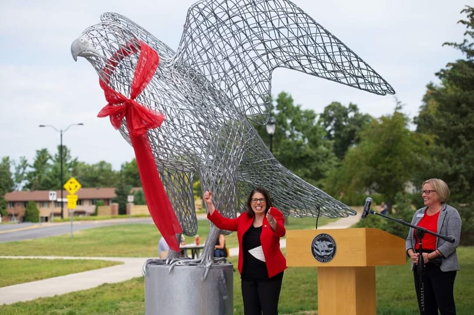 During construction of the newly built Rodli hall, Melissa Wilson (Executive Director of Admissions) and Sarah Nelson (Professor of Art) discussed that University of Wisconsin – River Falls needed a new tradition. “We wanted something that would attract the attention of our campus visitors and current students alike.” The vision of the sculpture was created around something that could stand the test of time while creating a new space for students and faculty to be proud of their school pride. The sculpture resembles a peregrine falcon.