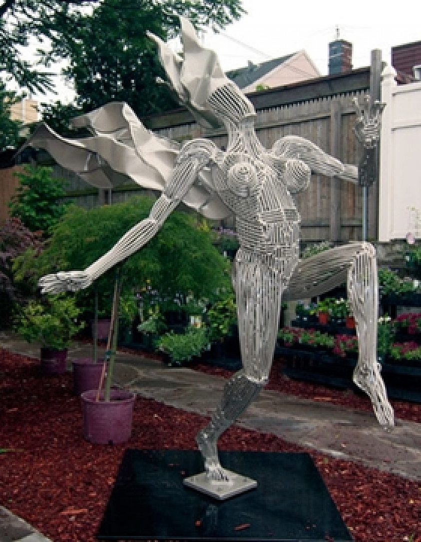 The statue was galvanized in 4 pieces, base plate, the body of the sculpture and 2 wings made from sheet metal.