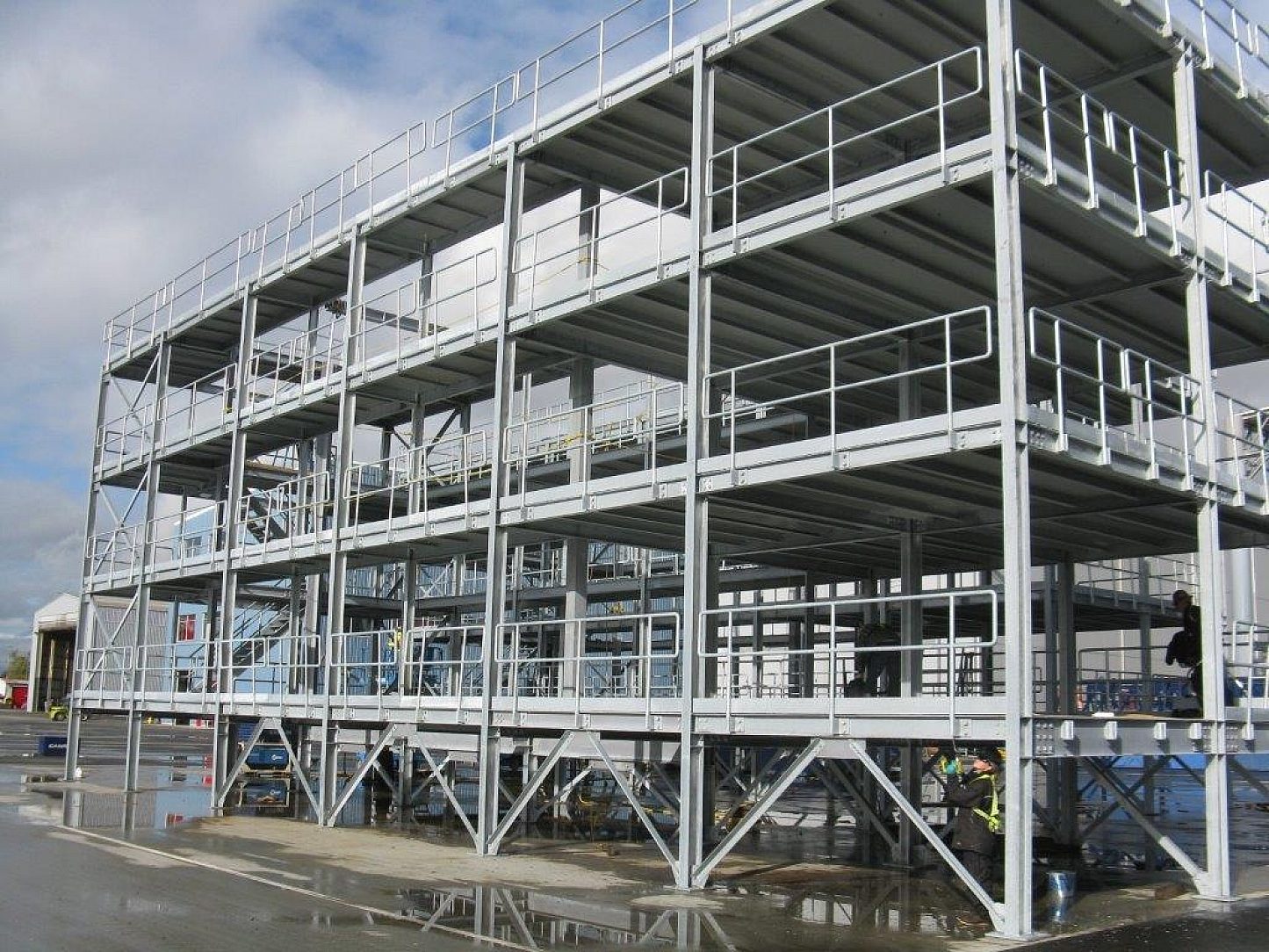 The Seaspan Vancouver Shipyards was part of a large redevelopment project to launch the rebirth of the West Coast shipbuilding industry. As a part of the modernization project, four mobile container platforms were built. Each tower will house six containers to be used in the construction of off shore marine vessels. The containers will house everything from offices, crew facilities, and storage.
