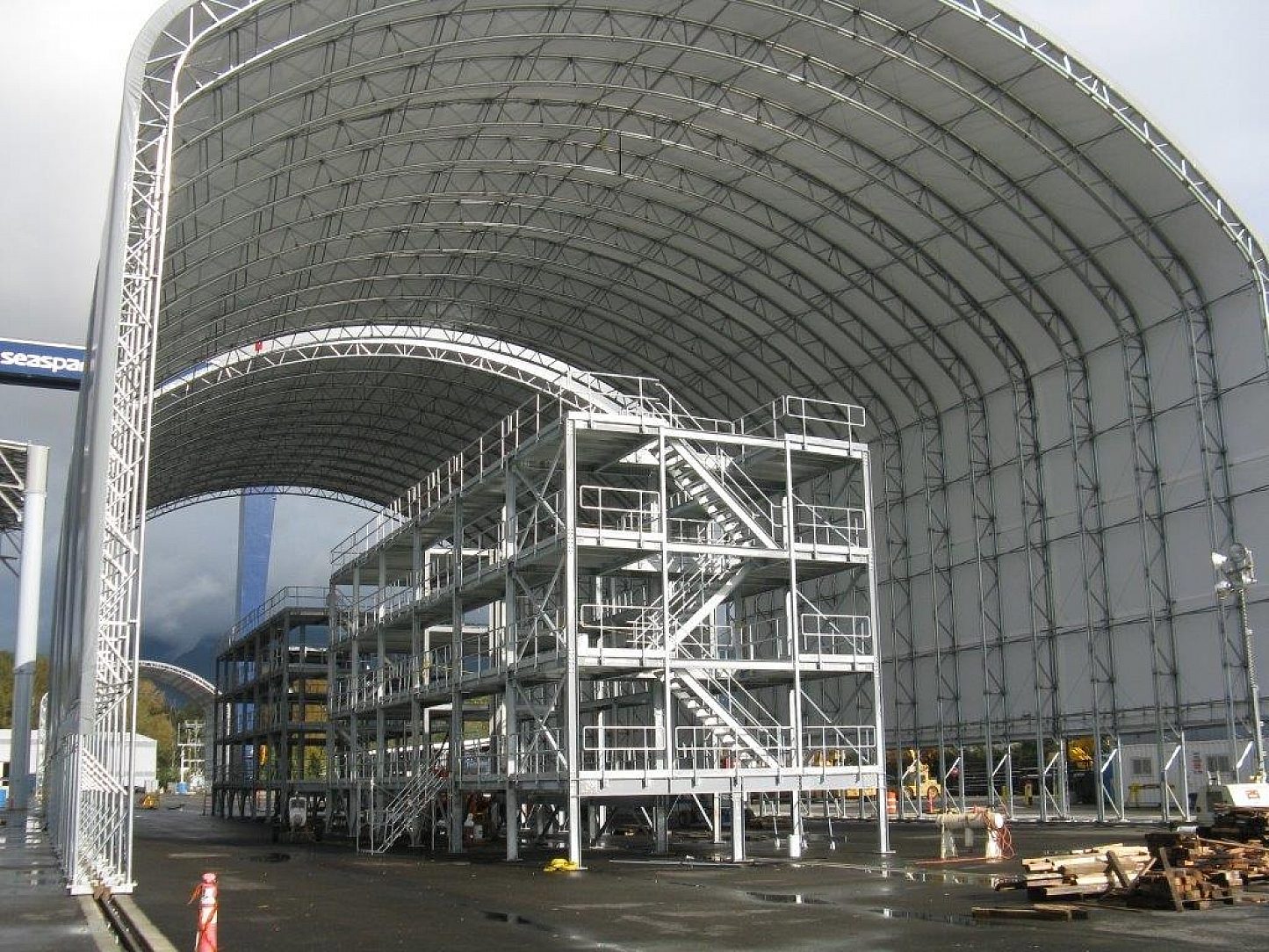 The mobile container platforms and towers were originally slated to be painted; however, Seaspan eventually decided to hot-dip galvanize the steel as they are located along the oceans edge on Vancouvers North Shore. As galvanizing was an afterthought, all the work had to be done in mere weeks fabrication to erection was completed in just a few months.