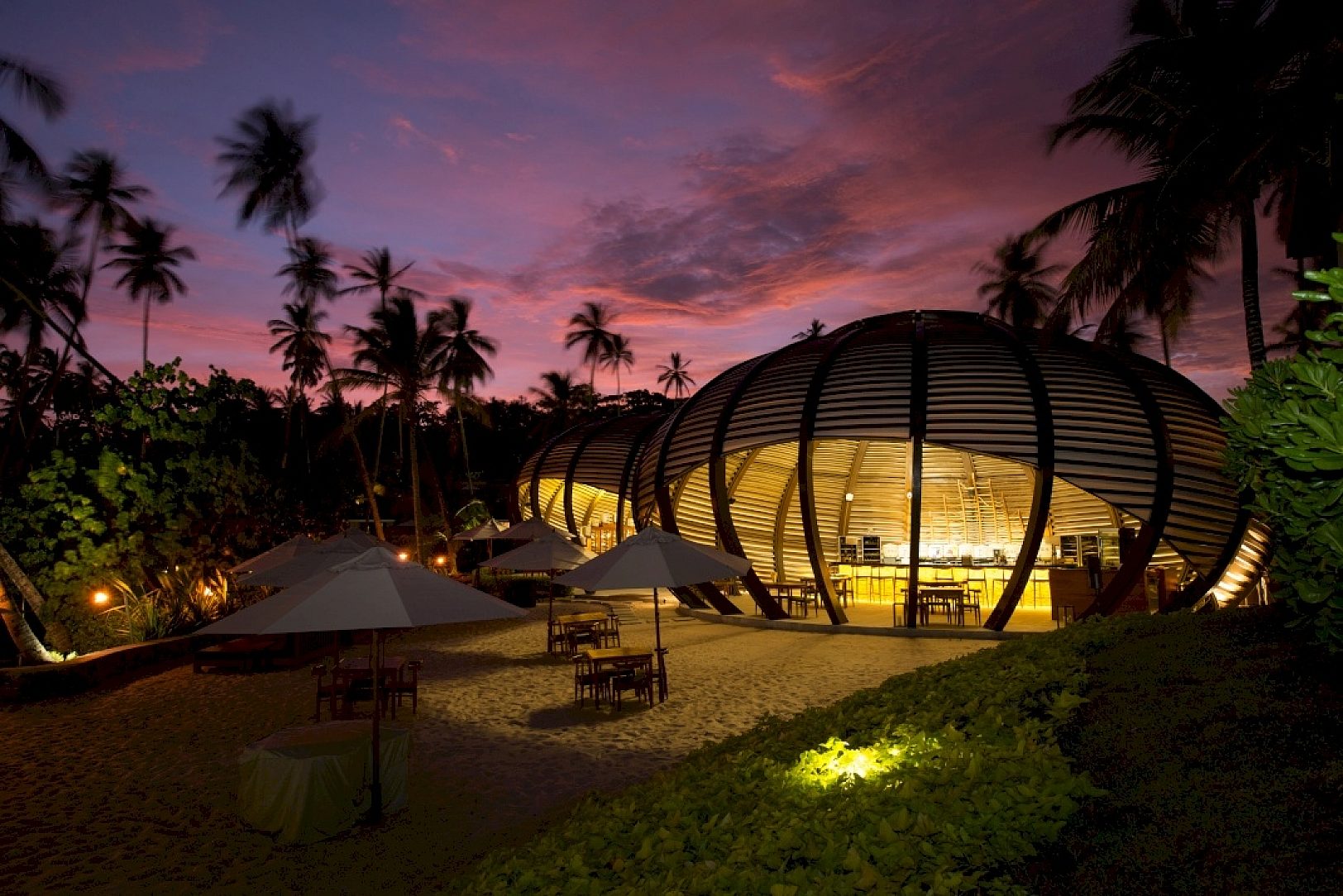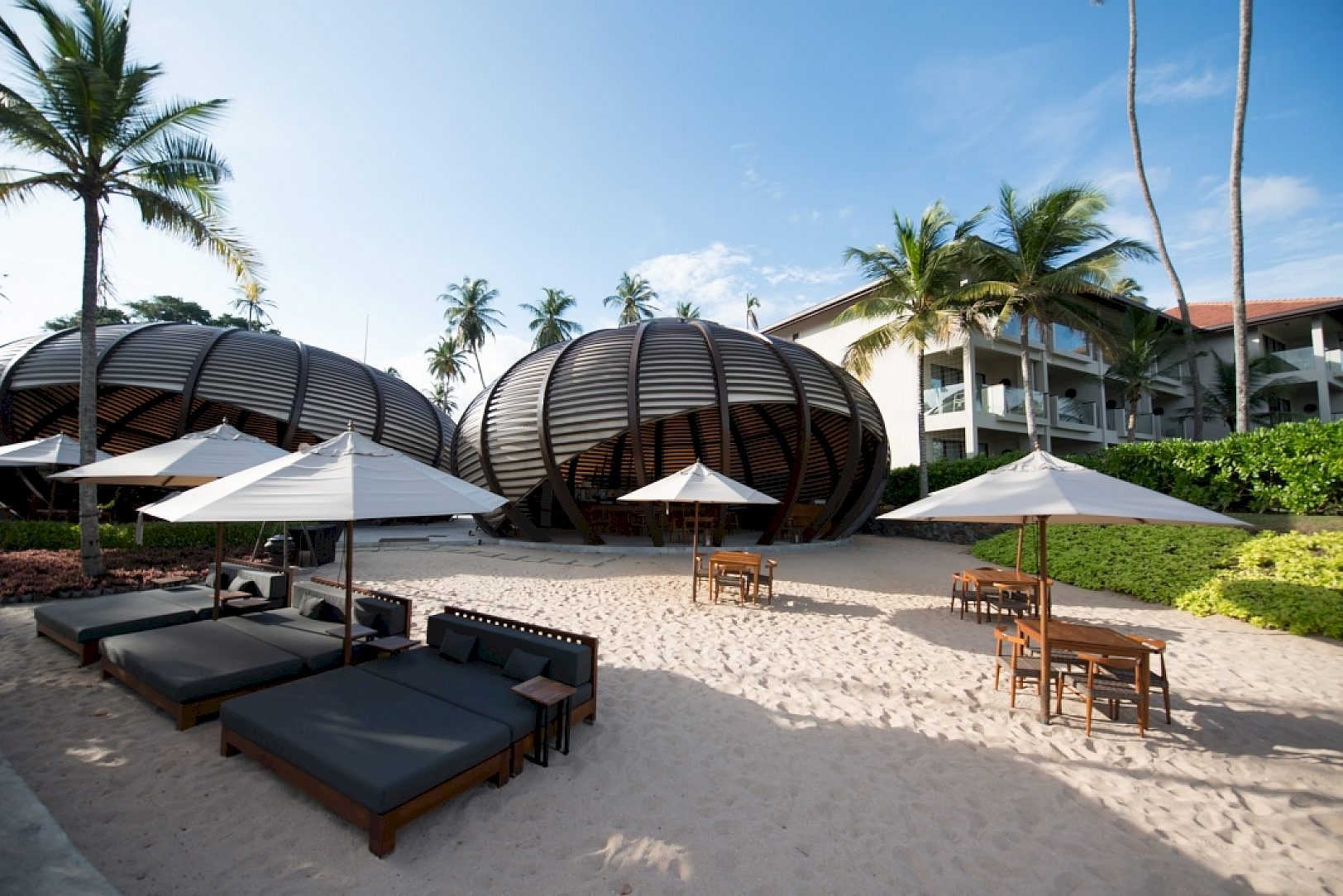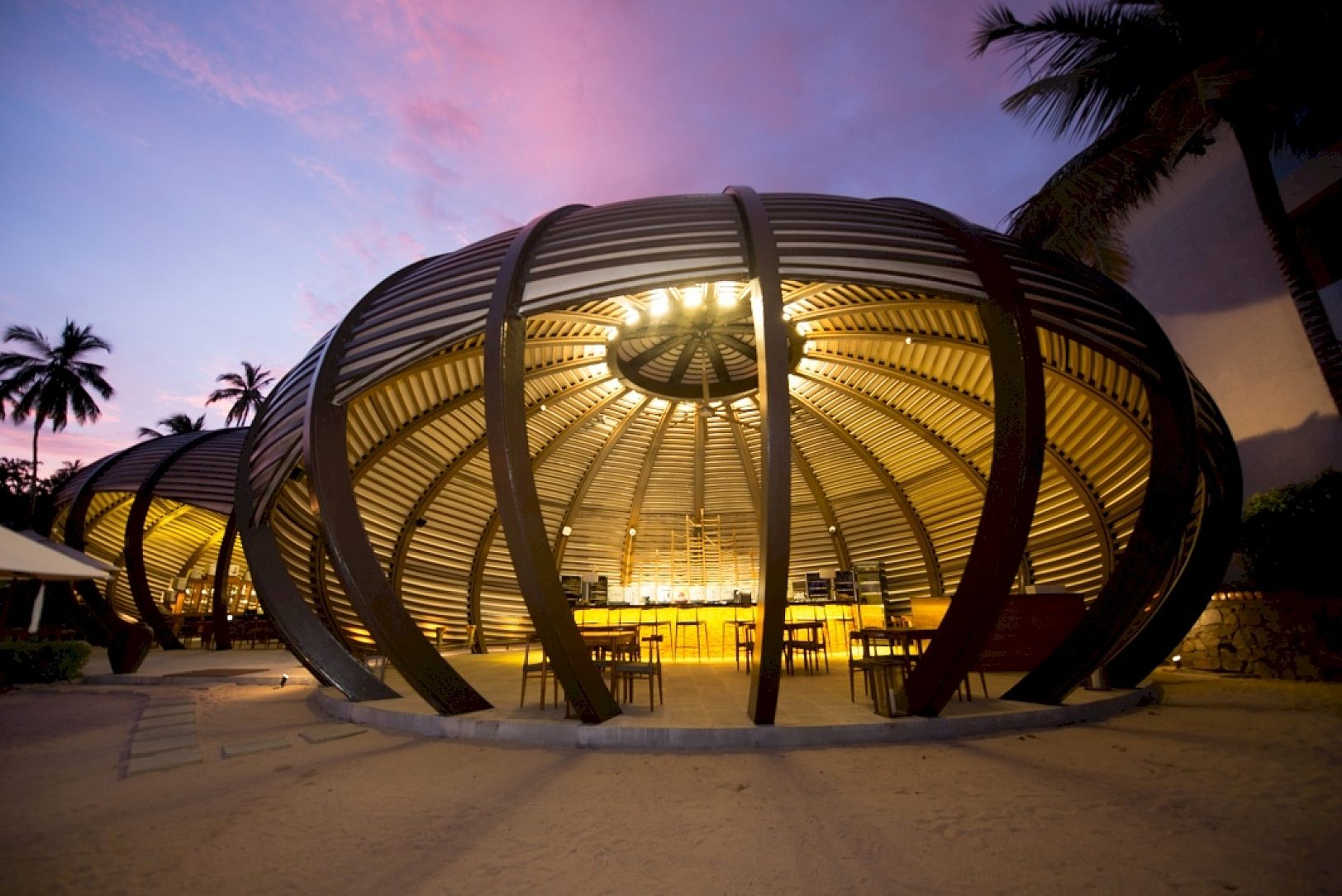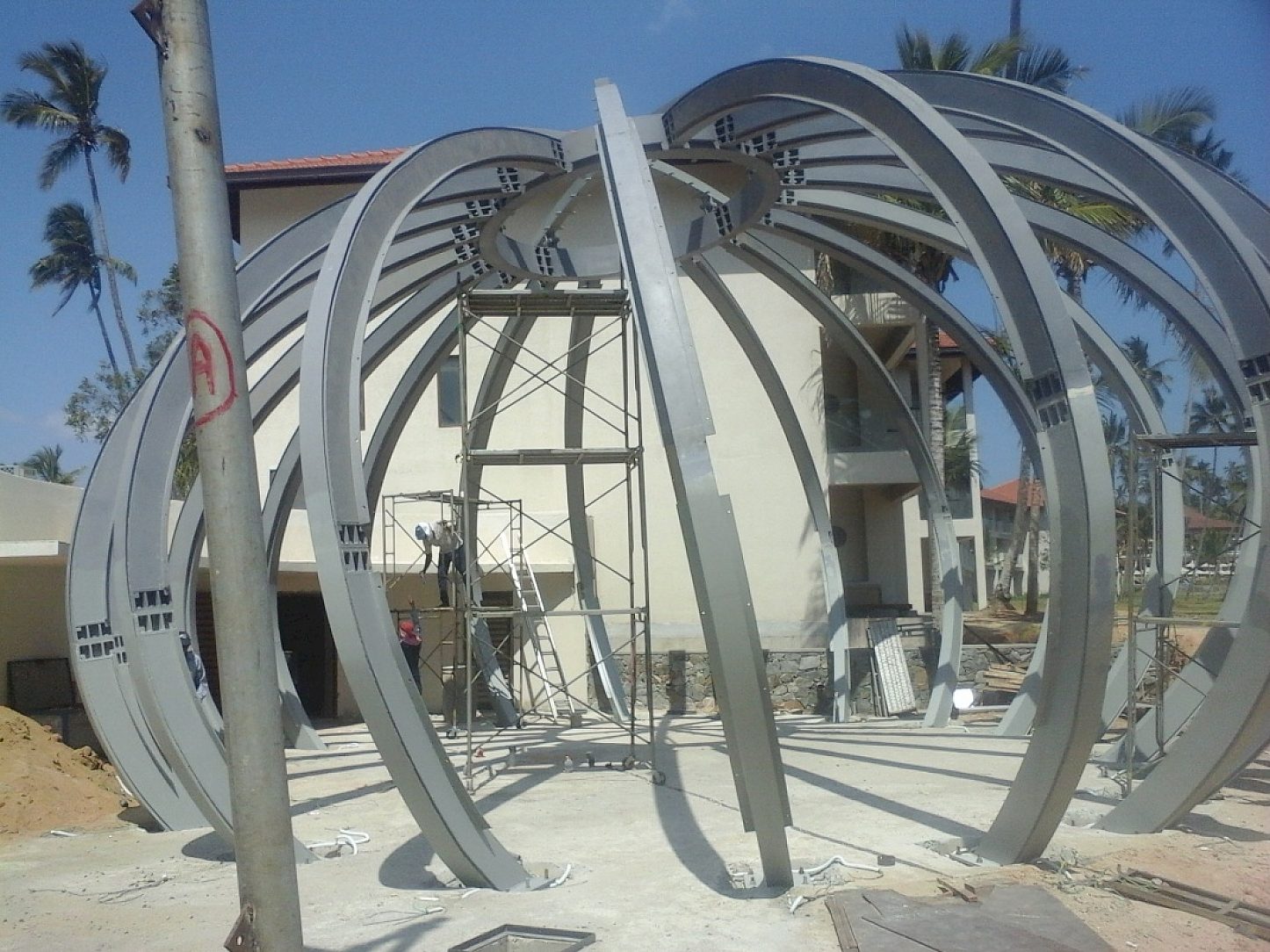 Verele Japanese restaurant lies at the western-most end of the Anantara Peace Haven Resort Tangalle, overlooking the Indian Ocean. This restaurant on the beach consists of two dome-shaped structures resembling two huge balls. Teppanyaki-inspired dining is enriched by the unique flavors of Sri Lankan cuisine at this specialty beachside restaurant. Because of its location, a duplex system of hot-dip galvanizing and paint was specified to protect these structures from the harsh marine environment and tropical weather of the southern coastal region.