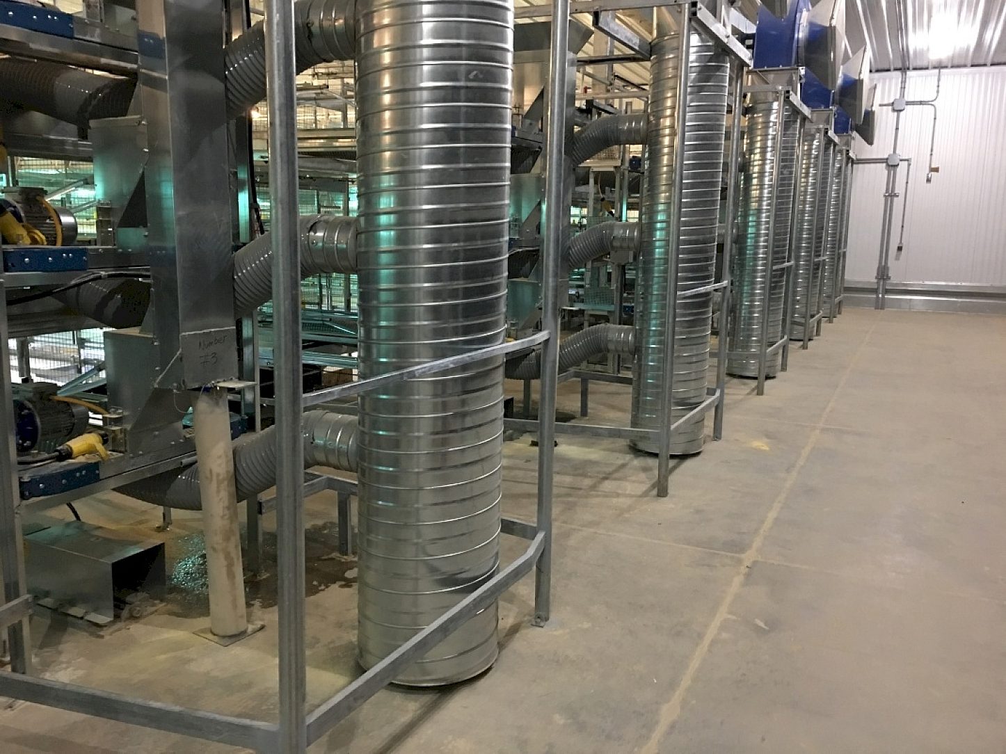 Versova had the project designed and fabricated by Star Brand which Versova was extremely pleased with. This facility will be home for about 200,000 chickens as they grow from 1 day old to 18 months old. The exoskeleton design of the building has structural beams exposed to a multitude of different elements as it rests in a large corn field out in northwestern Iowa. There are almost no trees around the facility to slow the wind as it will carry the cold winter air and snow into the sides of the building over the years. With rain, debris, hail, sun and many other weather possibilities in Iowa at any given point of the year, the building has to be ready to take a beating. The inside of the facility will also face challenges from concentrated amounts ammonia found in livestock excrement. With all of these known forces working against the building from the very start, protection of the steel was paramount in planning to keep this building capable for decades to come. With its low life cycle cost and superior corrosion protection, hot dip galvanizing was used on all of the structural steel, along with guard rails, gates, and conveyers.