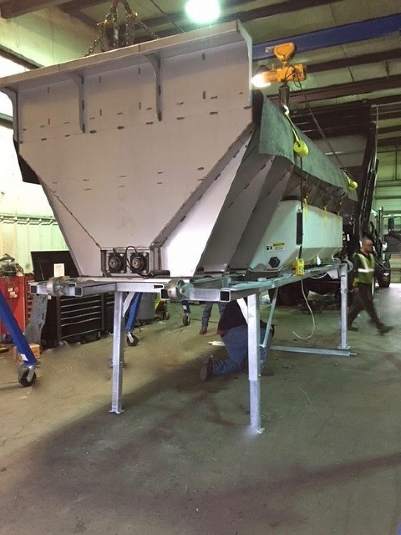 Viking Cives Midwest in Oran, MO, manufacturer of the stands, contacted their local galvanizer with a request to run samples. Since the stands were previously painted, the galvanizer provided input that was critical to modifying designs for proper galvanizing. Some components are outsourced to fabricators in other areas of the country. Utilizing the galvanizer's network of plants ensured Viking Cives received consistent service and a quality finished product throughout the country. During the process Viking Cives also took the opportunity to redesign some components, such as the stand legs, to make them less likely to seize up due to wear in the field. The wire mesh panels that are utilized for breaking up salt clumps during loading are also now galvanized.