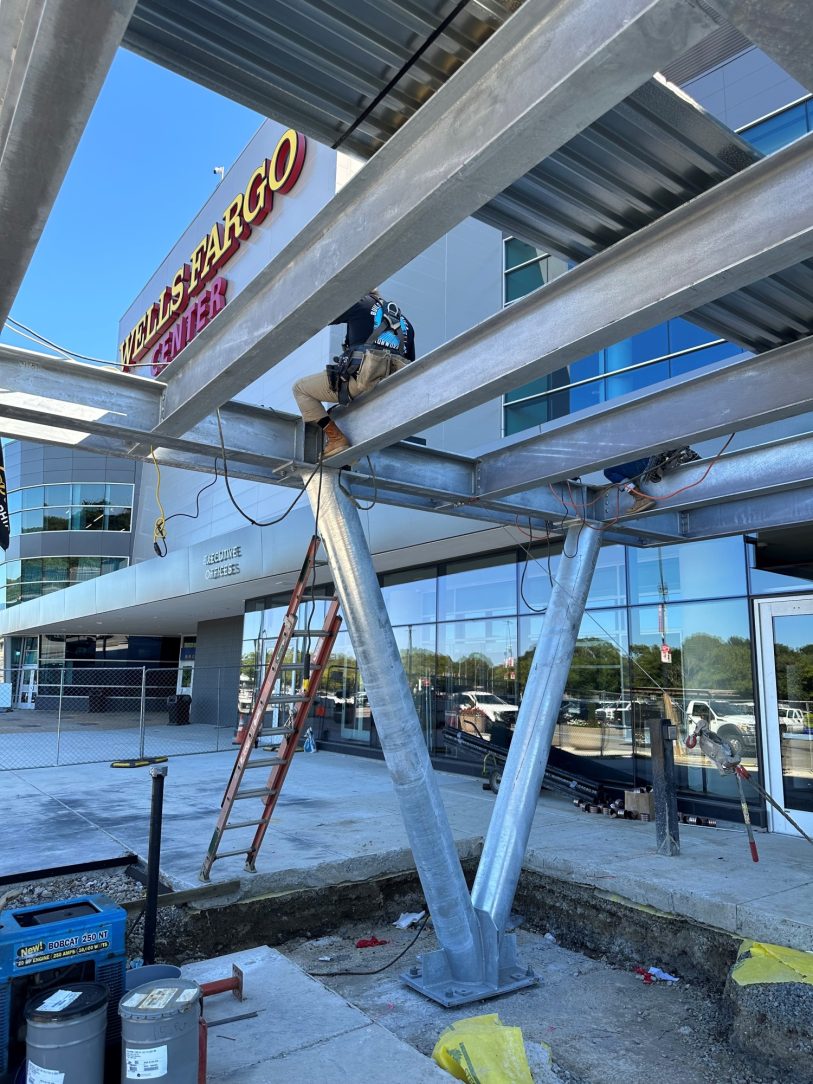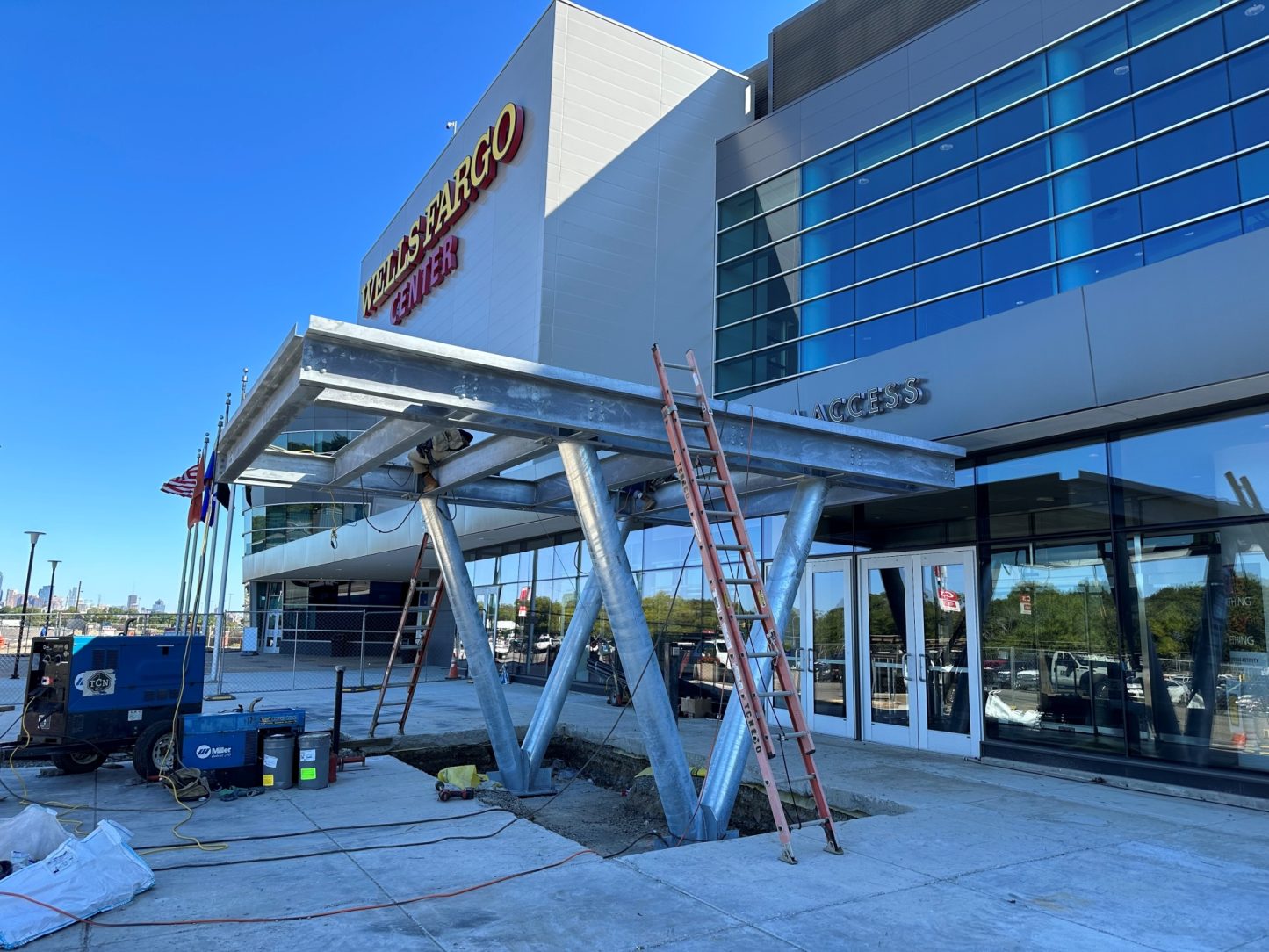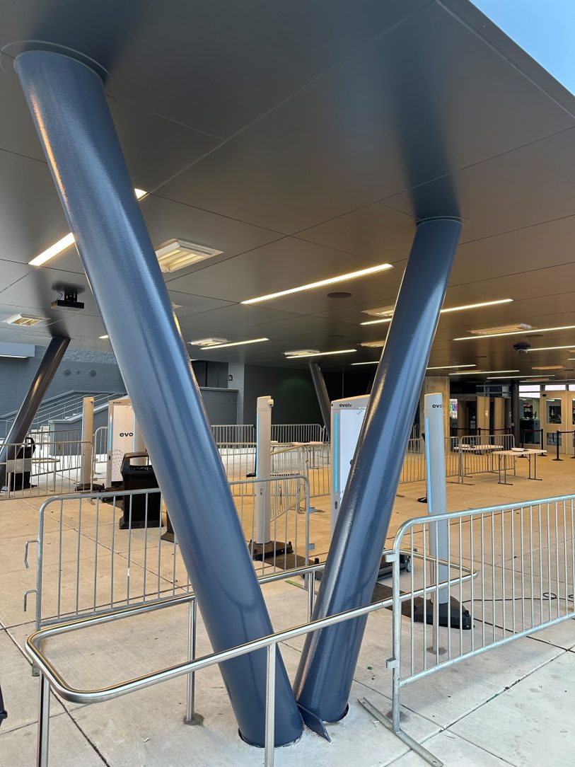 The new canopies are designed to make guest entry more comfortable and seamless. All canopies are now heated, programmed with audio so that fans can hear pre-game and play-by-play while entering the arena, and utilize touch-less security. Given the large diameter of the columns, there was discussion with the fabricator and the galvanizer on necessary hole size. The fabricator was able to make suggested changes, ensuring proper coating smoothness, which was essential for the in-field painter. This fabricator has worked on duplex systems for the same building in the past, so the decision to use a HDG duplex system again, was easy, due to the durability and life-cycle cost considerations.