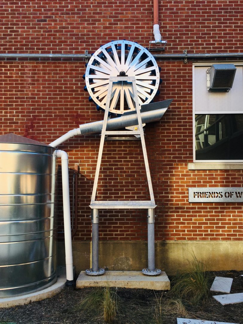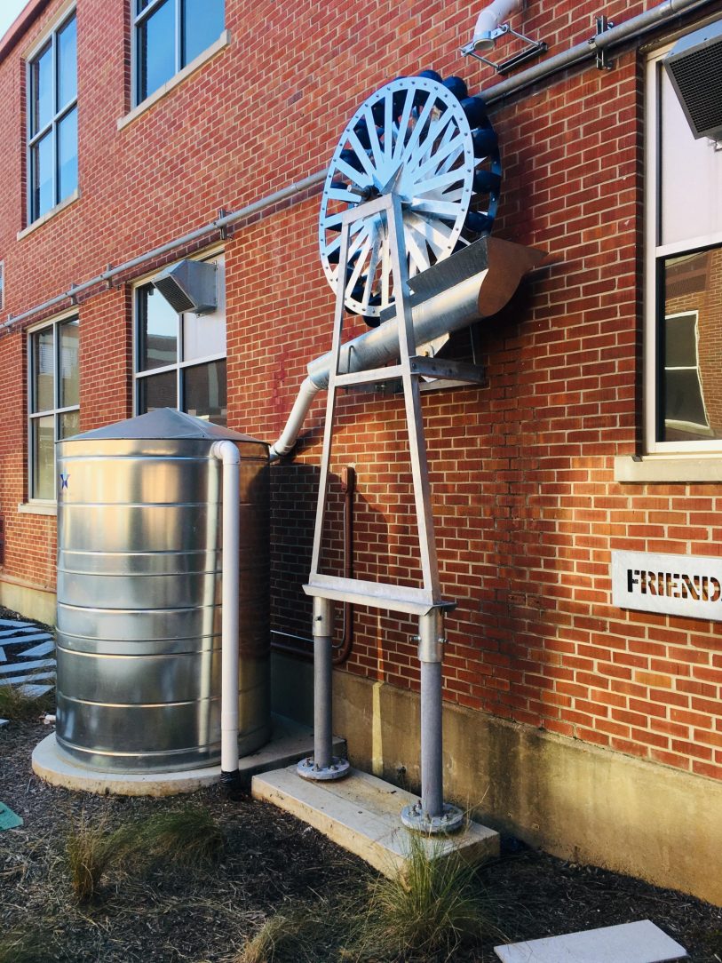 Local artist Elisha Gold was commissioned to create name placards, decorative triangular wall art, and a working water wheel for the project. Elisha decided to galvanize the steel for many reasons, including durability and a long lasting coating. Ultimately, the appearance of the hot dip galvanized coating provided the aesthetic he was looking for.