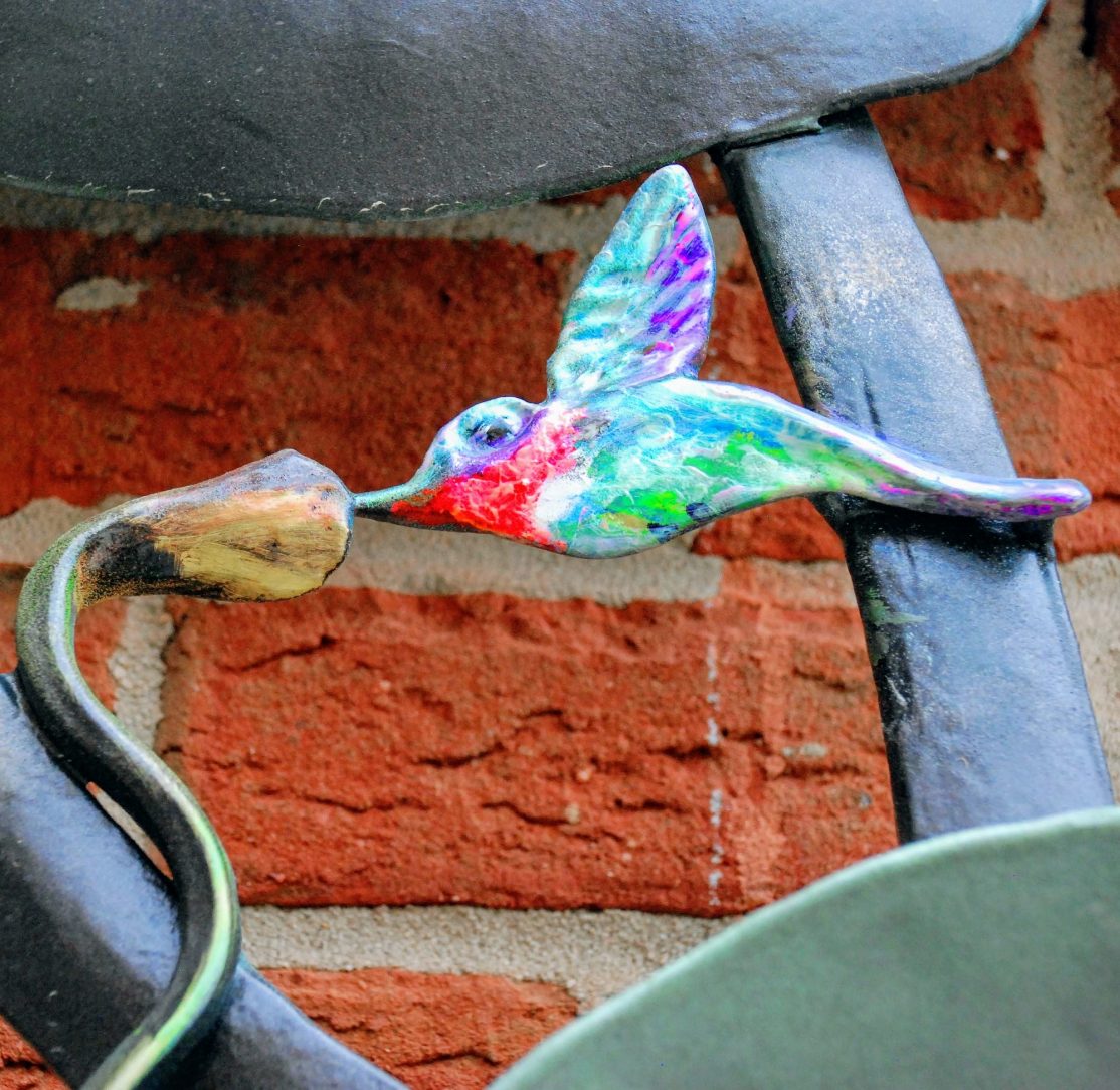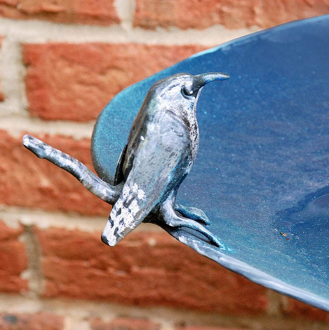 The focal point of the wall relief sculpture is a bright, hovering hummingbird and a stand alone bird basin resonating with the wall relief, designed to contain water without causing oxidation by virtue of its protective coating of hot-dip galvanizing.
