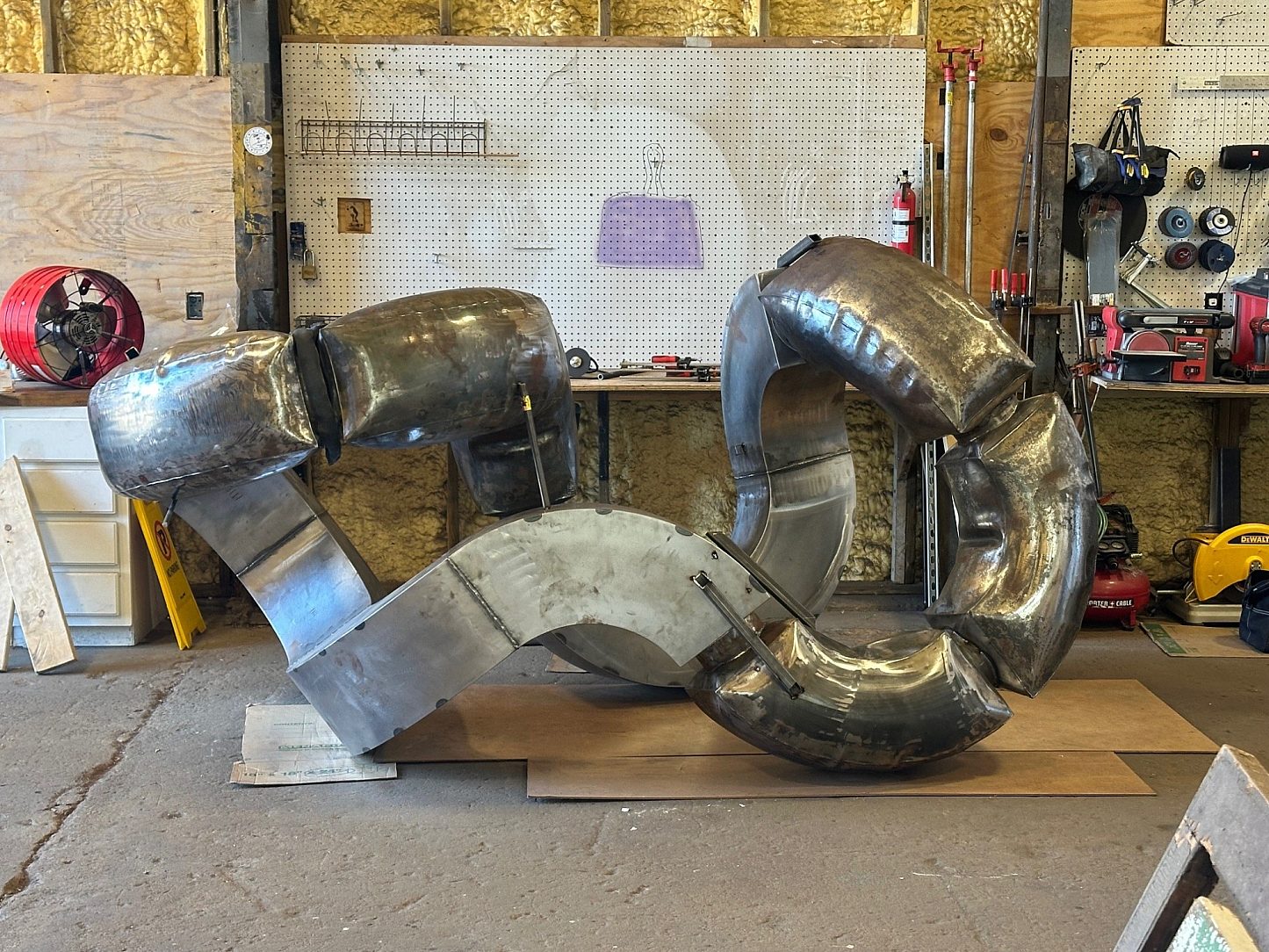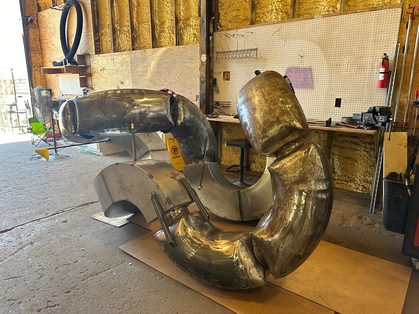 The sculpture’s signature inflated steel forms were created using Badham’s proprietary process, in which hollow steel components are heated in a ceramic kiln or glass annealer to approximately 1,300 degrees Fahrenheit – glowing orange and pliable – before being carefully expanded with compressed air. This technique produces geometry unlike any traditionally fabricated steel structure. The process challenges tolerance, introduces unpredictable change, and requires precision in fitting the inflated shapes together. Each form presents a new engineering puzzle, making structural reliability and surface protection essential.