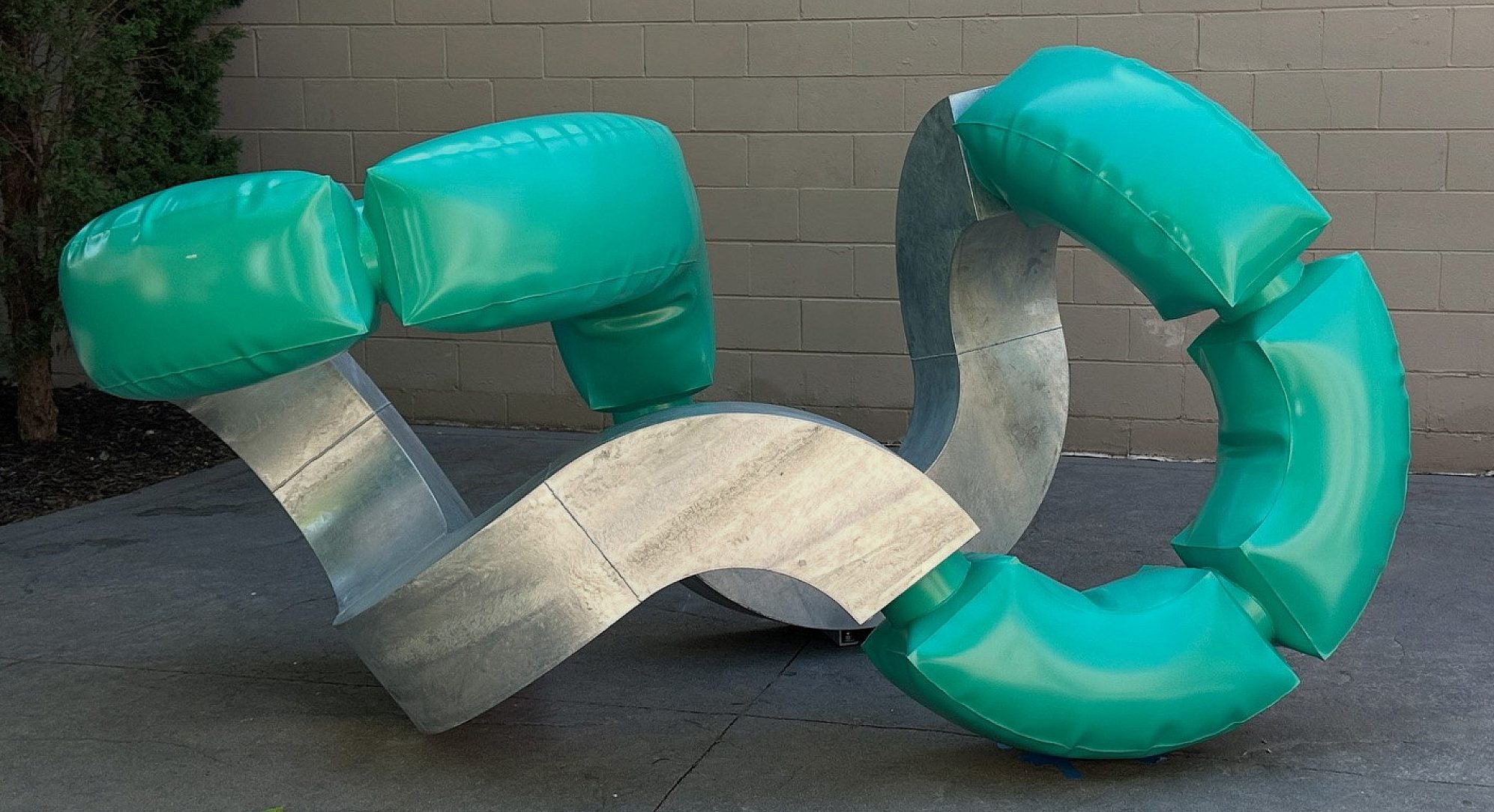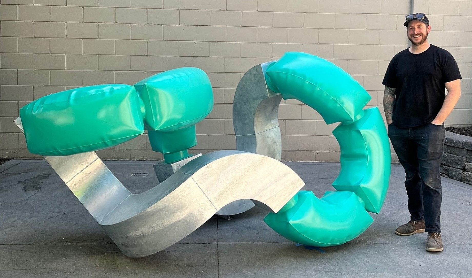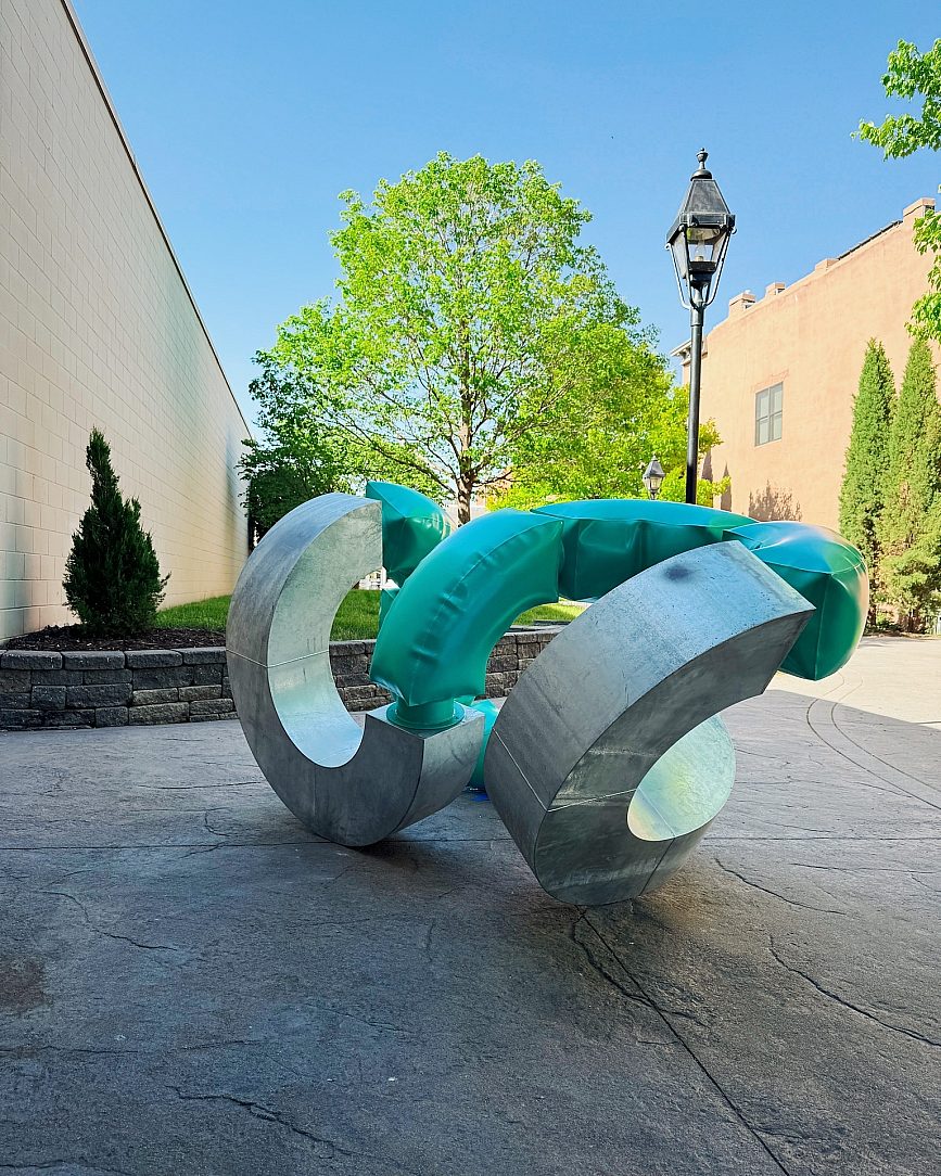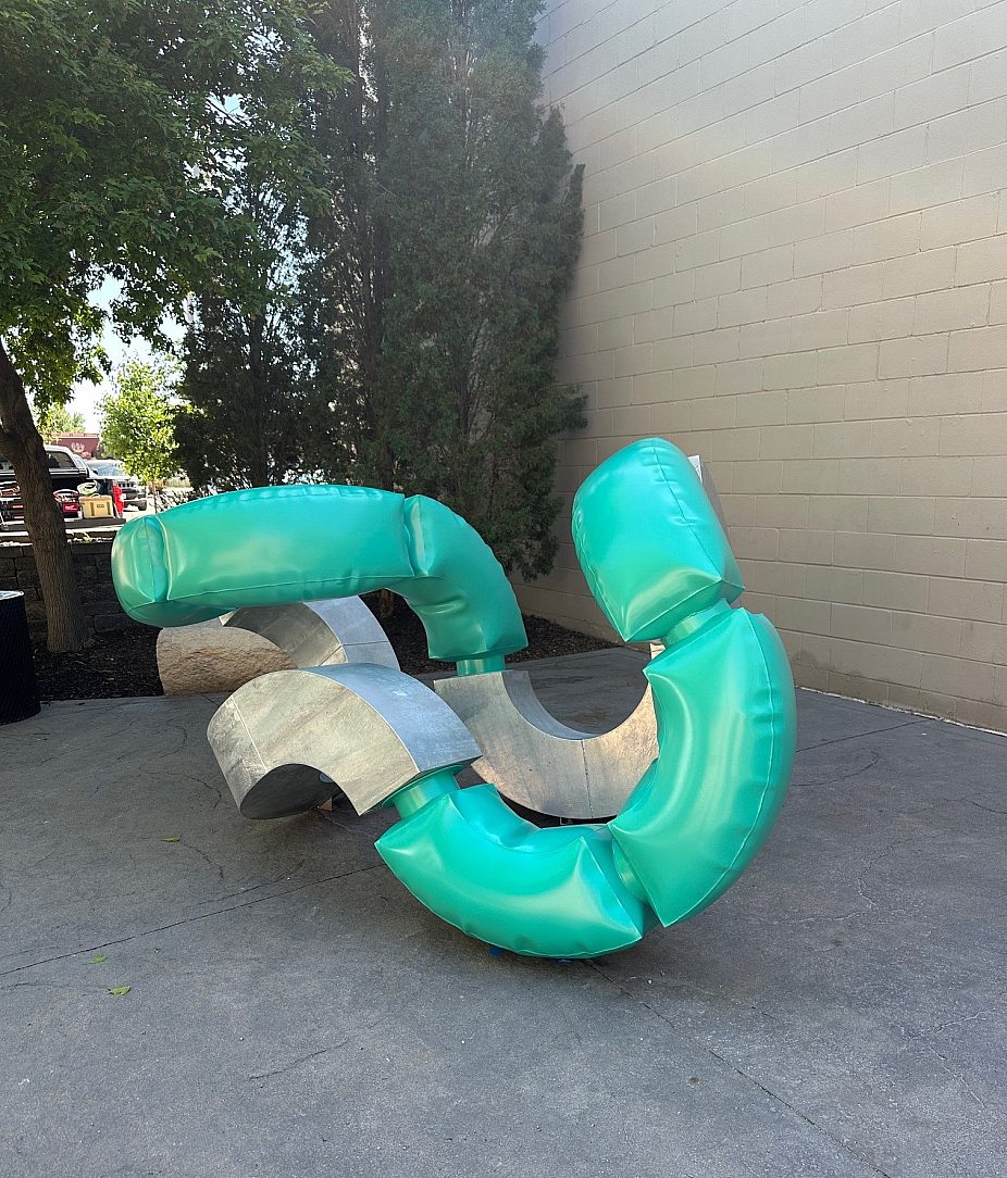 The final sculpture was painted in a distinctive teal that ties back to local manufacturing – specifically the iconic teal-green PVC pipe seen throughout the region – and echoes the movement of water central to pivot irrigation systems. The zinc finish also contributed to the sculpture’s visual composition, adding a bright, reflective base that countered the bold teal and emphasized the dimensionality of the inflated forms. With a footprint of roughly 5 feet by 5 feet and a length of 10.5 feet, Winder II is anchored with concealed hardware, creating the illusion that it floats lightly along the ground plane. Despite its delicate visual balance, the piece stands securely, its galvanized substrate guaranteeing long-term corrosion resistance and structural integrity.